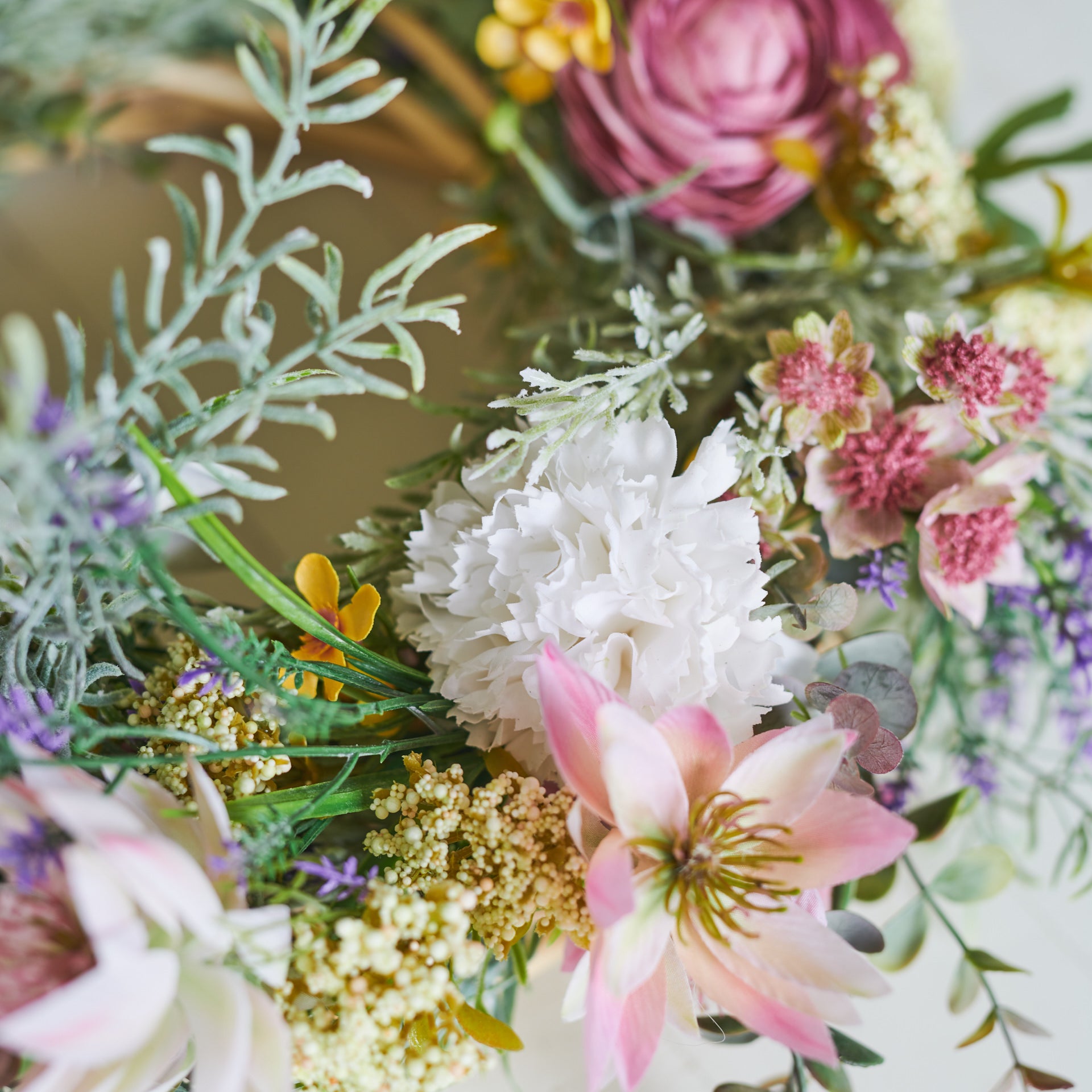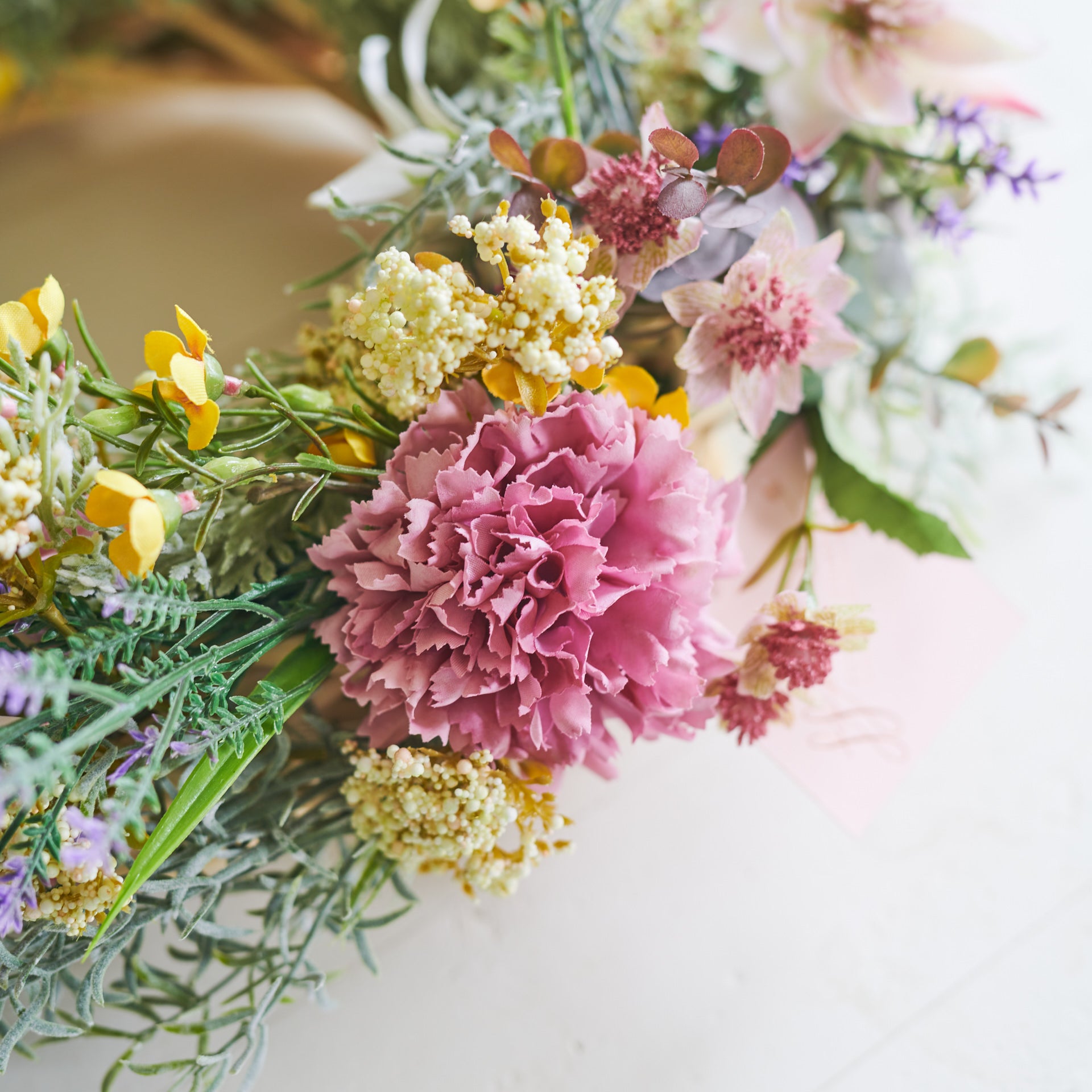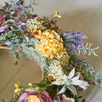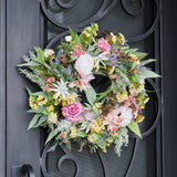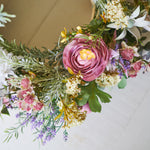 Handmade Wreath of Ranunculus, Carnation, Eucalyptus, Blushing Bride, Queen Annes Lace, Lavender, Flannel Flower and Wax Flower.