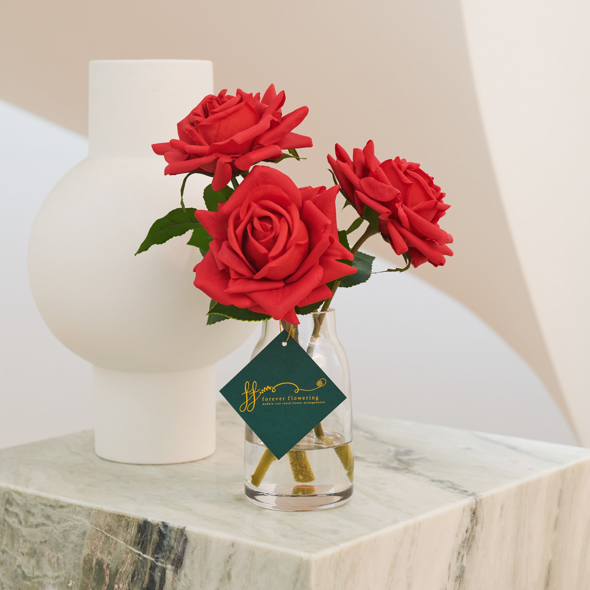 A classic arrangement featuring our Signature Real Touch Roses permanently set in Glass Vase in Artificial Water.
