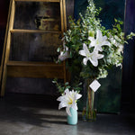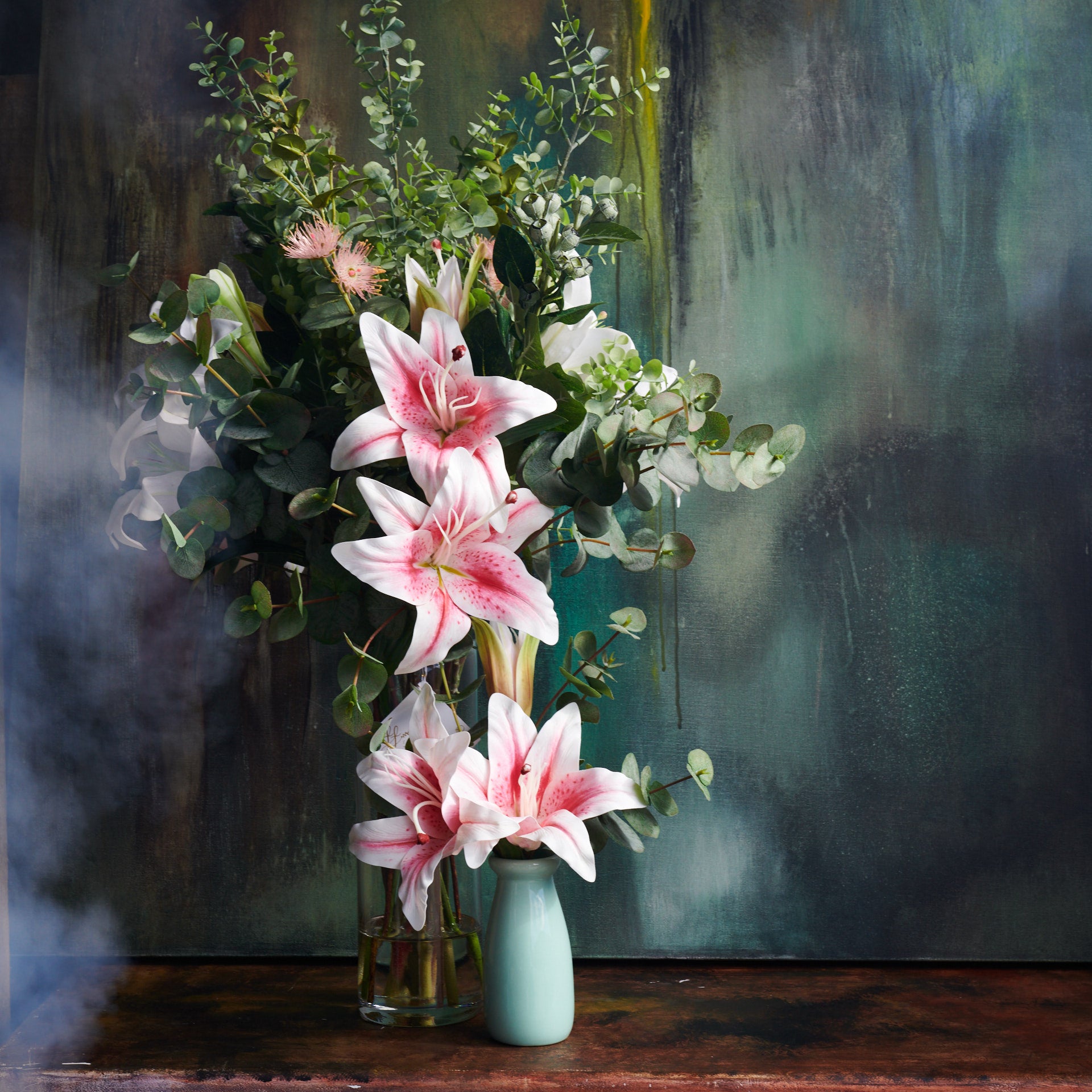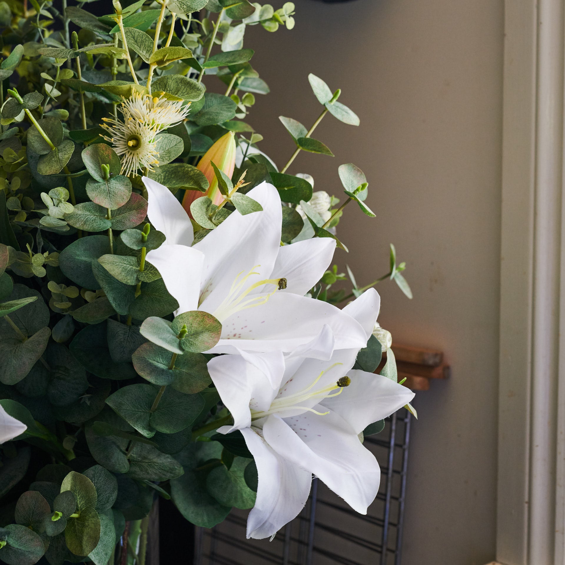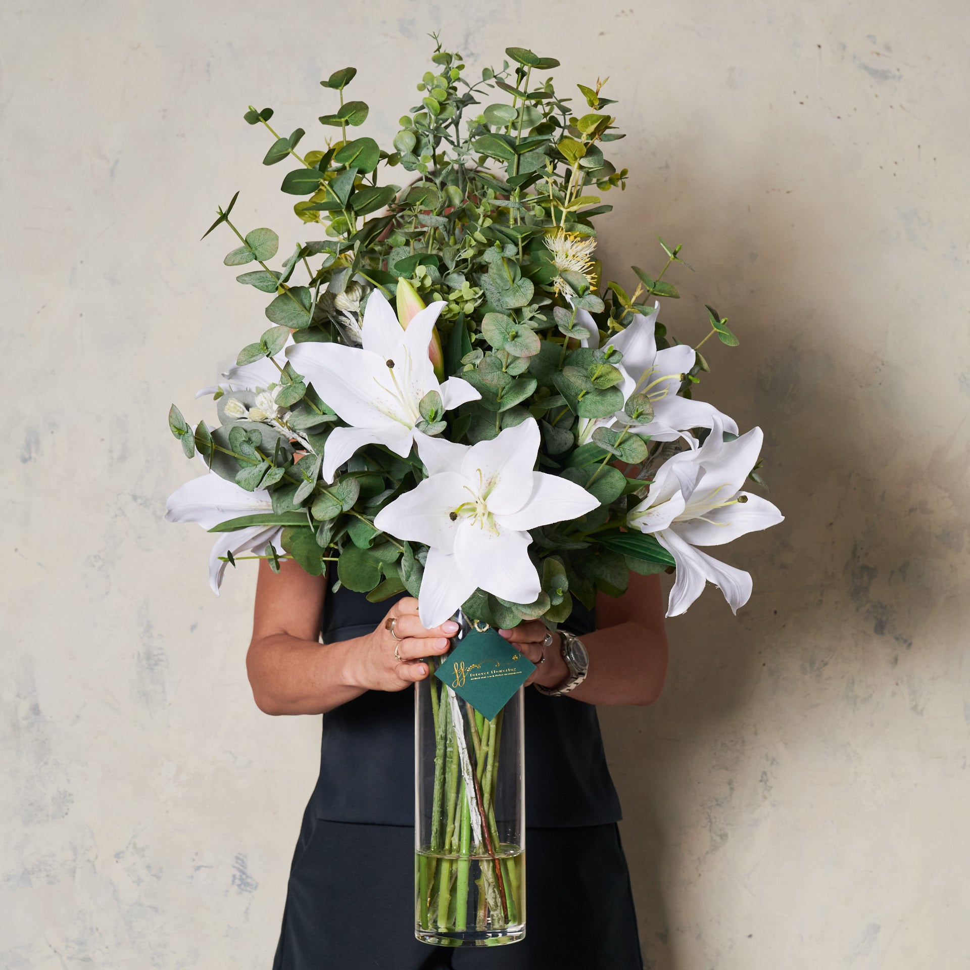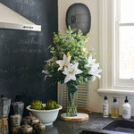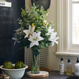 Real Touch Casablanca Lilies, Eucalyptus Silver Dollar, Mini Gum Eucalyptus Leaf, Tetragona Gum Nuts and Eucalyptus Gum Blossom Spray in Cylinder Vase in Artificial Water. This is a 360 degree flower arrangement.