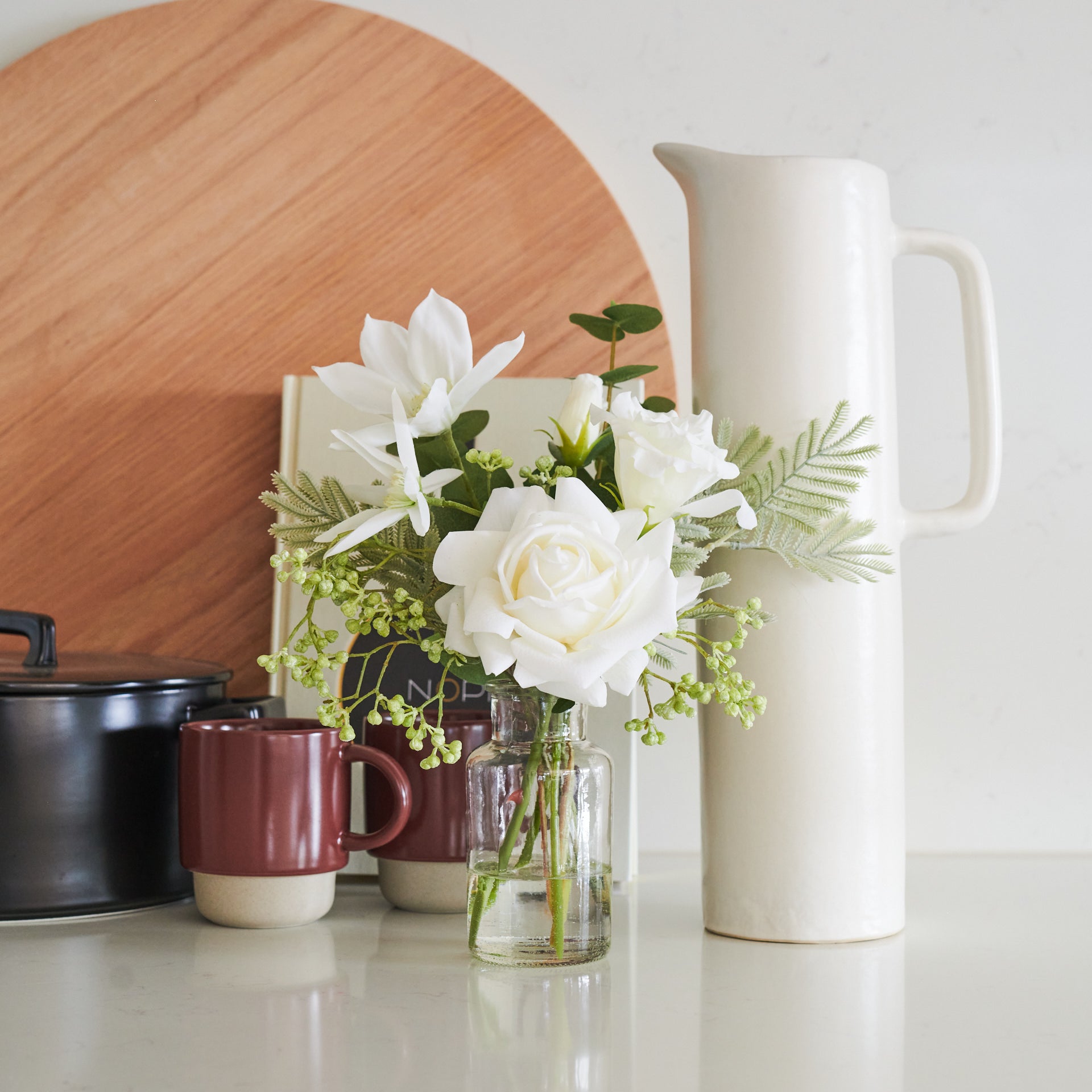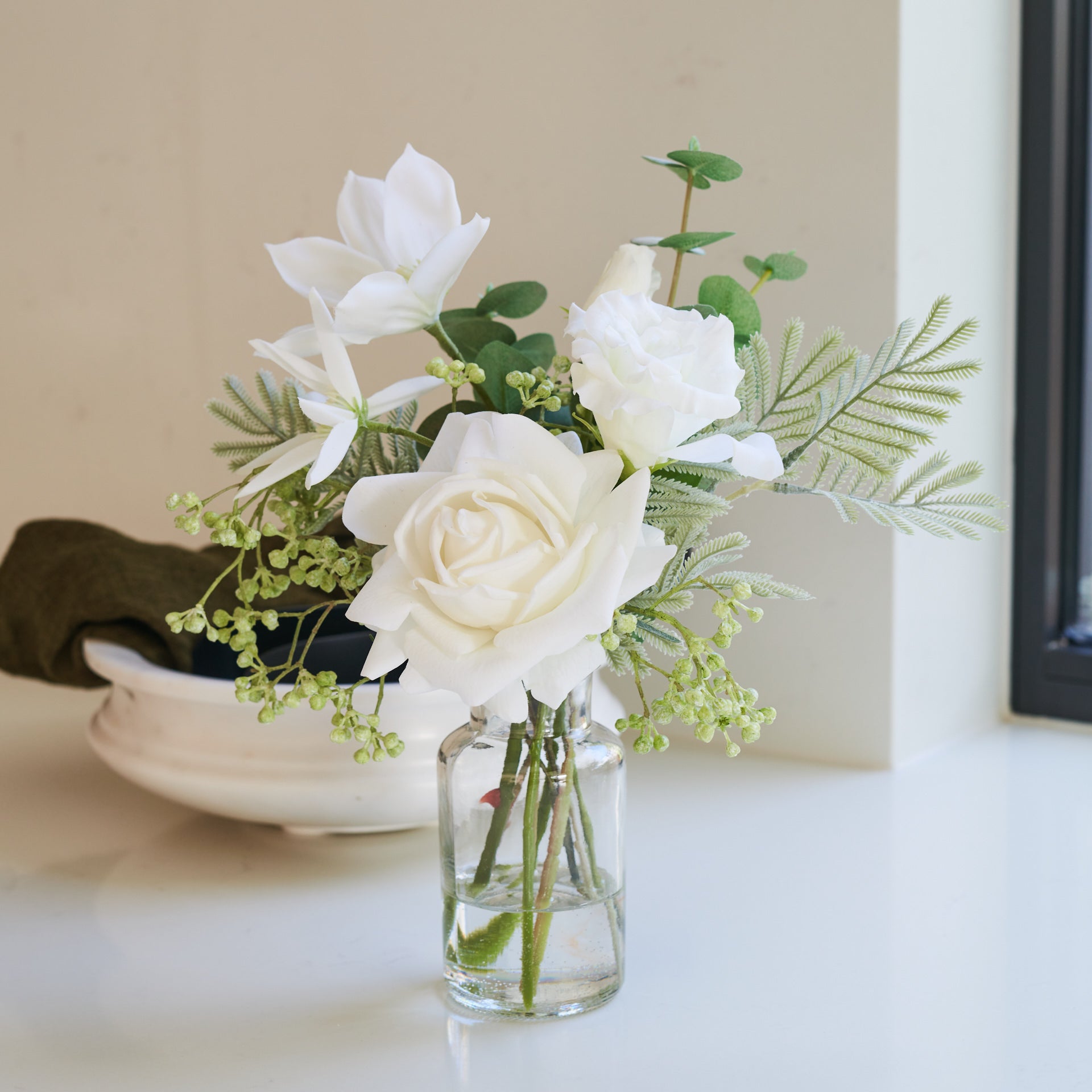 Real Touch Eucalyptus, Rose and Clematis Arrangement set in a Glass Vase with Artificial Water.