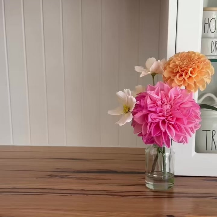 Vibrant real touch cosmo and pom dahlias set in artificial water in a glass vase.