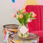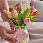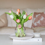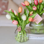Real Touch Artificial Tulips permanently set in artificial water in a glass vase.