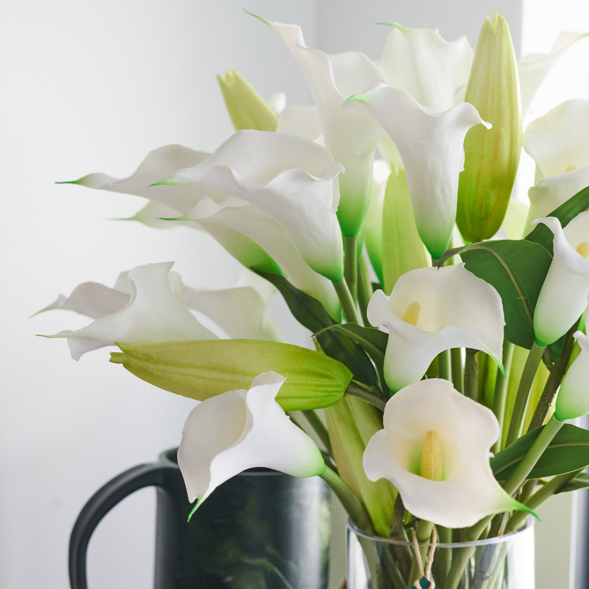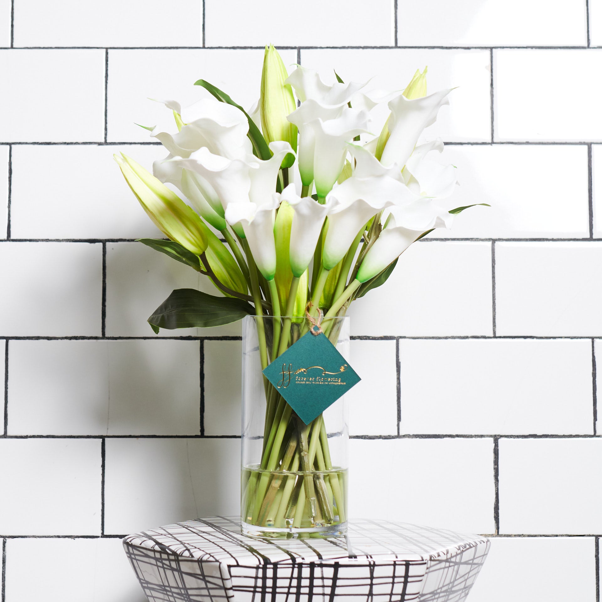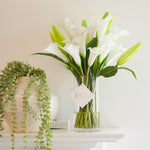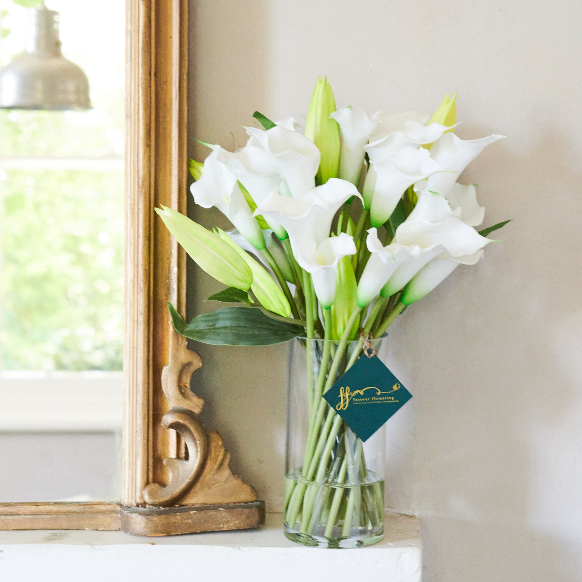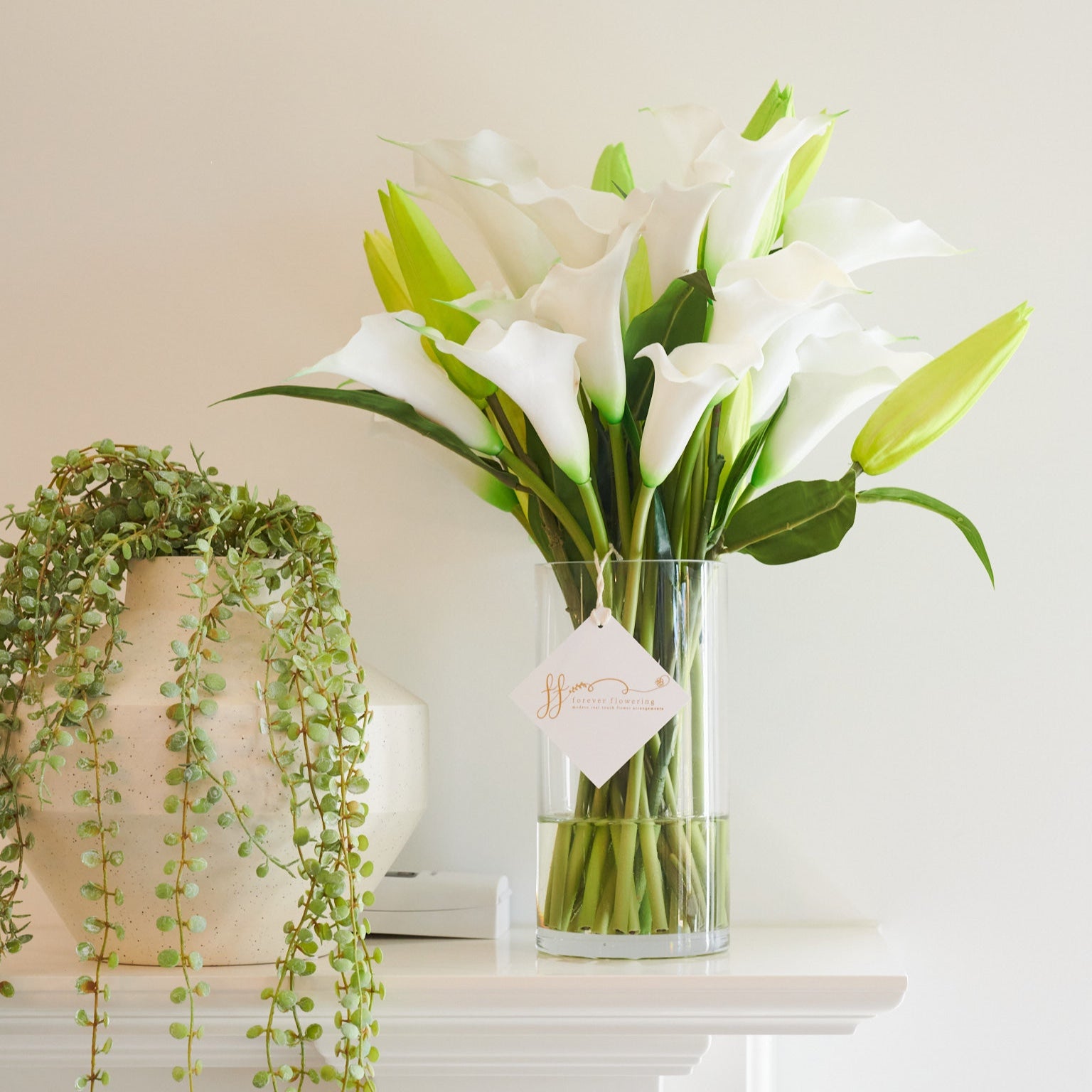 Real Touch Calla Lilies and Buds Flower Arrangement permanently set in a cylinder vase permanently set in artificial water.