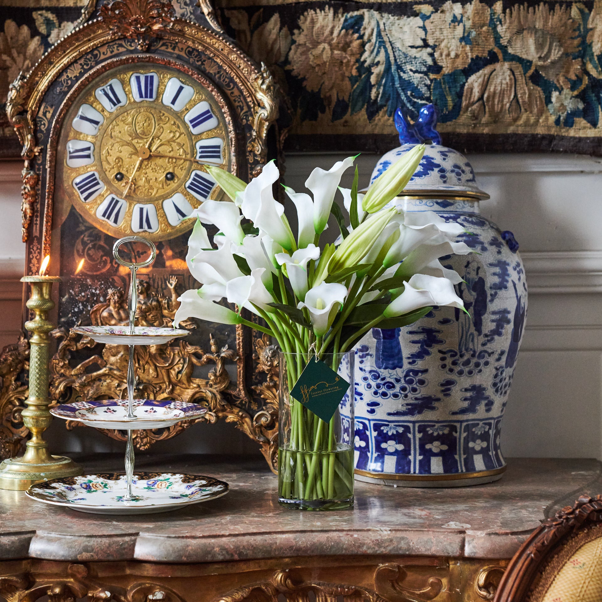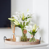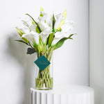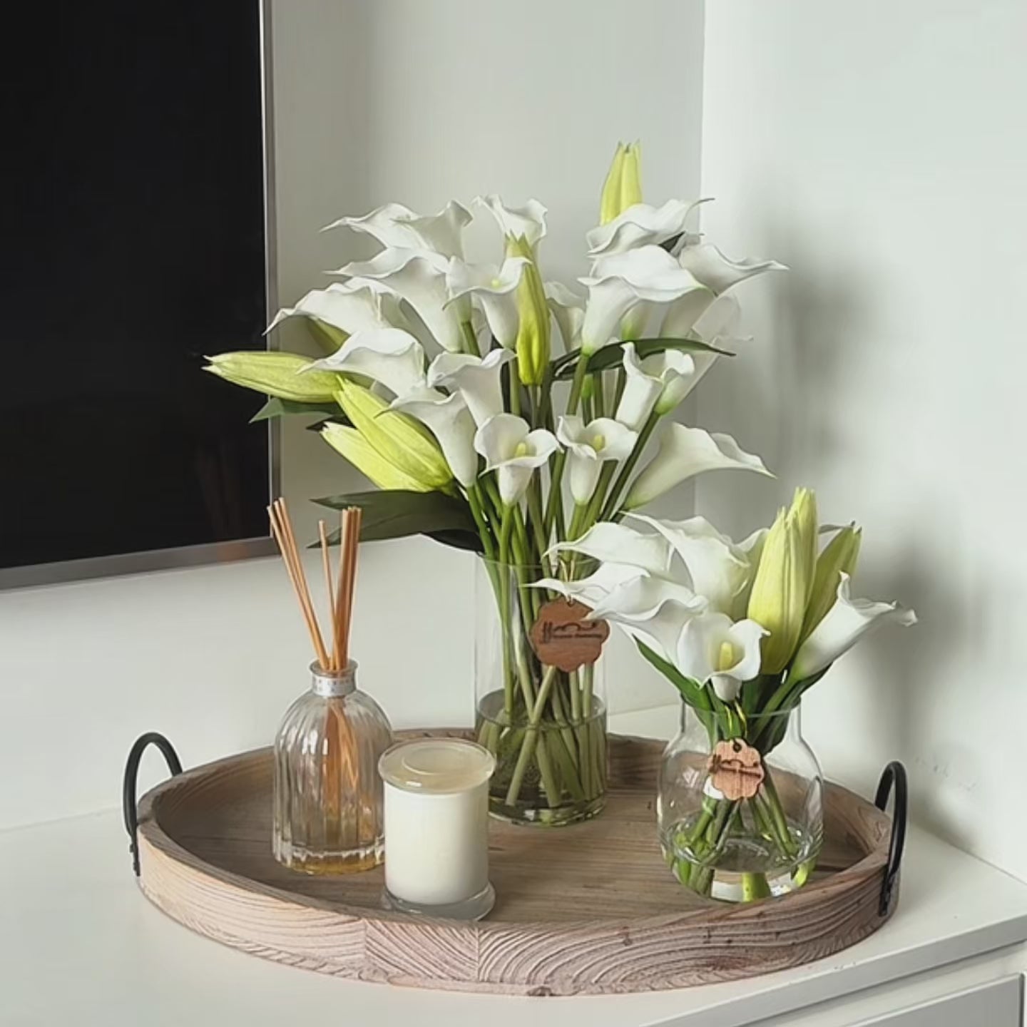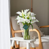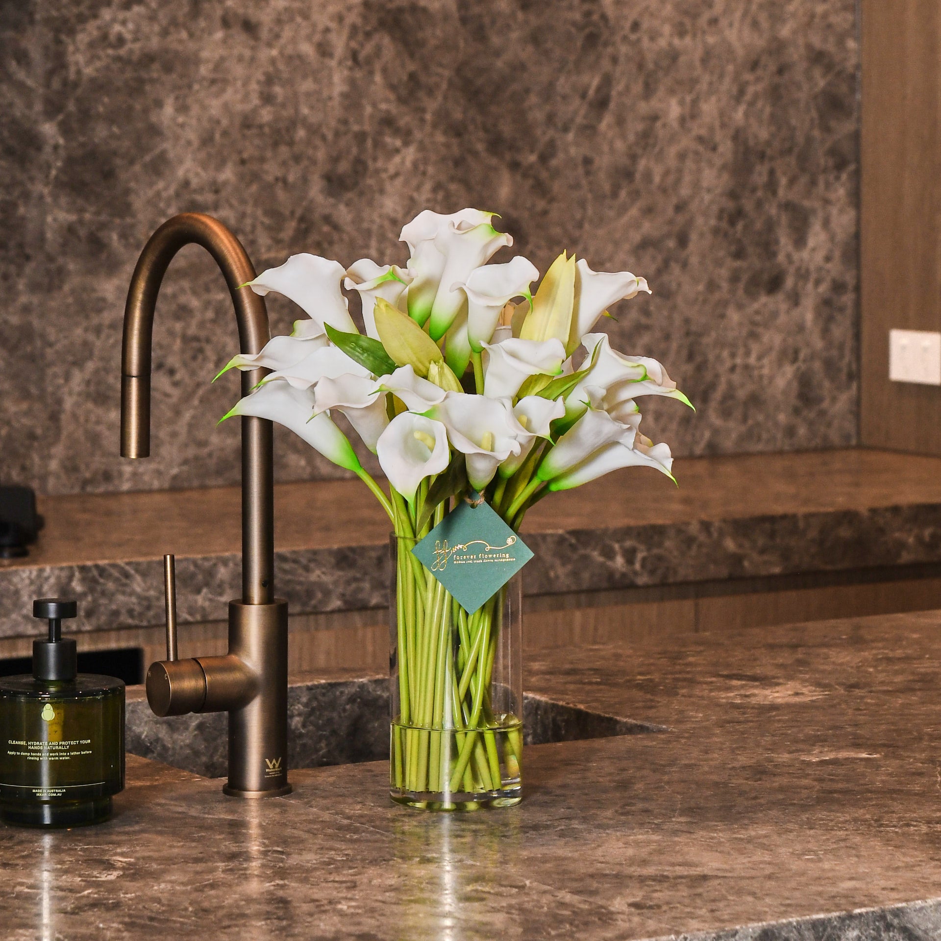 Real Touch Calla Lilies and Buds Flower Arrangement permanently set in a cylinder vase permanently set in artificial water.