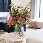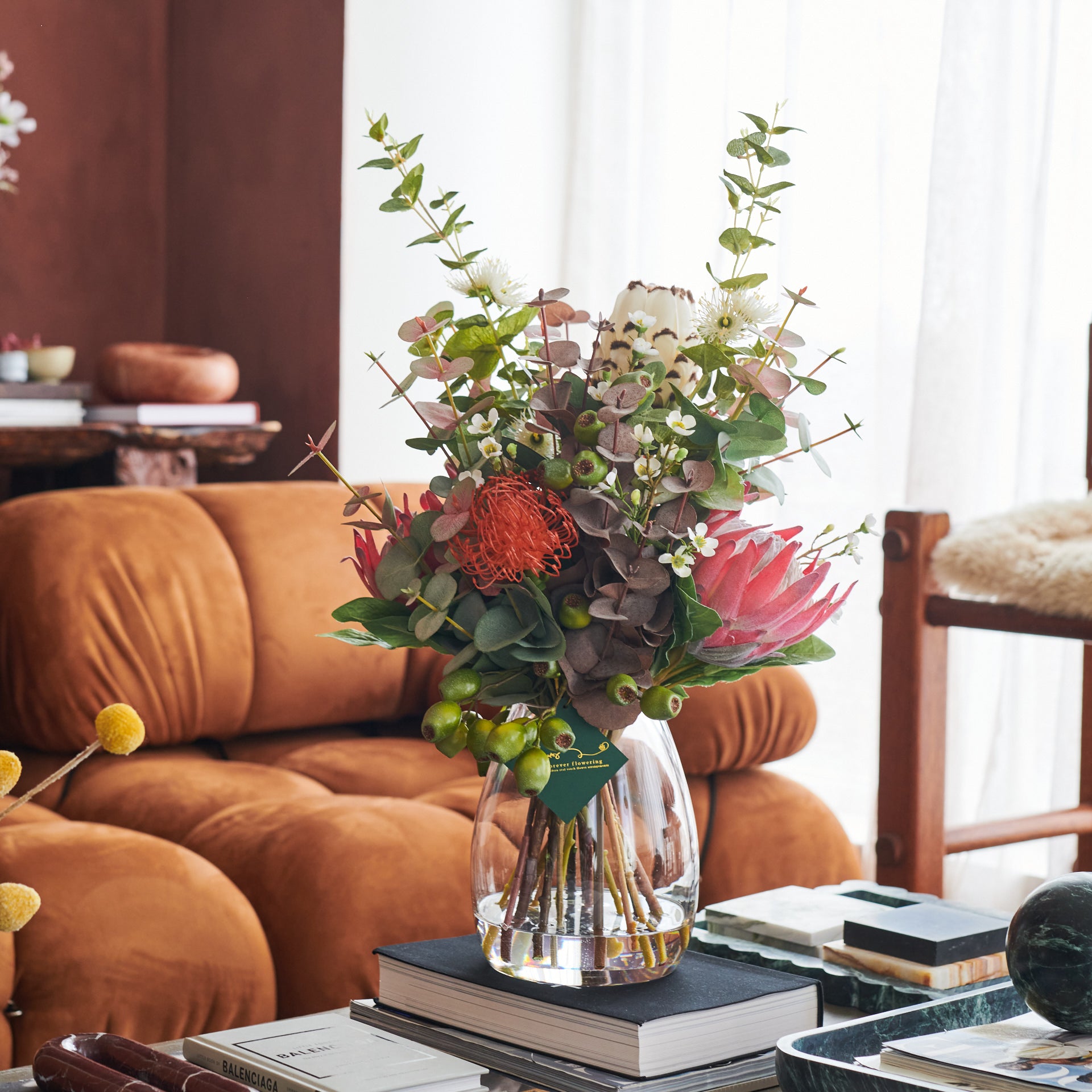 Real Touch Artificial Protea, Gum Nuts, Eucalyptus Leaves, Blossom Flower, Leucosperum Pin Cushion and Wax Flower spray in Belly Vase and Artificial Water. 360 degree arrangement.