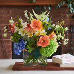 Real Touch Hydrangea, Frangipani and Star Flower with Heliconia, Hibiscus, Echinacea and Delphinium permanently set in Glass Rectangle Vase in Artificial Water.