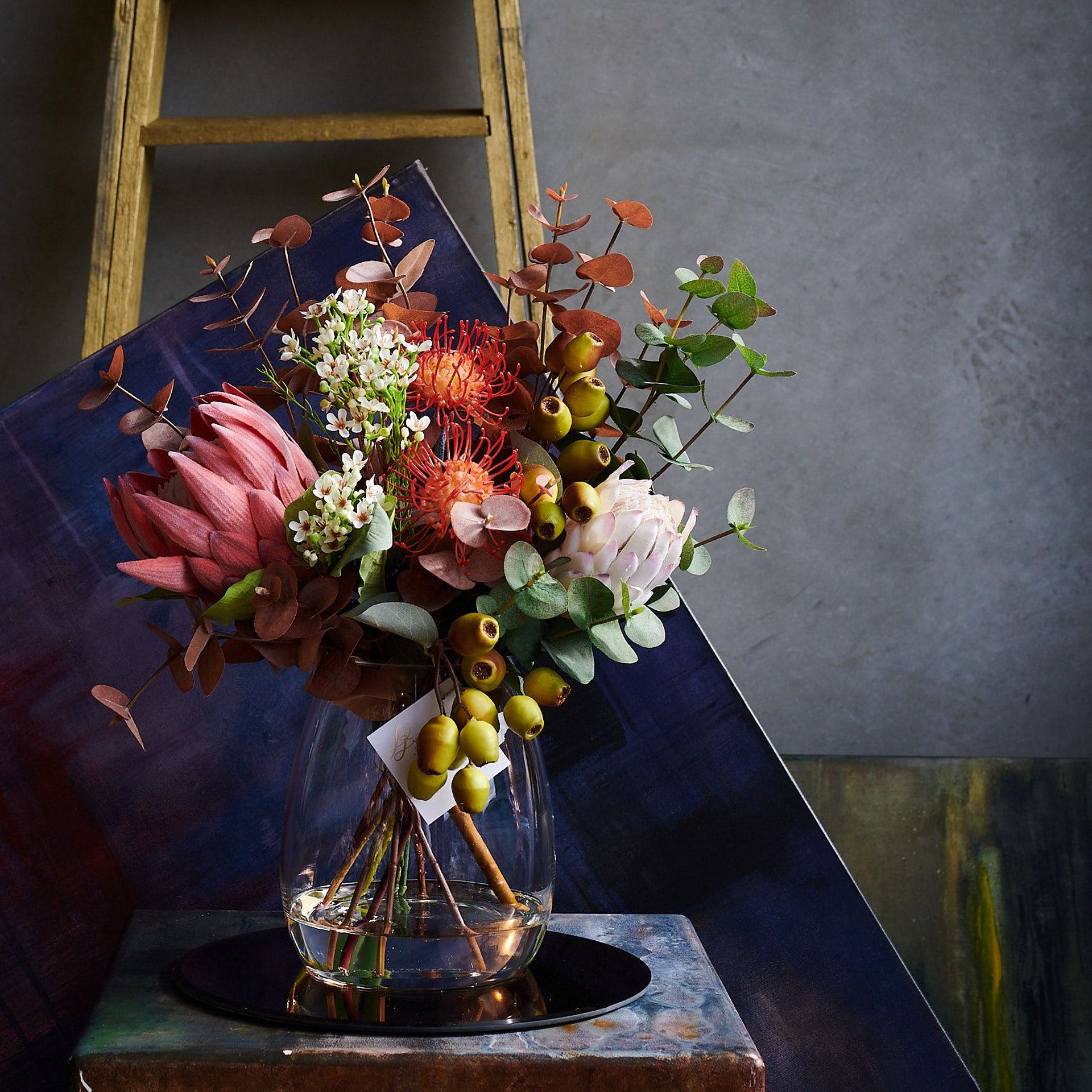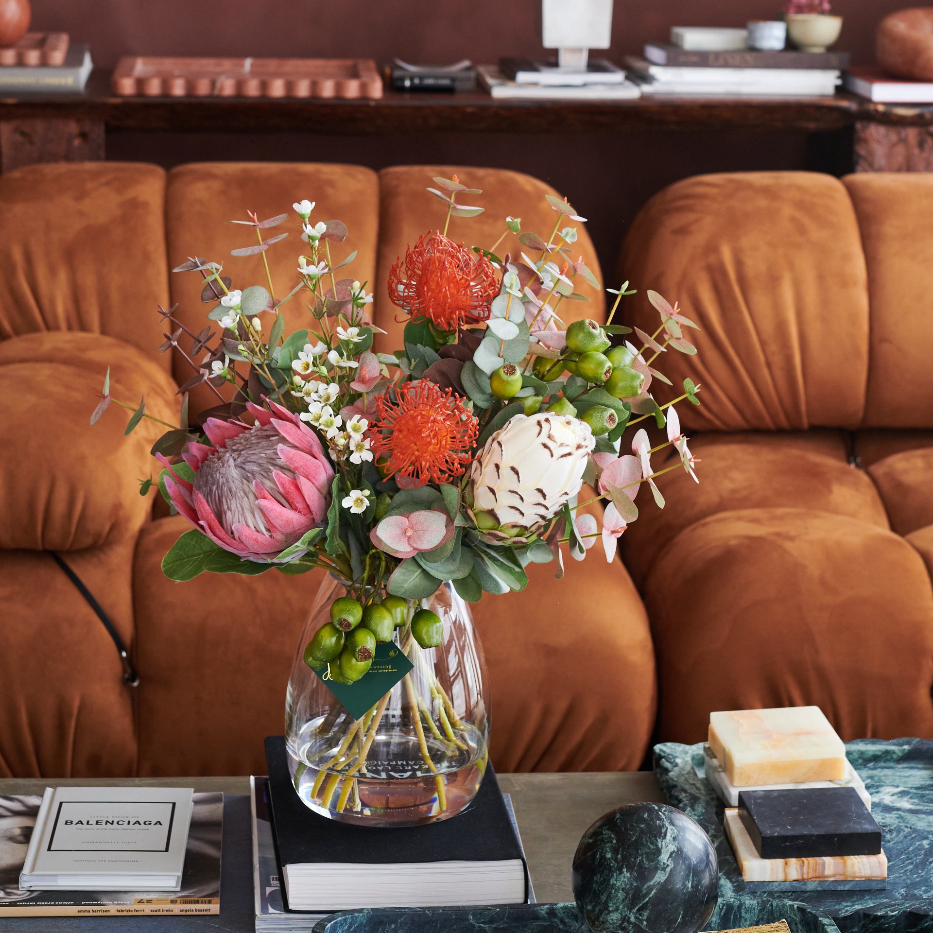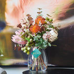 Real Touch Proteas, Gum Nuts, Eucalyptus Leaves, Leucosperum Pin Cushion and Wax Flower spray in Belly Vase set in Artificial Water