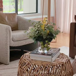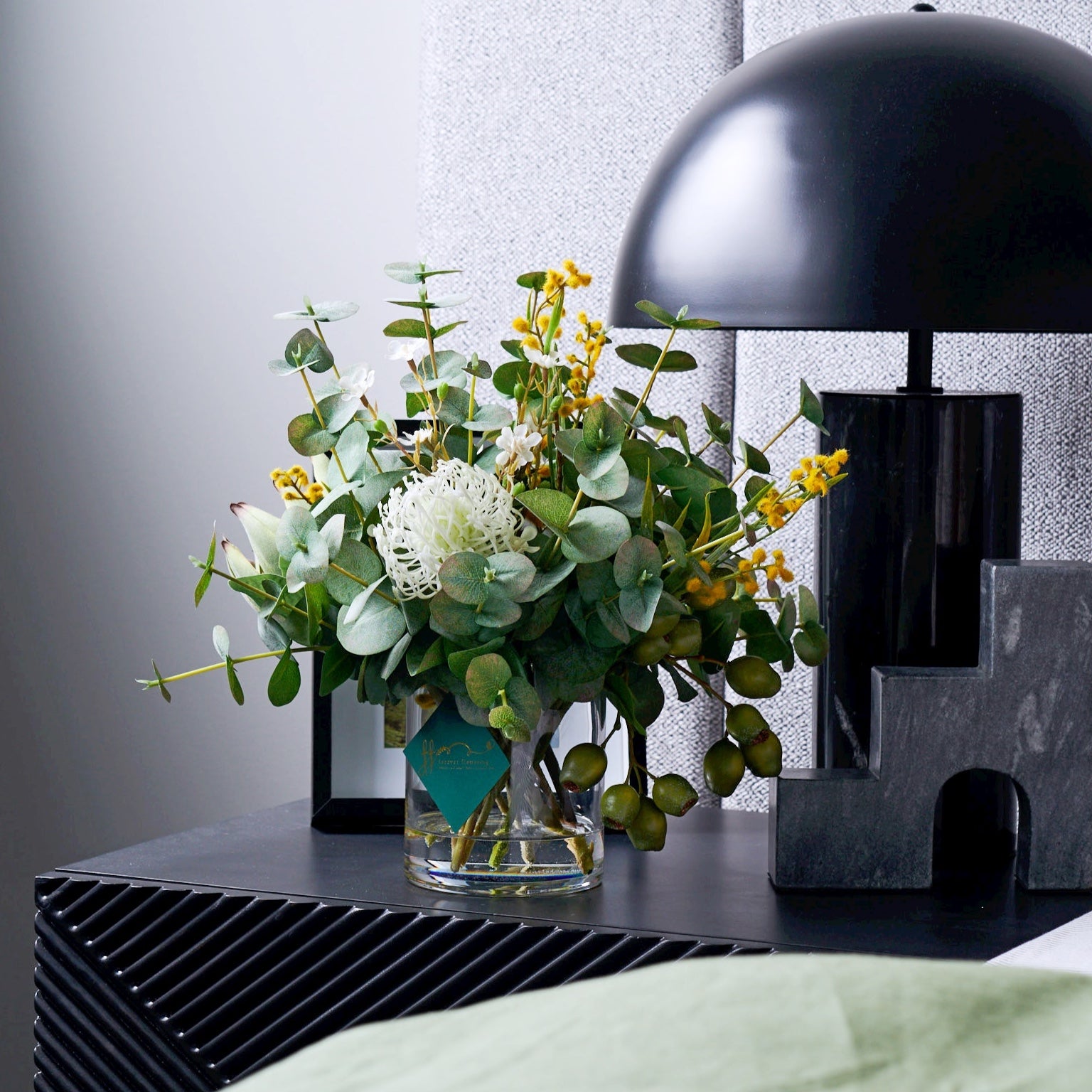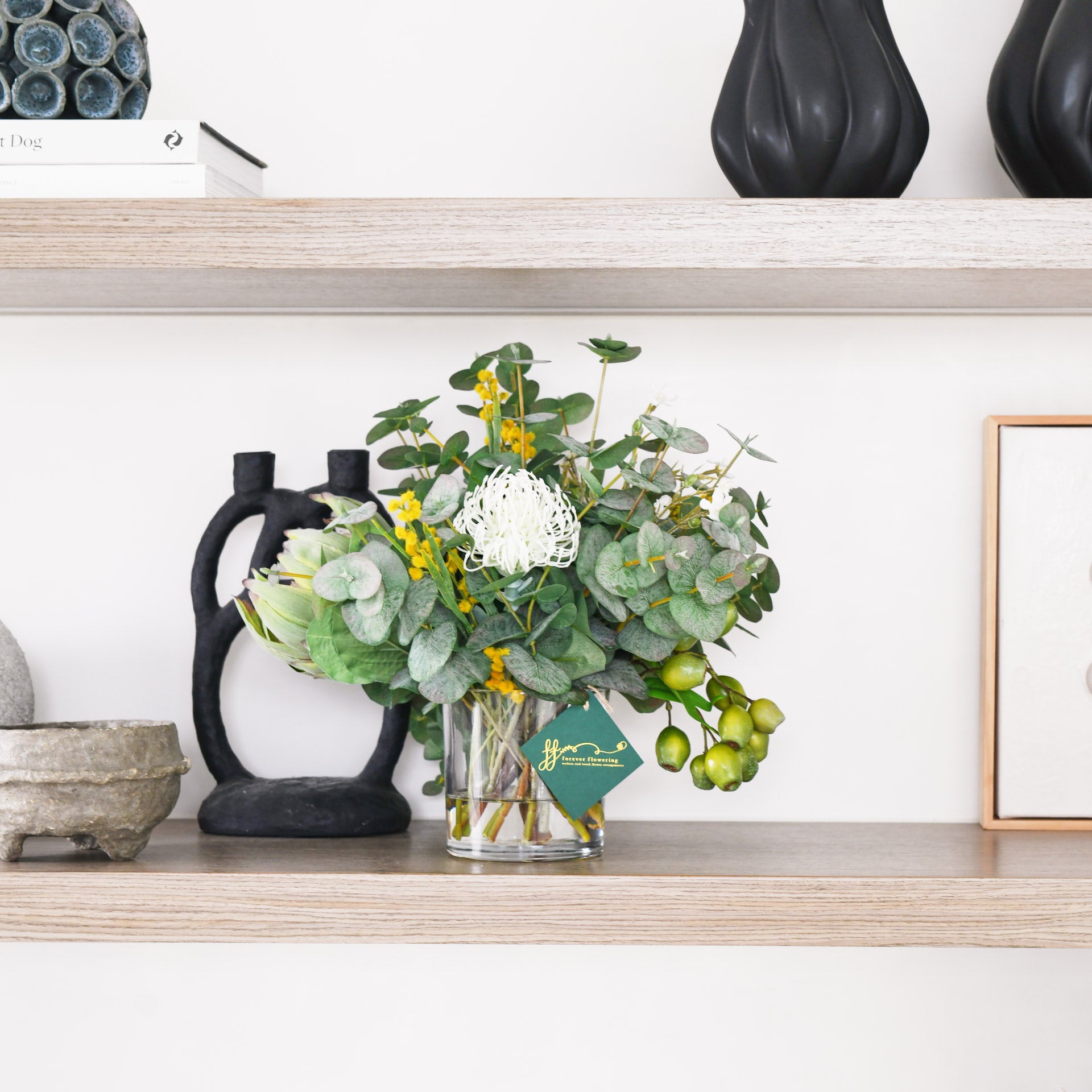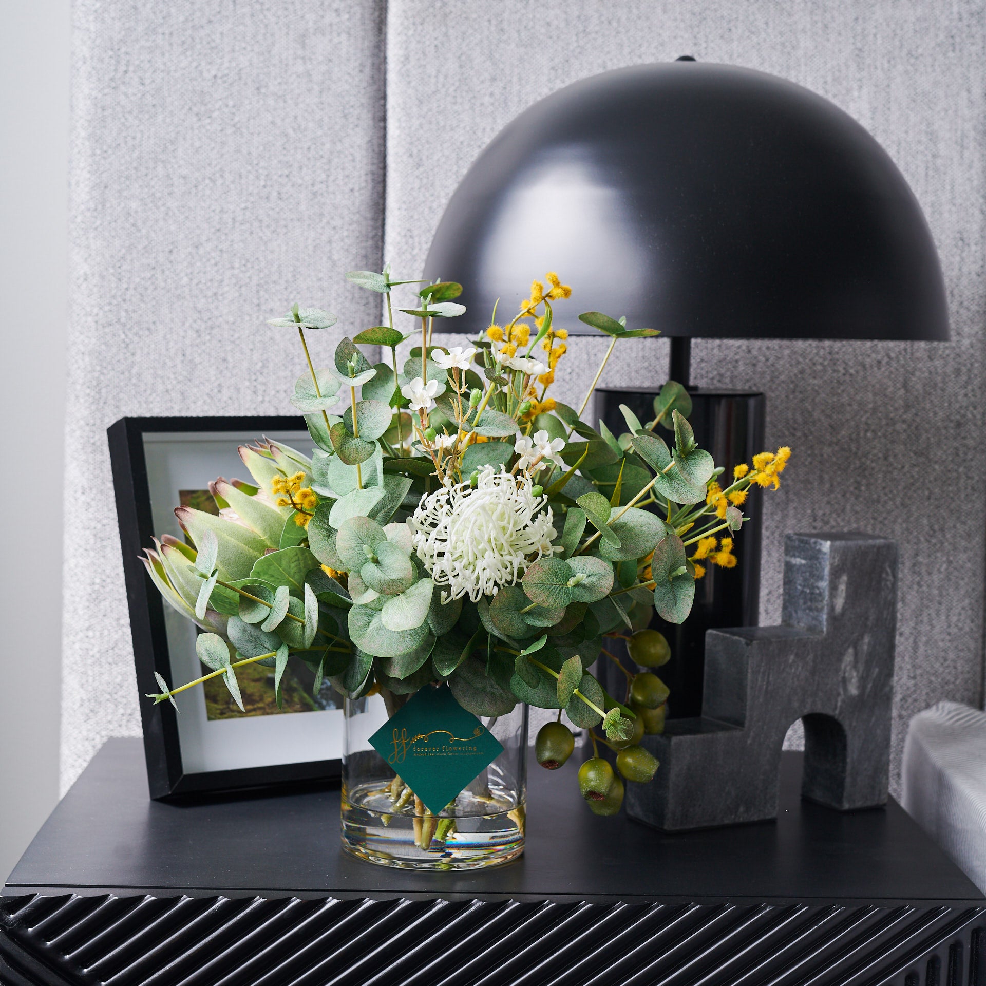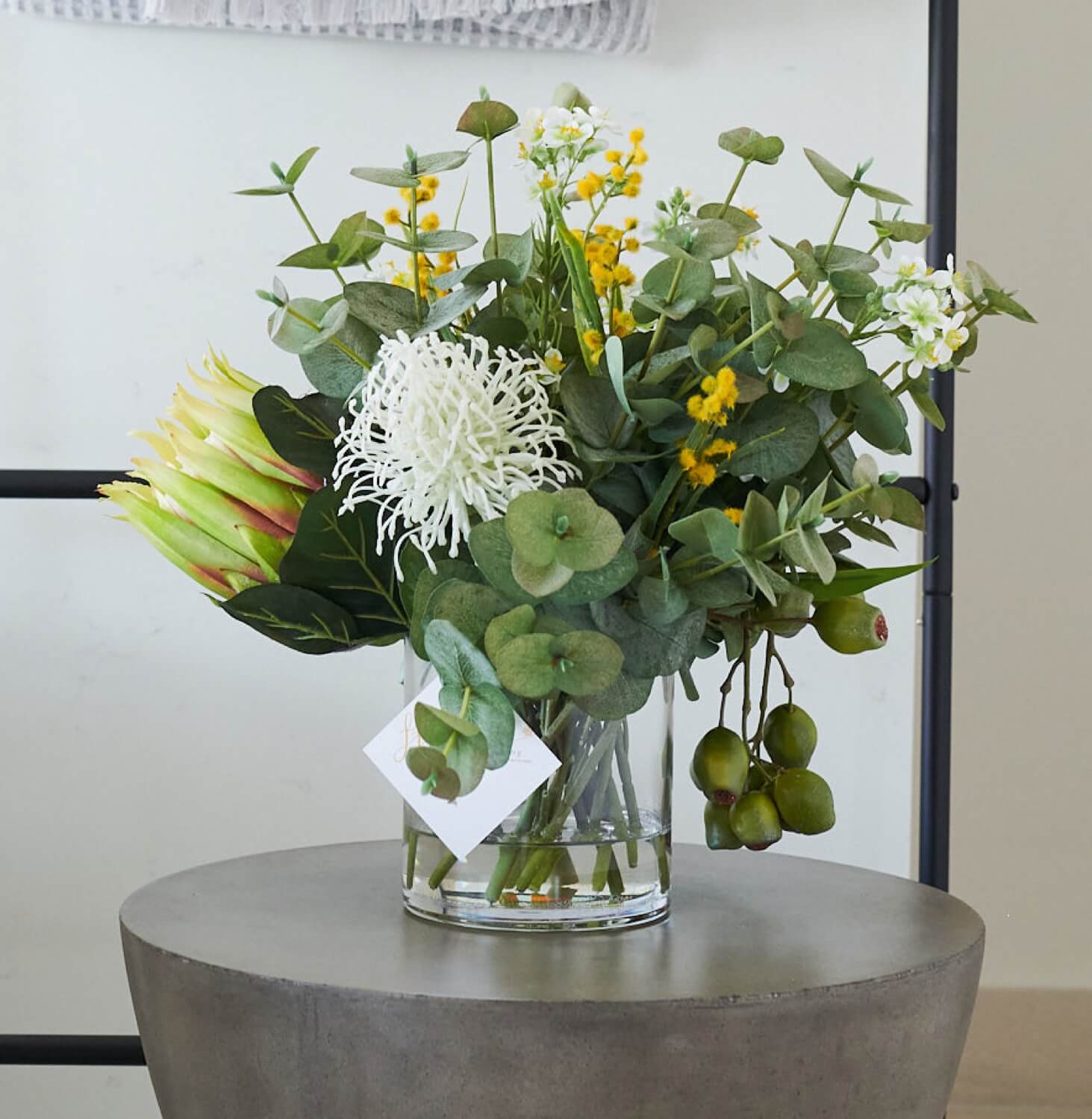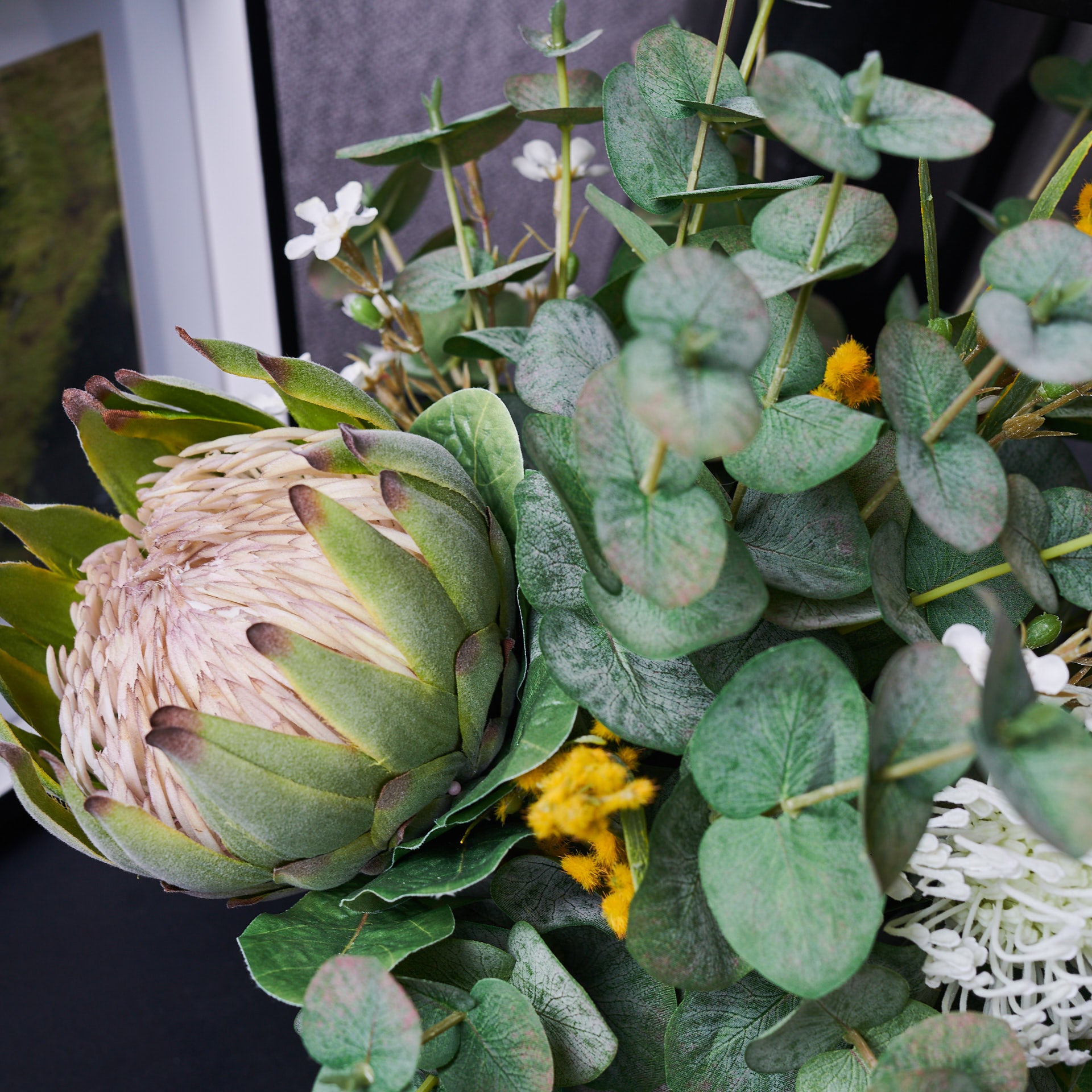 Real Touch King Protea, Gum Nuts, Mimosa Wattle, Leucosperum Pin Cushion and Eucalyptus Leaf Spray set in Cylinder Vase and Artificial Water