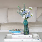 Real Touch Spinning Gum, mini Ranunculus and Astrantia set in Artificial Water in glass vase.
