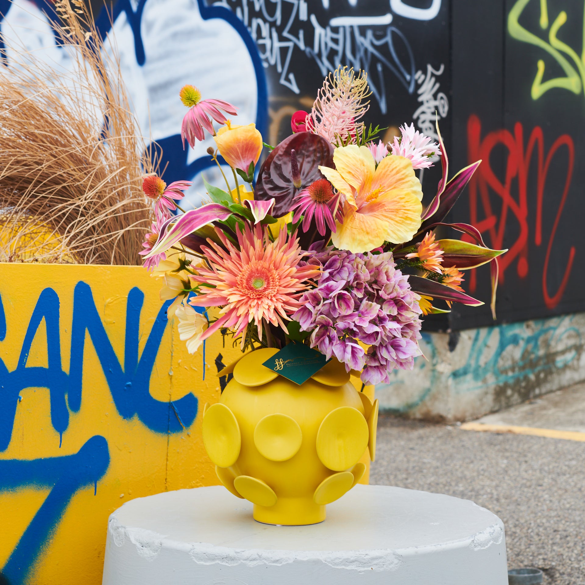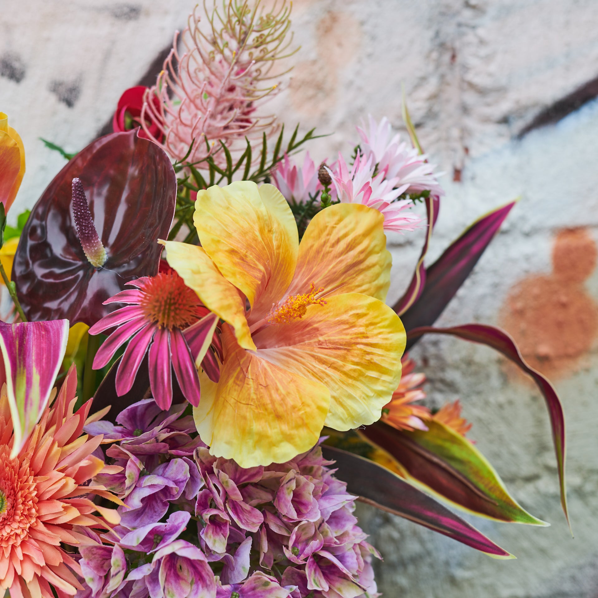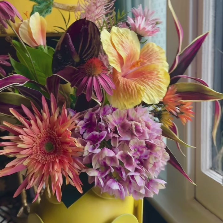 A bold combination of Gerbera, Hydrangea, Hibiscus, Anthurium and Grevillea, with Echinacea and Cosmo set in a Limited Bold Yellow Vase in Artificial Water. This is a 360’ Arrangement.