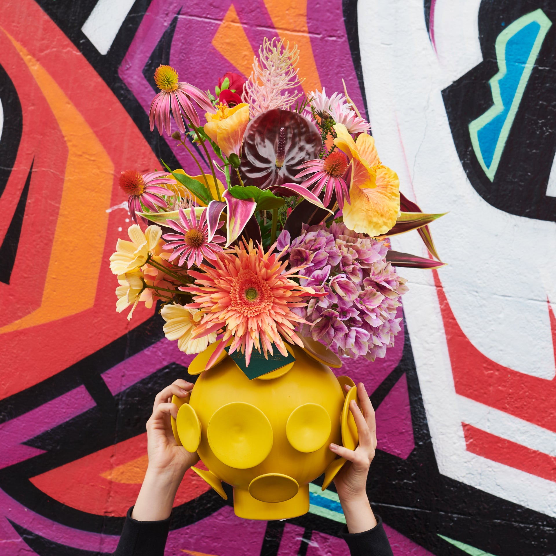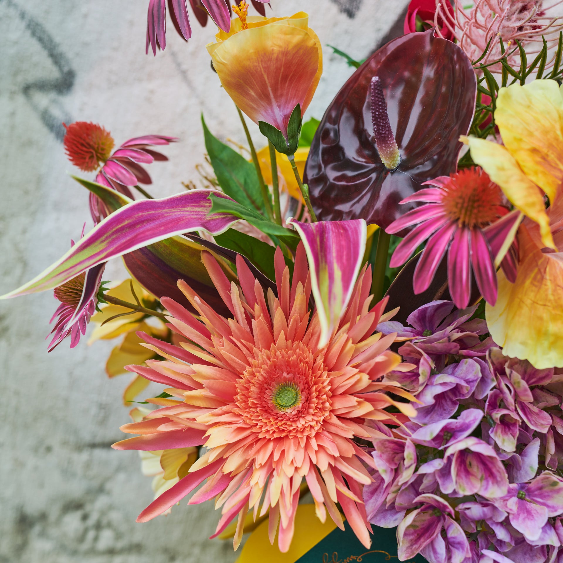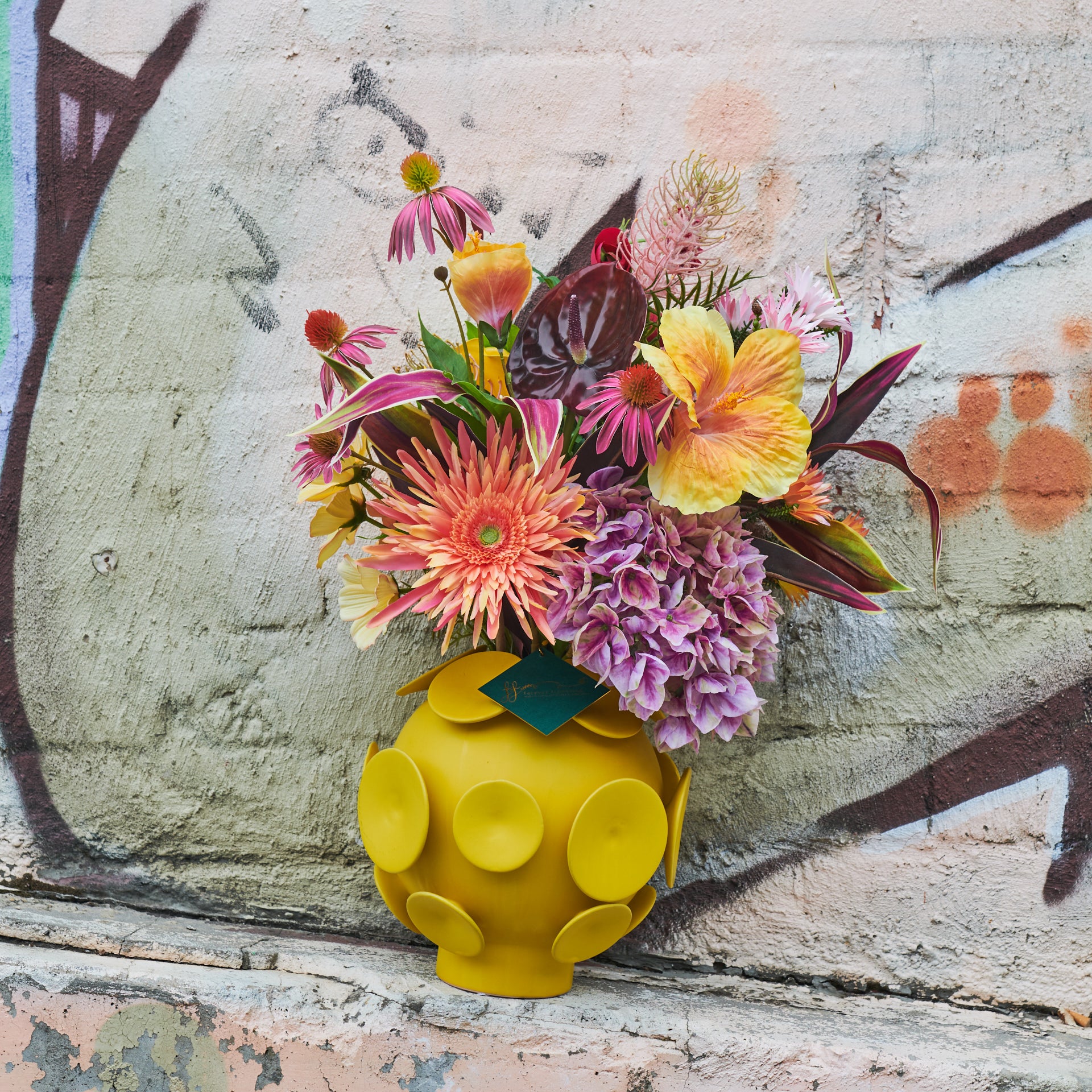 A bold combination of Gerbera, Hydrangea, Hibiscus, Anthurium and Grevillea, with Echinacea and Cosmo set in a Limited Bold Yellow Vase in Artificial Water. This is a 360’ Arrangement.