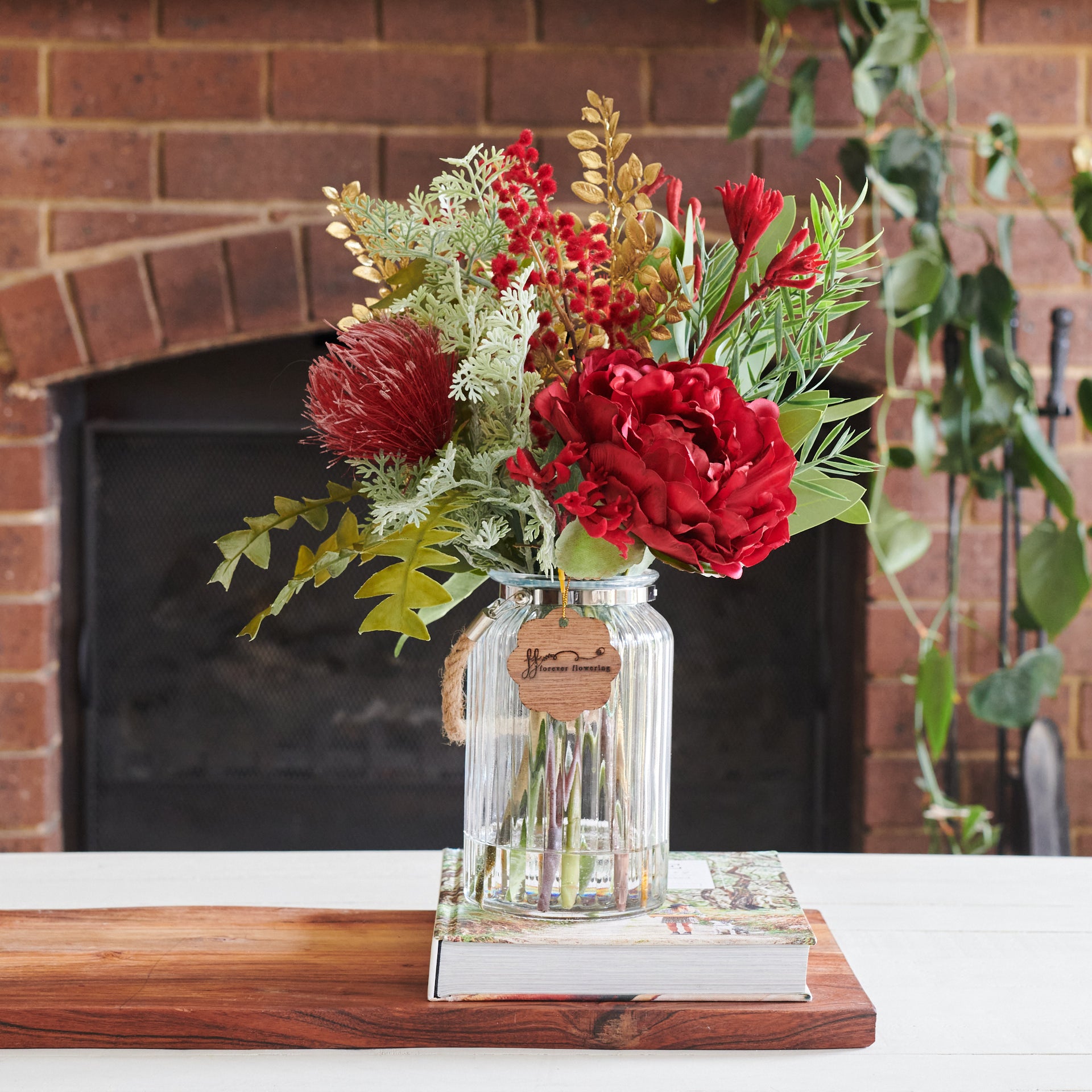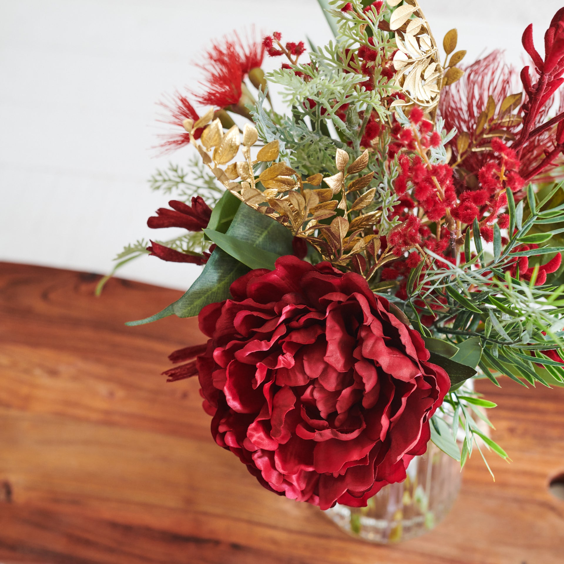Real Touch Peony, Blossom and Eucalyptus with Kangaroo Paw and gold accents set in a Ribbed Glass Vase and artificial water.