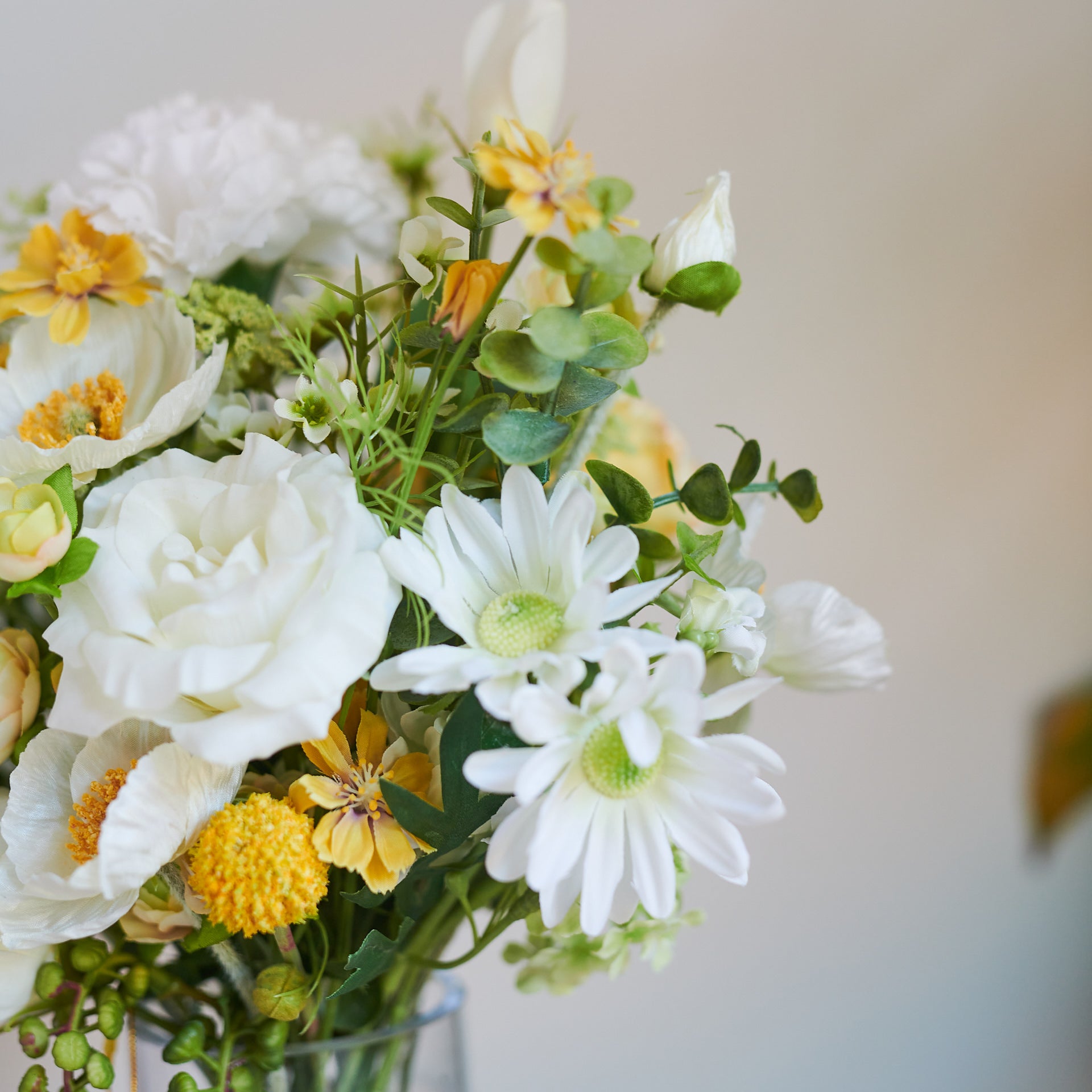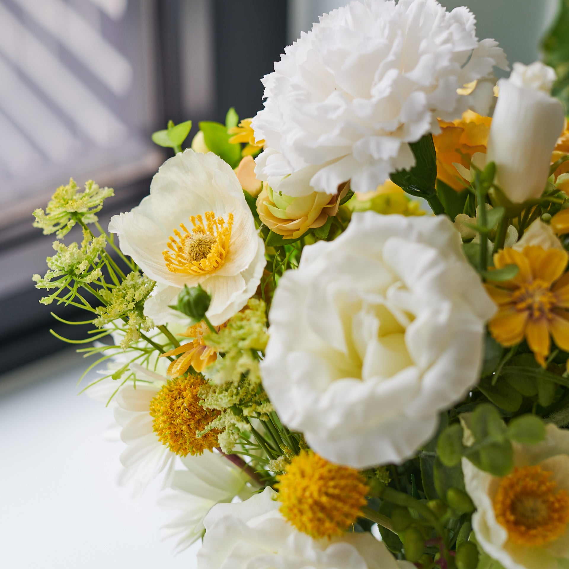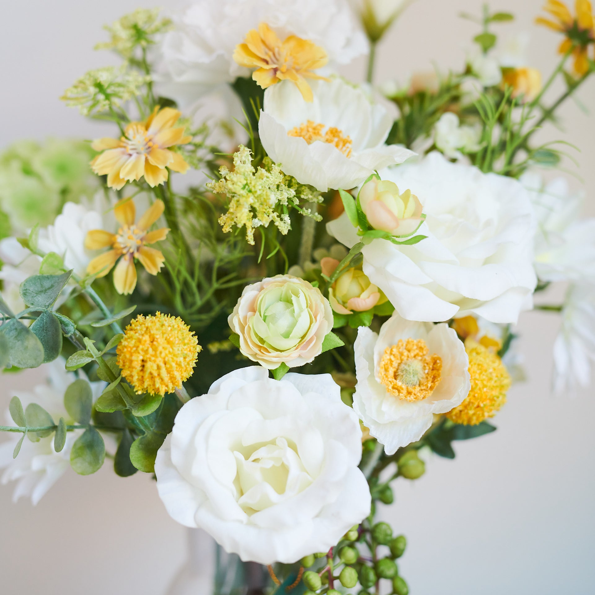 A yellow spring bouquet of poppy, carnations, cosmo, queen annes lace and billy buttons with lisianthus and mini ranunculus set in glass vase in artificial water.