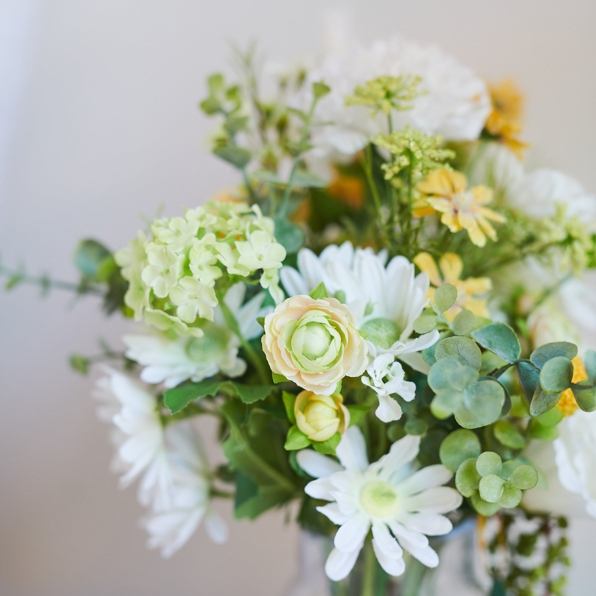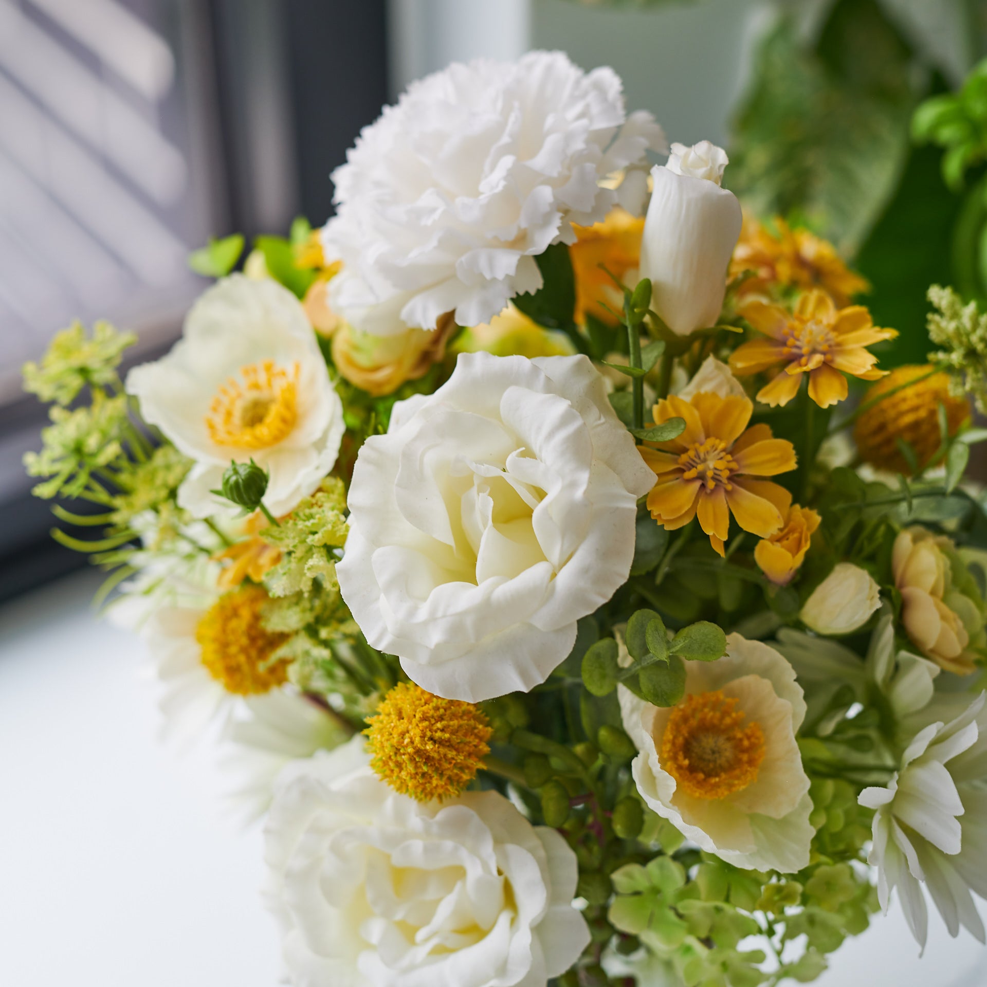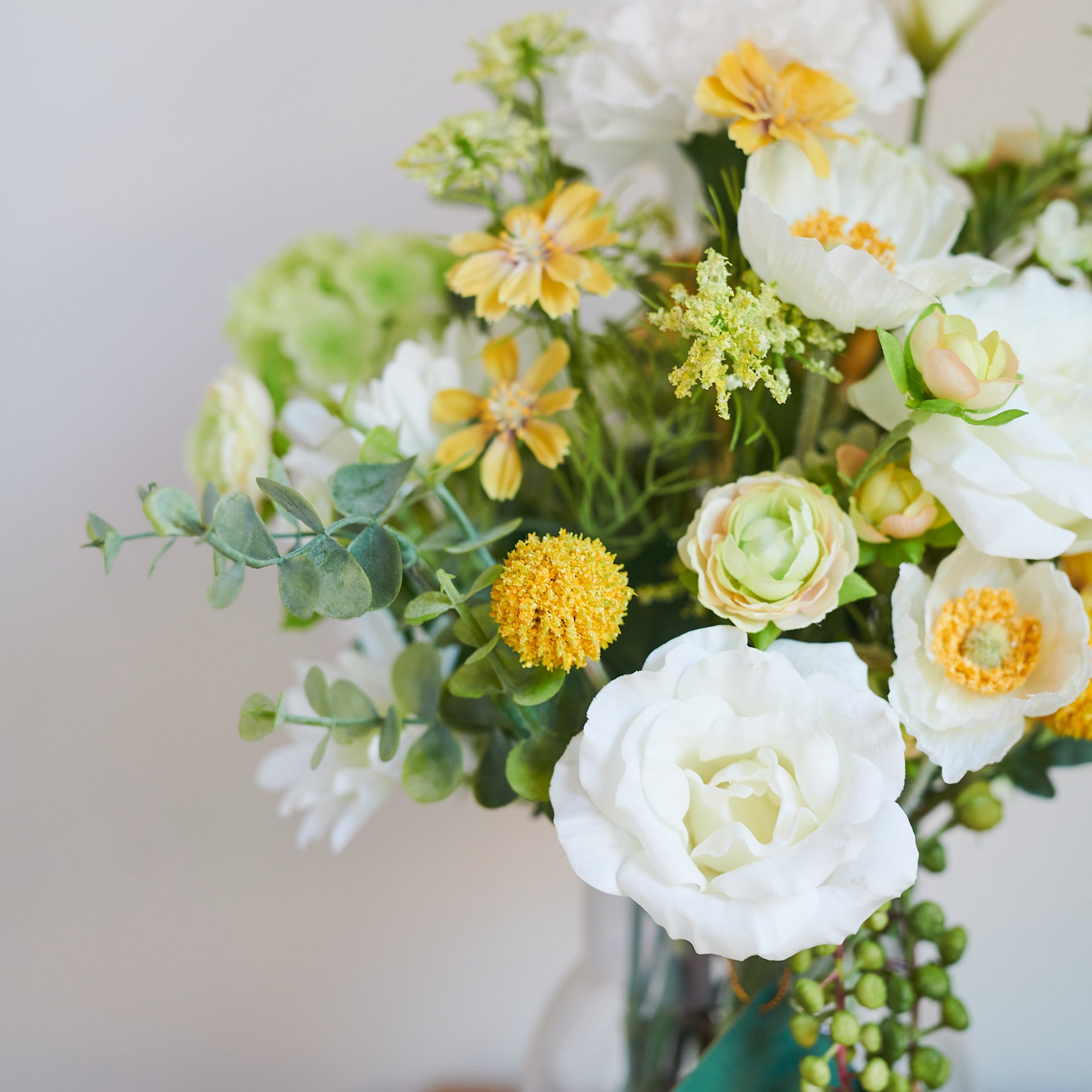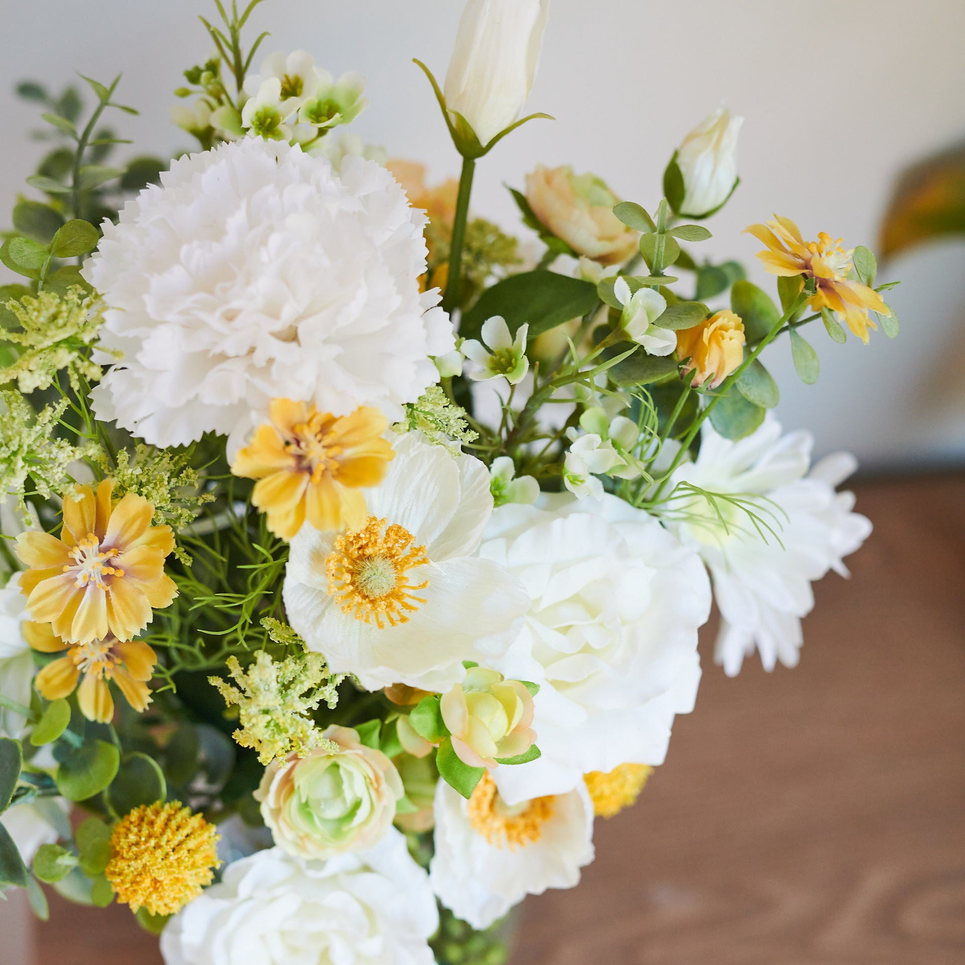 A yellow spring bouquet of poppy, carnations, cosmo, queen annes lace and billy buttons with lisianthus and mini ranunculus set in glass vase in artificial water.