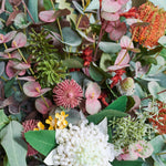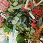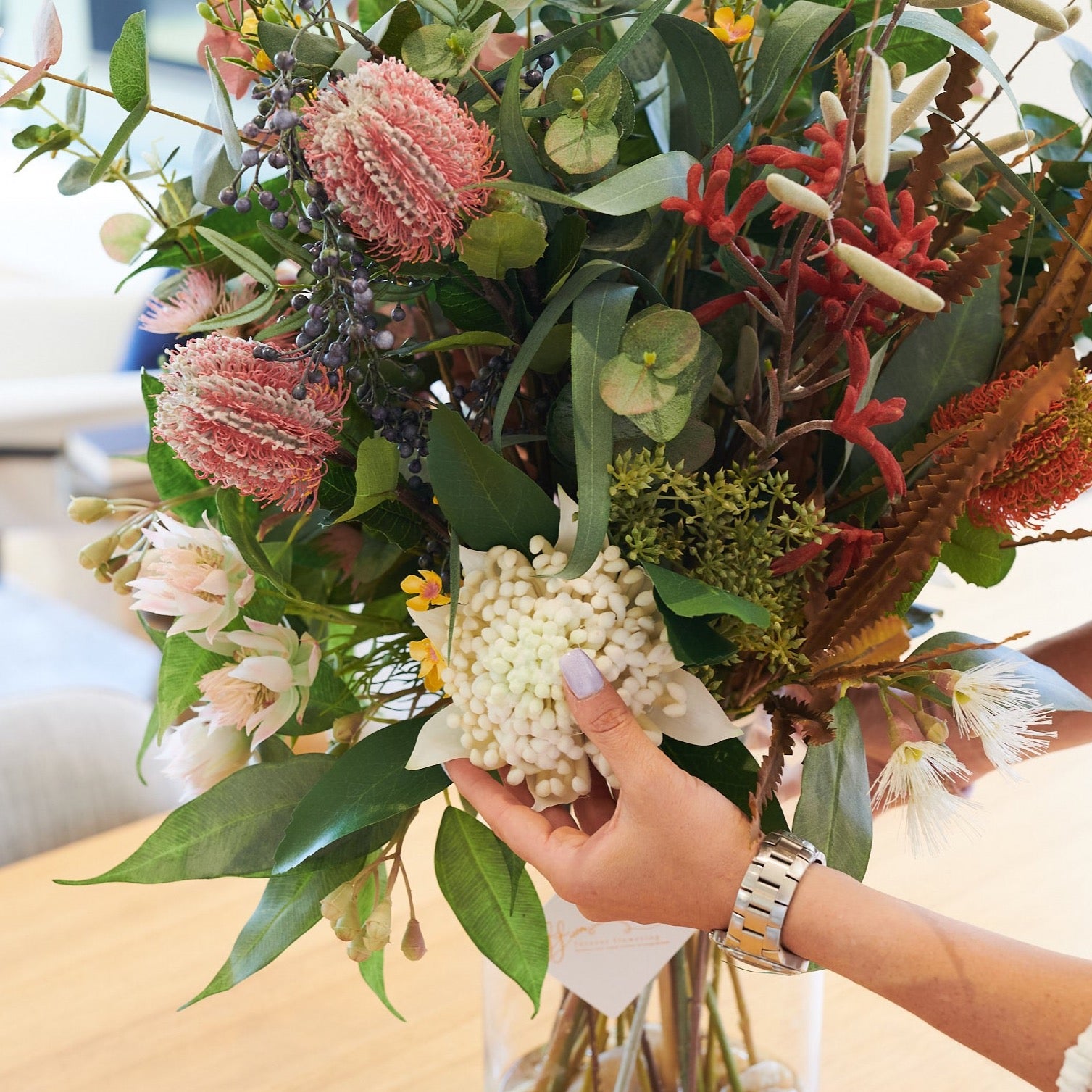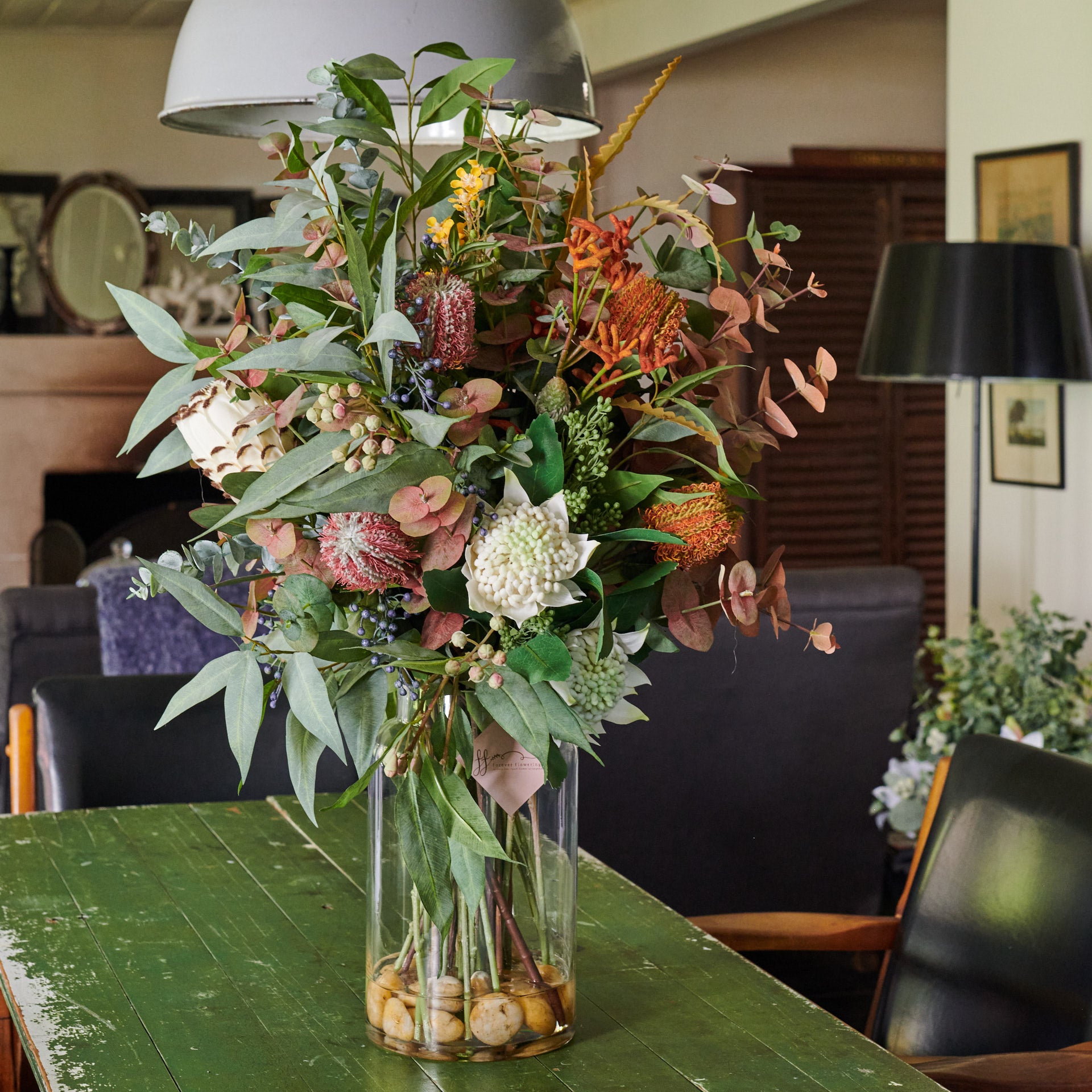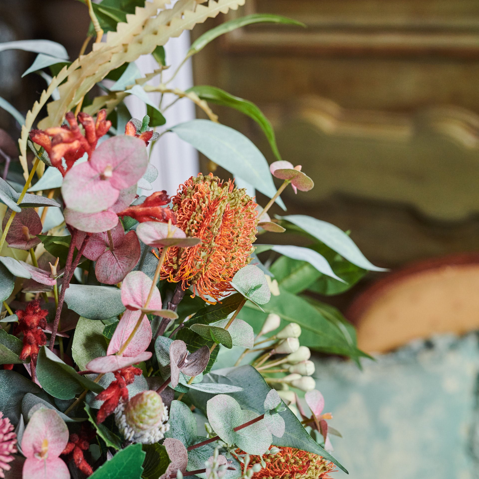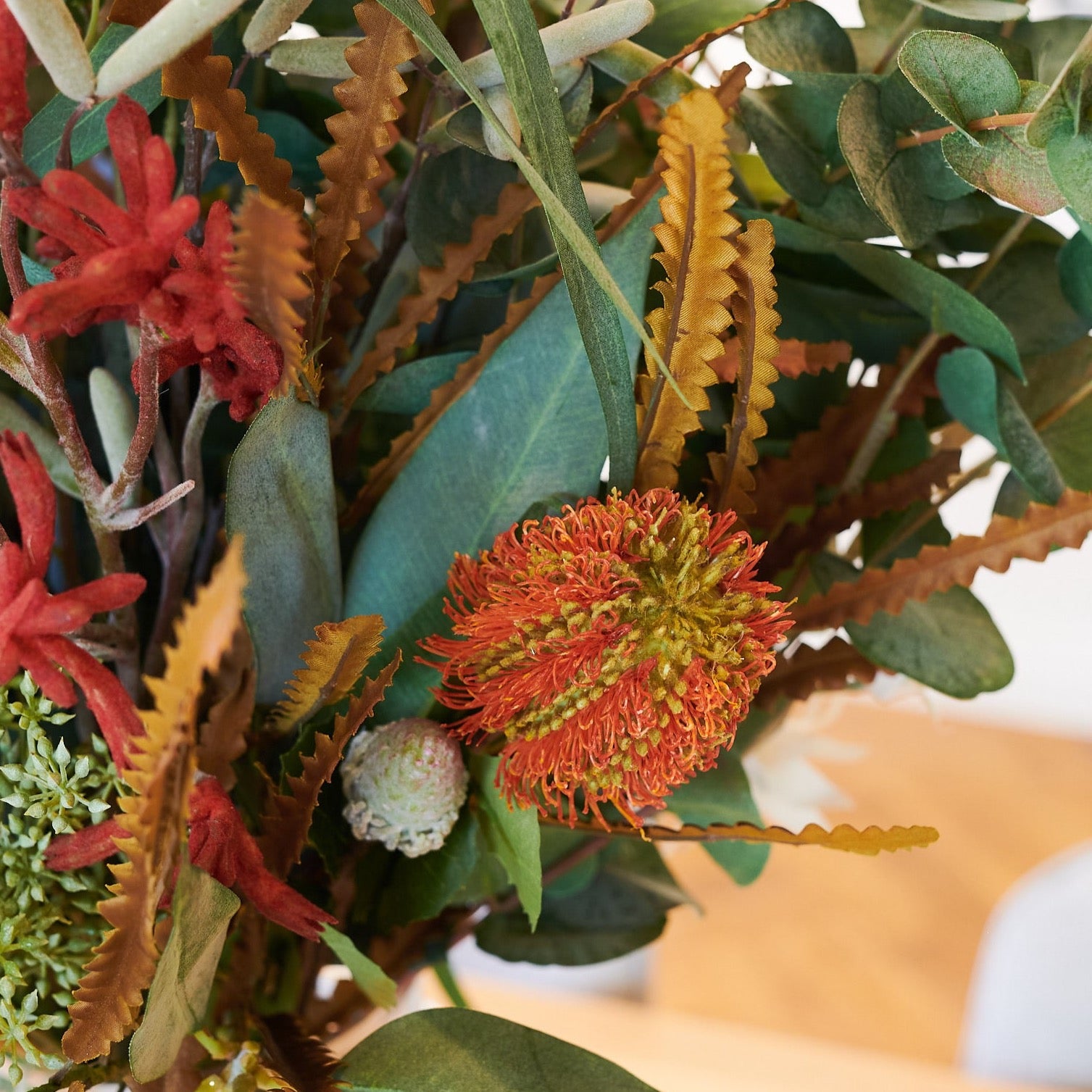 Real Touch Eucalyptus Silver Dollar Leaf, Waratah, Eucalyptus Leaf and Seed Spray, Eucalyptus Long Leaf Spray, Wax Flower, Protea Leucospermum Hybrid, Protea Leucadendron Spray, Waratah, Sawtooth Leaf, Peppercorn, Blushing Bride, Eucalyptus Seed, Kangaroo Paw, Blossoming Flower and Eucalyptus Pod Flowering in a Squat Dome Vase and Artificial Water. This is a 360 degree arrangement.