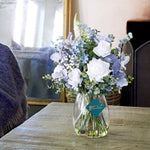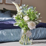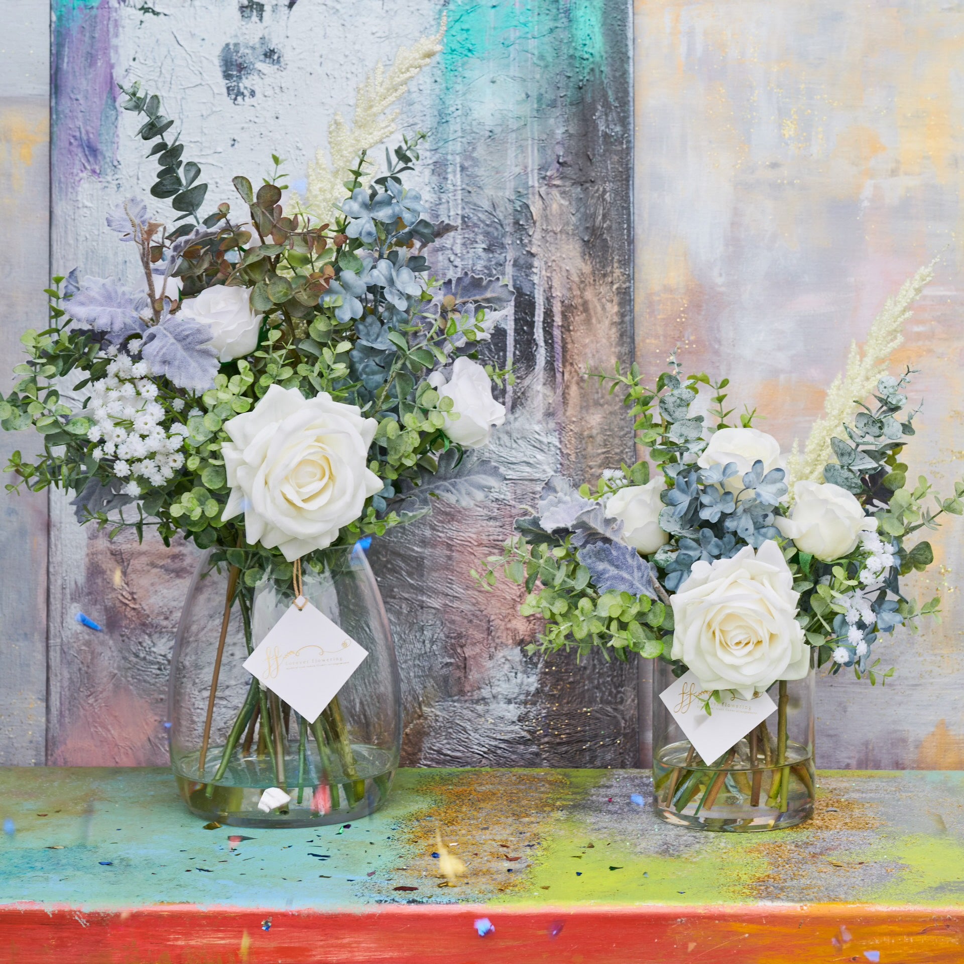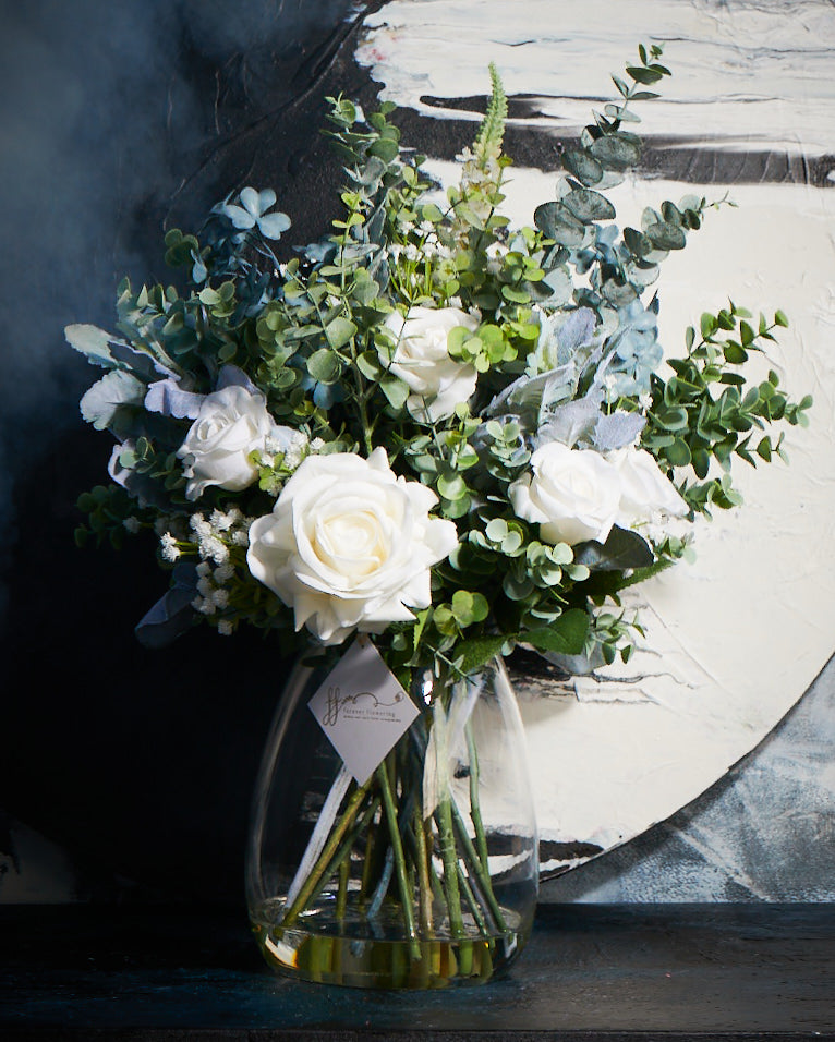 Real Touch Roses, Babys Breath, Eucalyptus Silver Dollar, Clover Spray, Mini Gum Eucalyptus Leaf and Dusty Miller in Belly Vase and Artificial Water. This is a 360 degree flower arrangement.