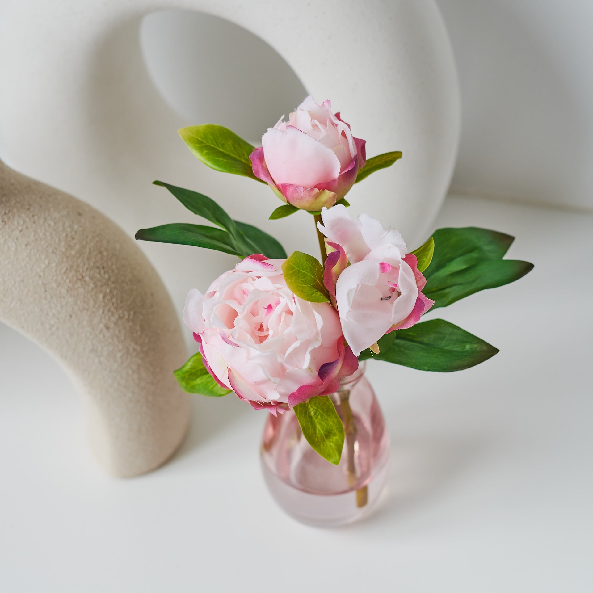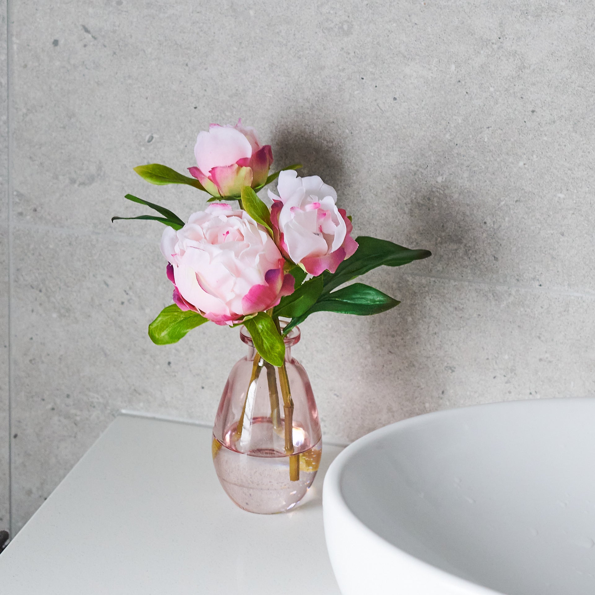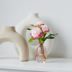 Pink Peony Roses set in a Pink Glass Vase in Artificial Water.