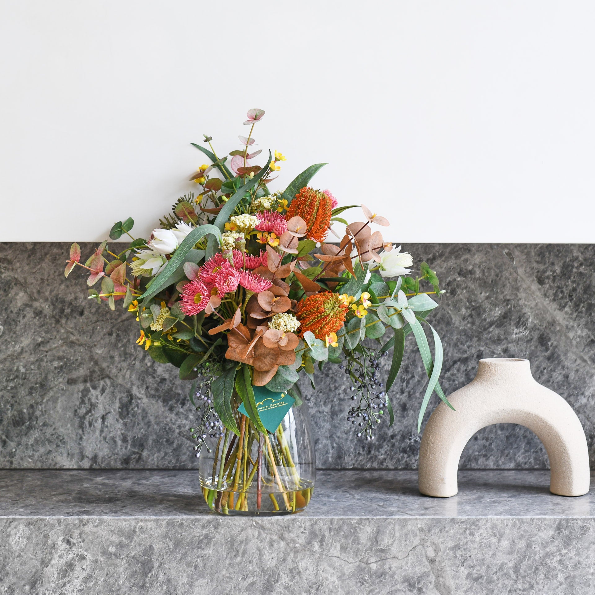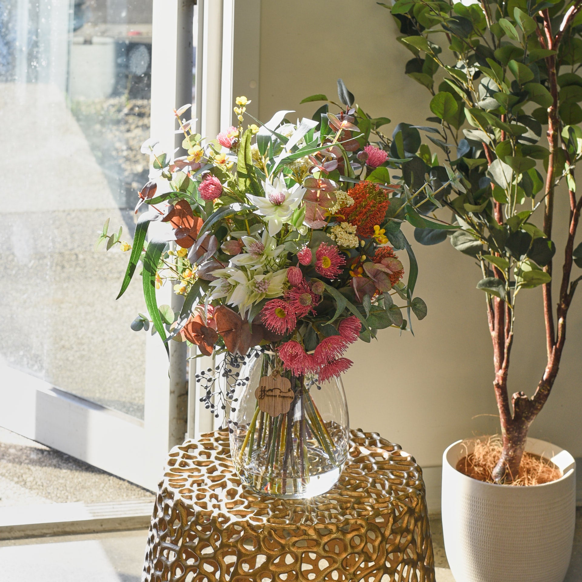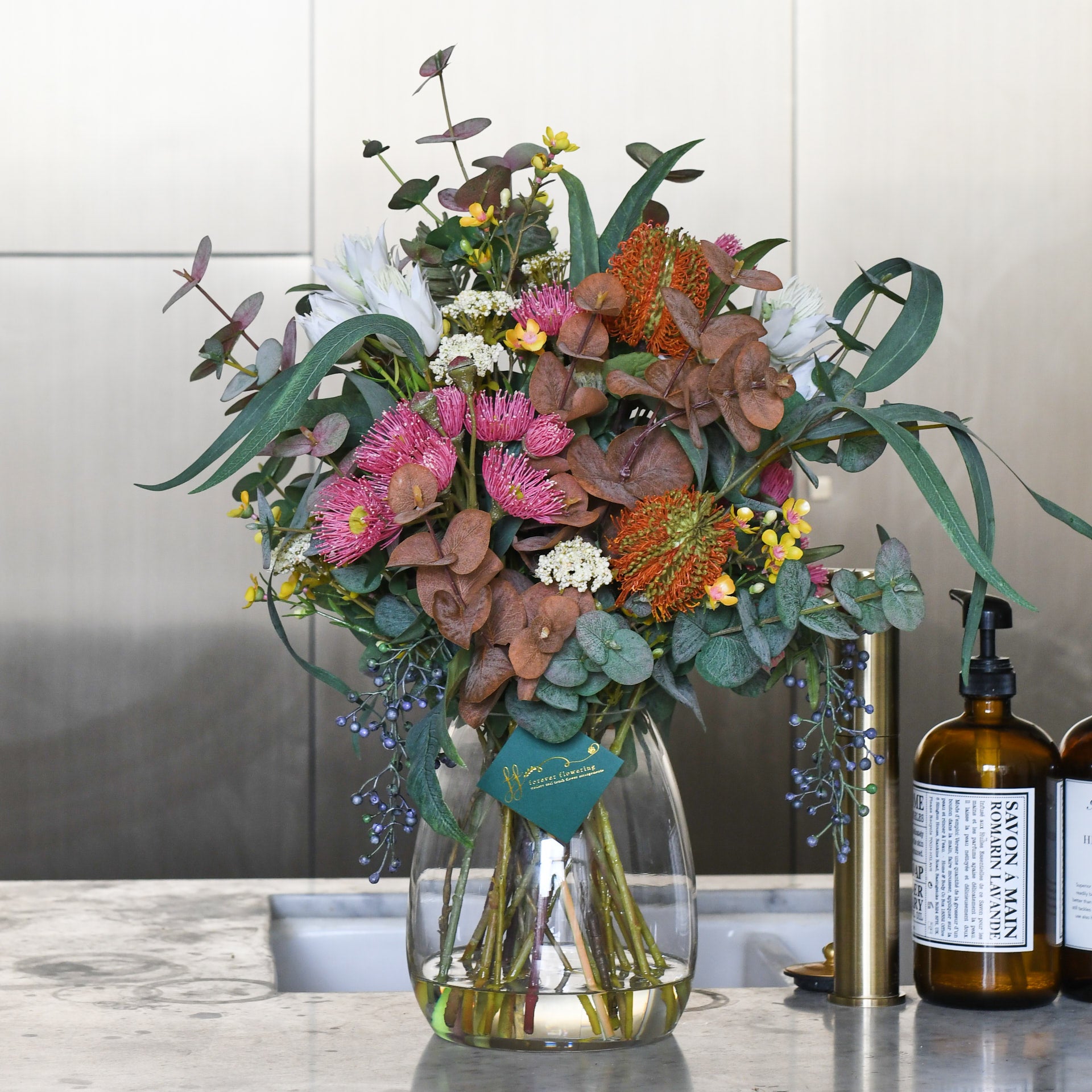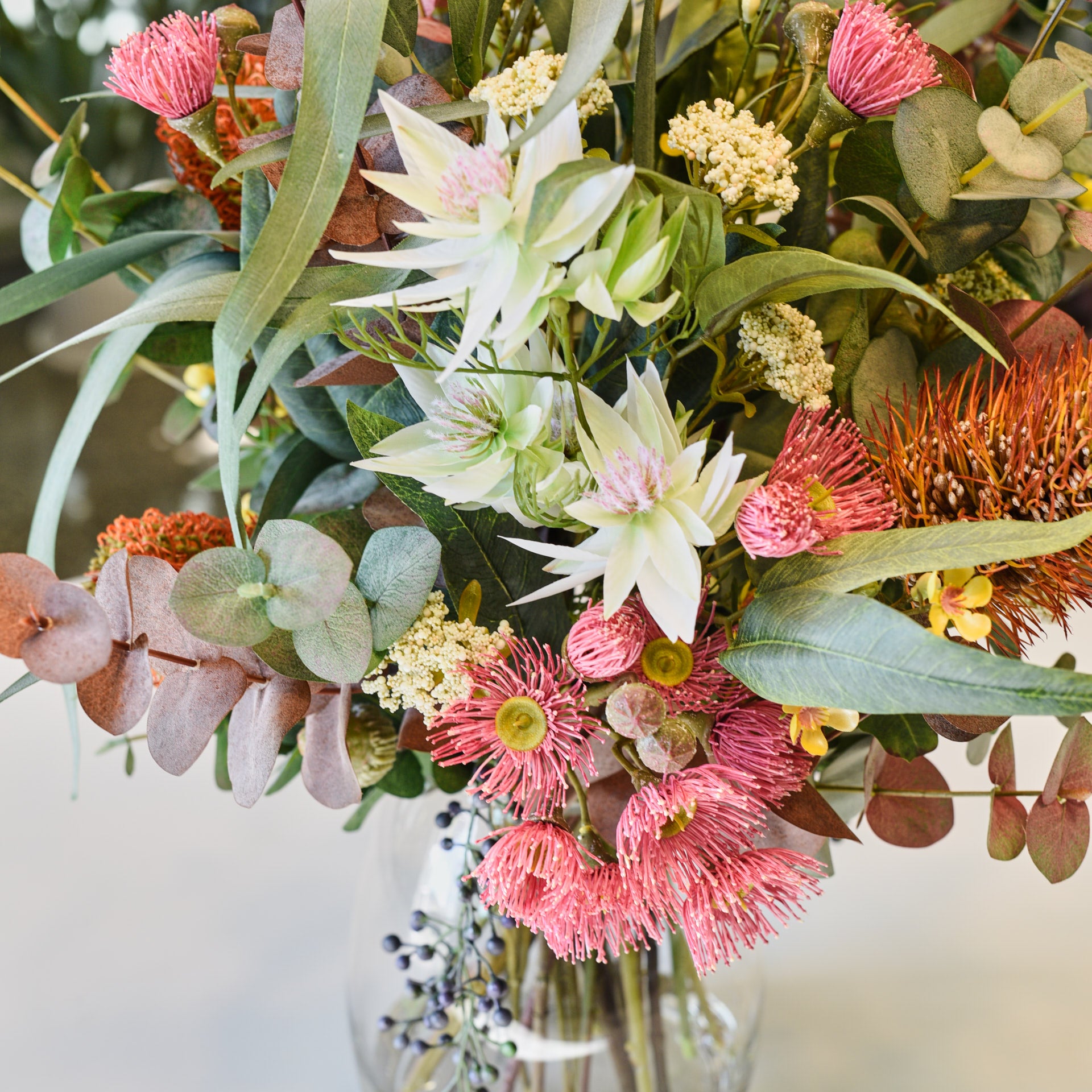 Designed from our best selling Beau arrangement, this larger 360’ native arrangement features seeded eucalyptus, leucospermum, banksias, wax flower and peppercorn set in artificial water in a glass vase. Height 55cm Width 35cm