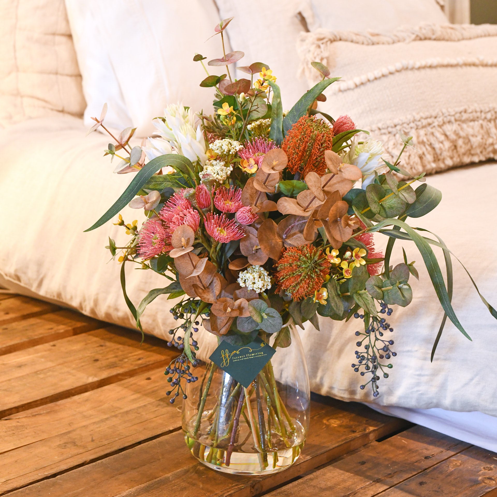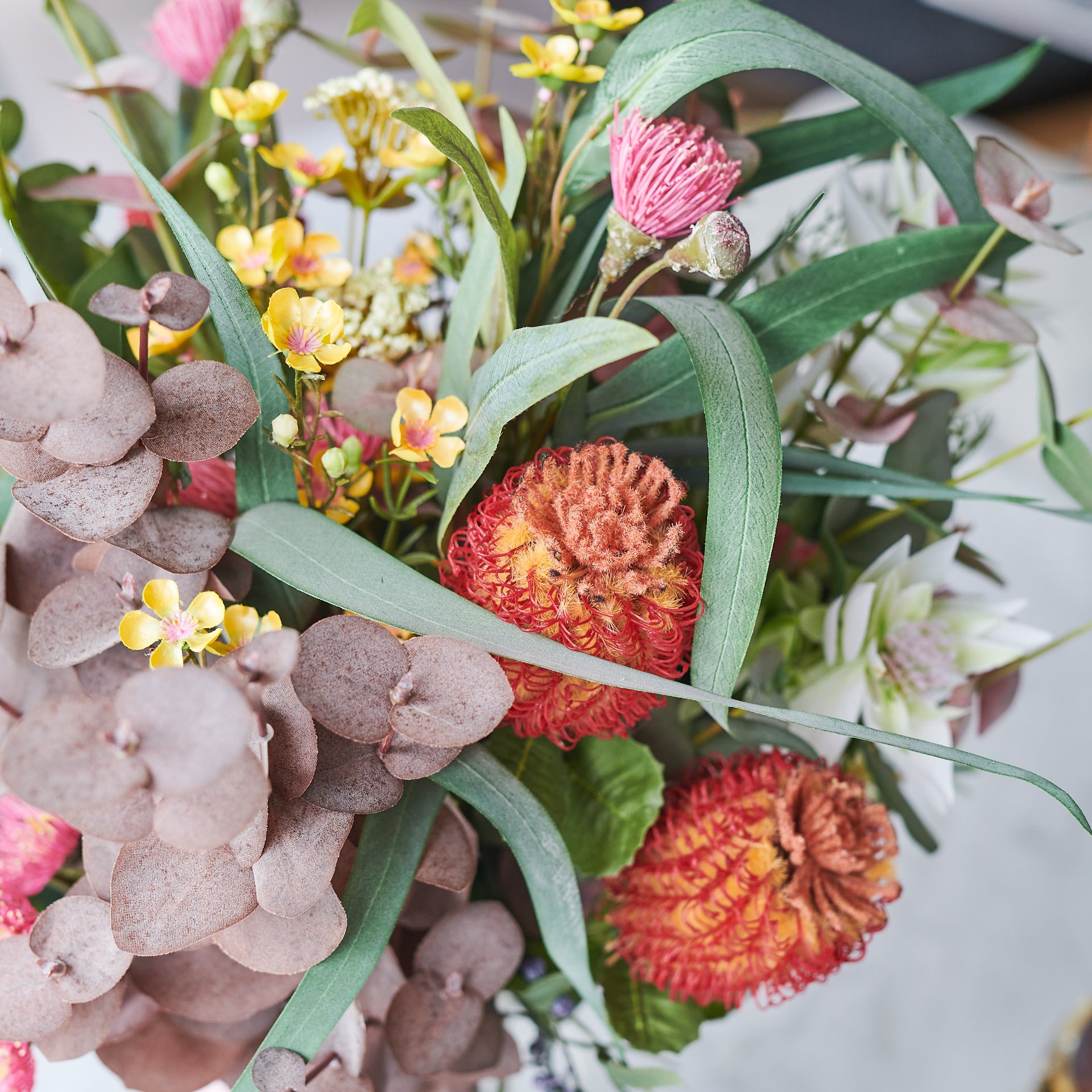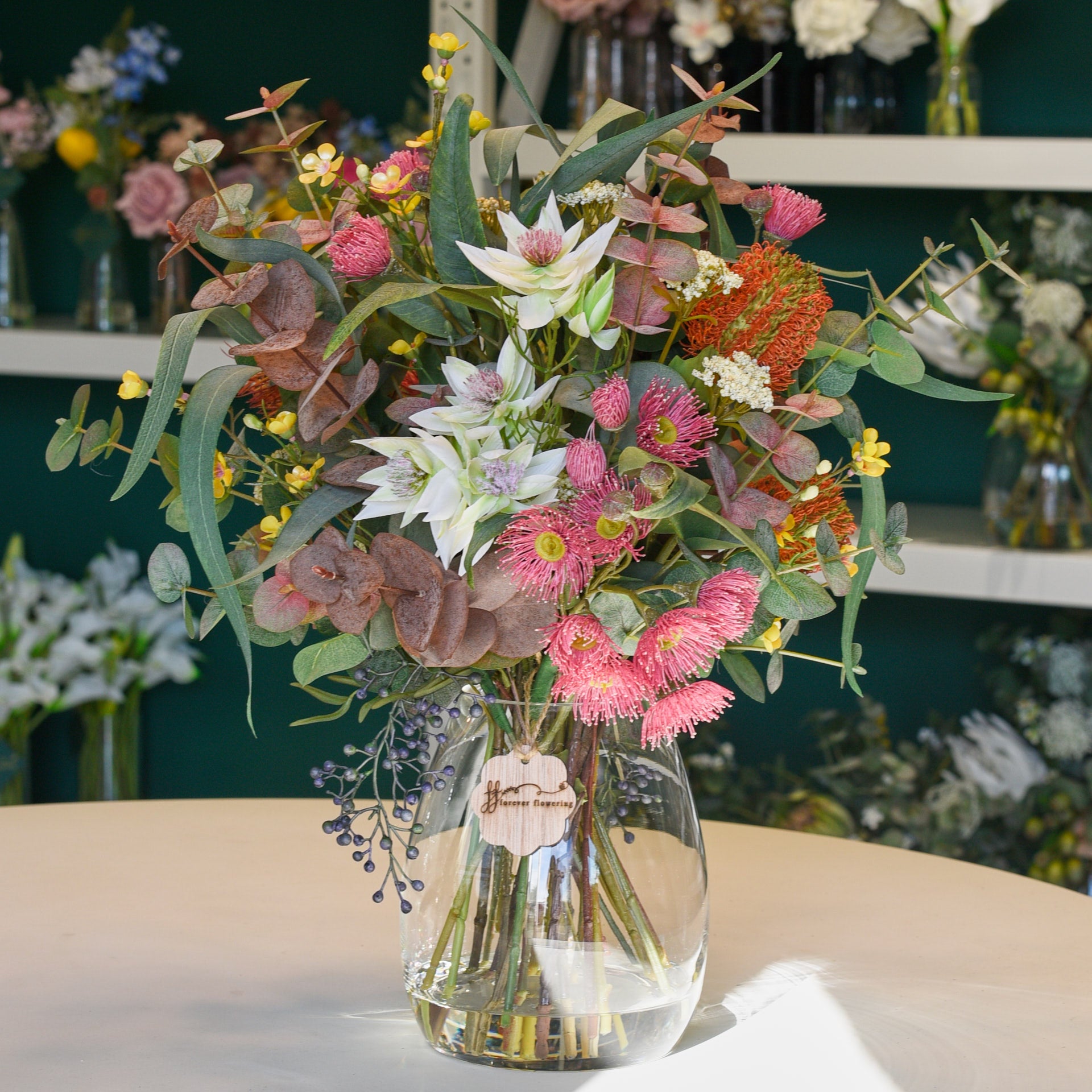 Designed from our best selling Beau arrangement, this larger 360’ native arrangement features seeded eucalyptus, leucospermum, banksias, wax flower and peppercorn set in artificial water in a glass vase. Height 55cm Width 35cm