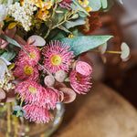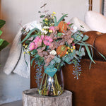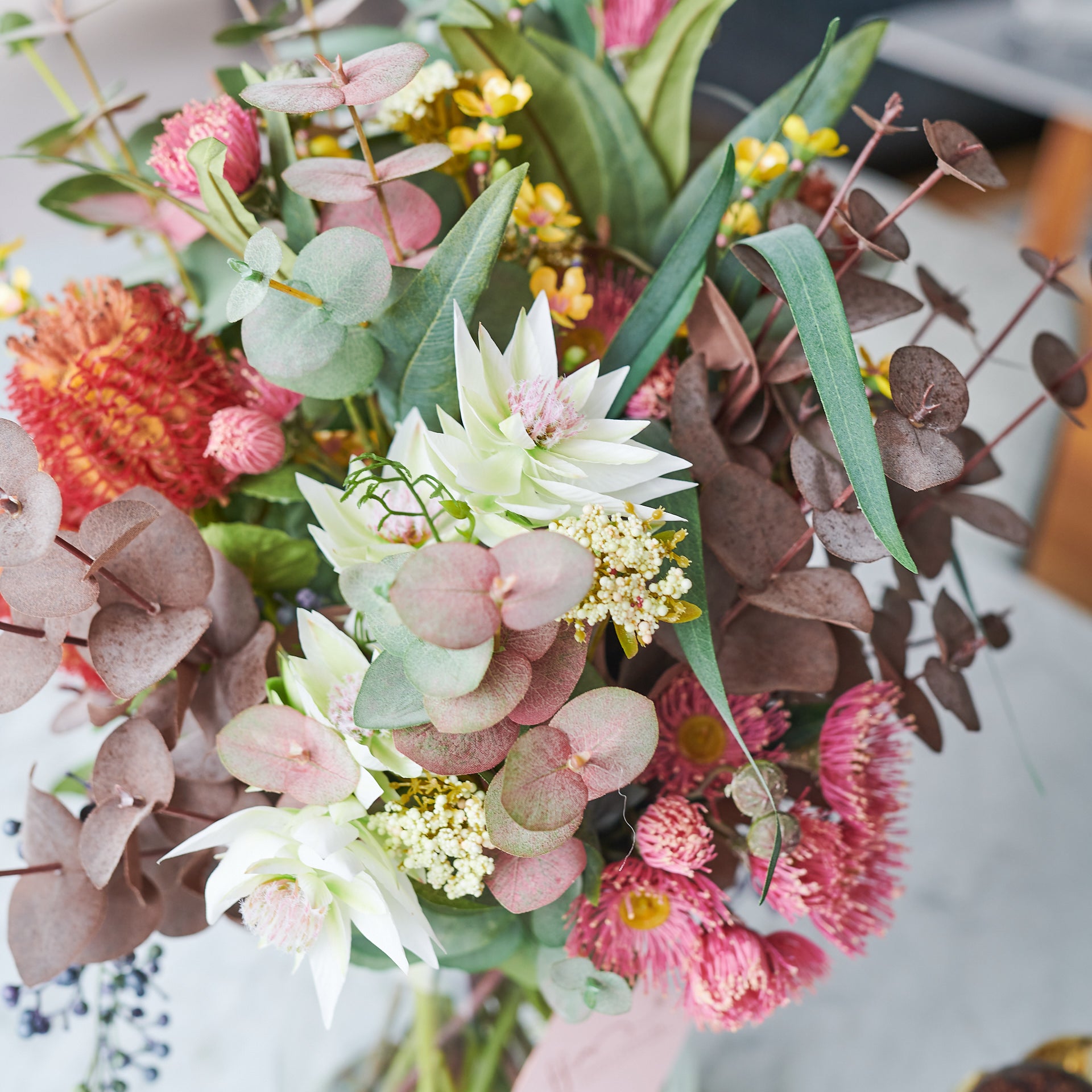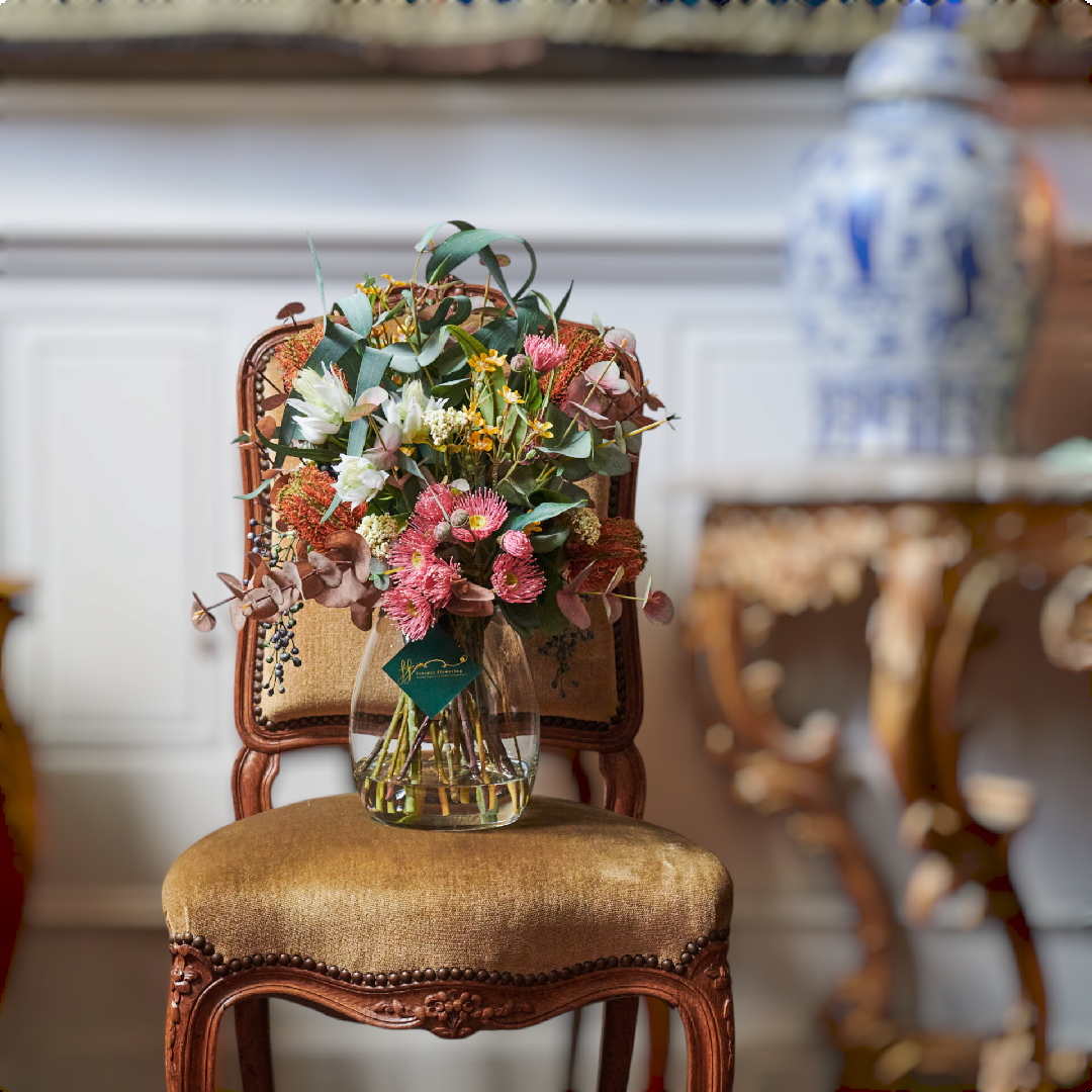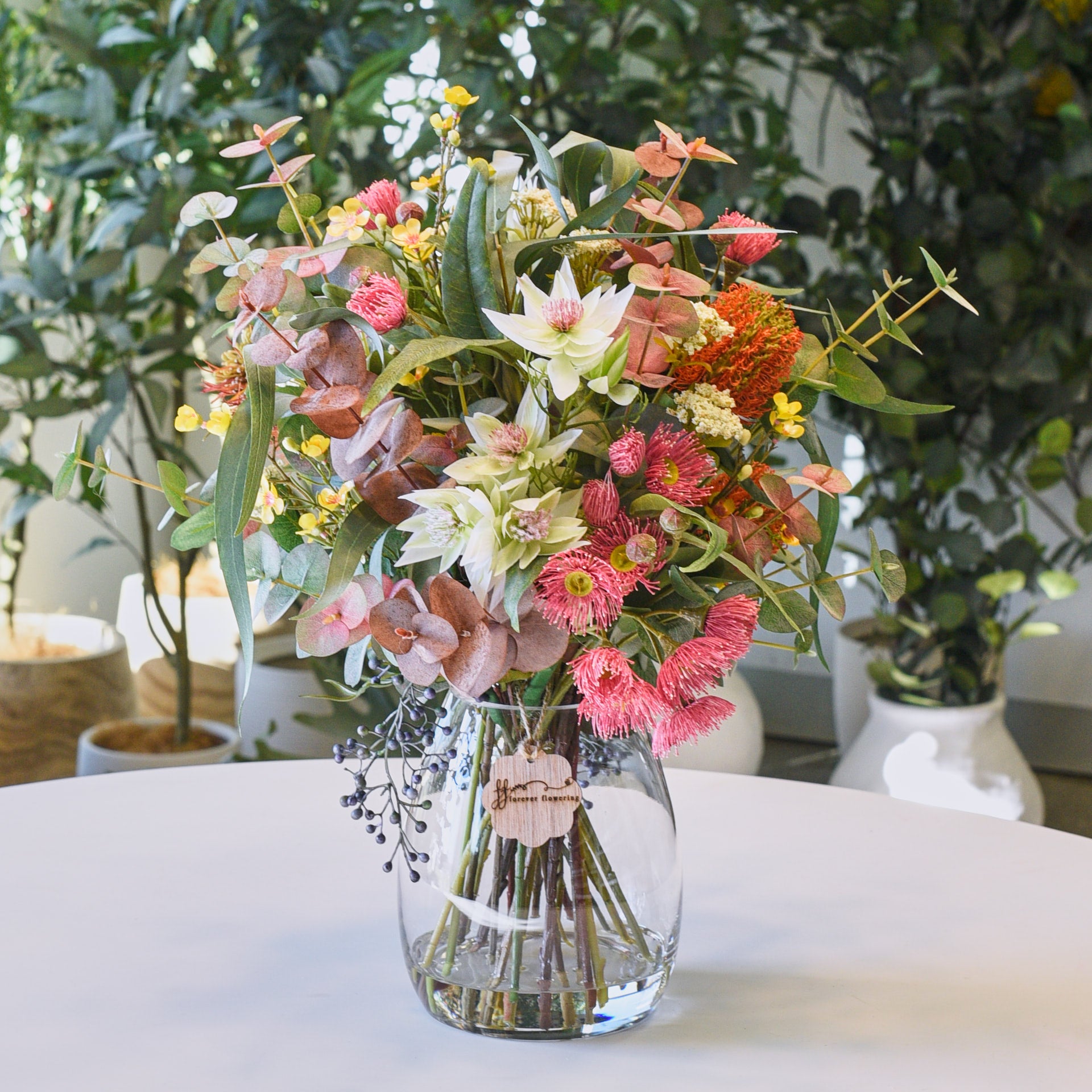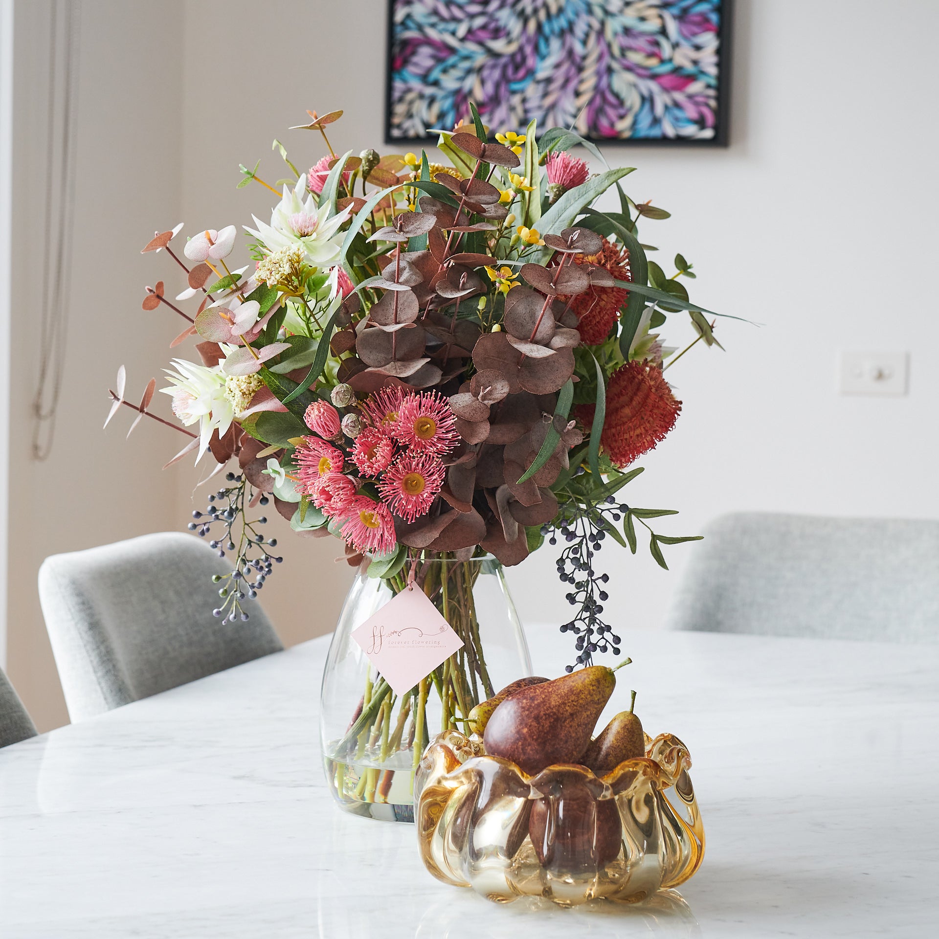 Designed from our best selling Beau arrangement, this larger 360’ native arrangement features seeded eucalyptus, leucospermum, banksias, wax flower and peppercorn set in artificial water in a glass vase. Height 55cm Width 35cm
