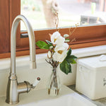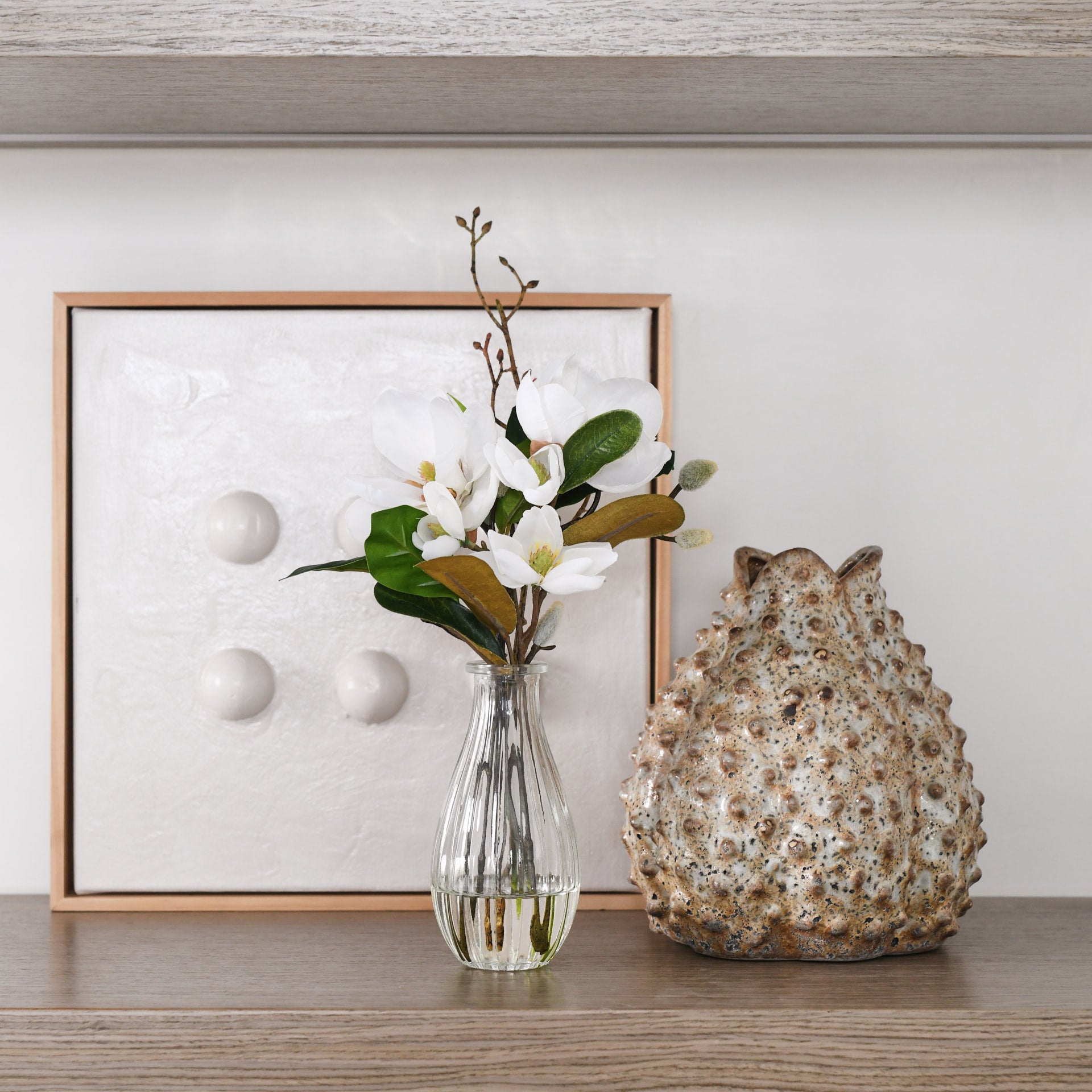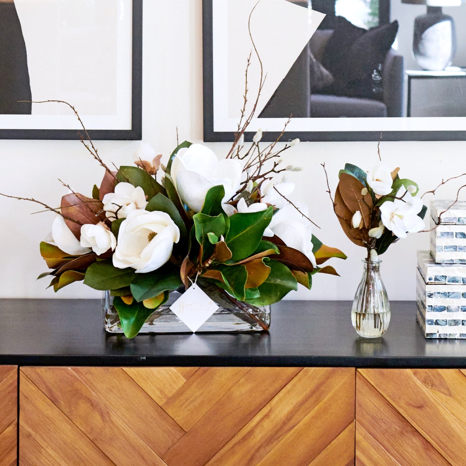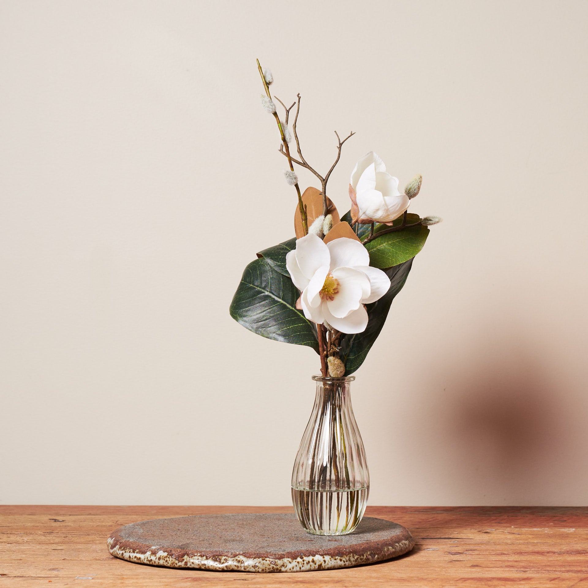 Real Touch Magnolia Flower Spray, Willow Brand and Magnolia Leaf mix in Vintage Glass Bottle. Flowers are permanently set in artificial water.
