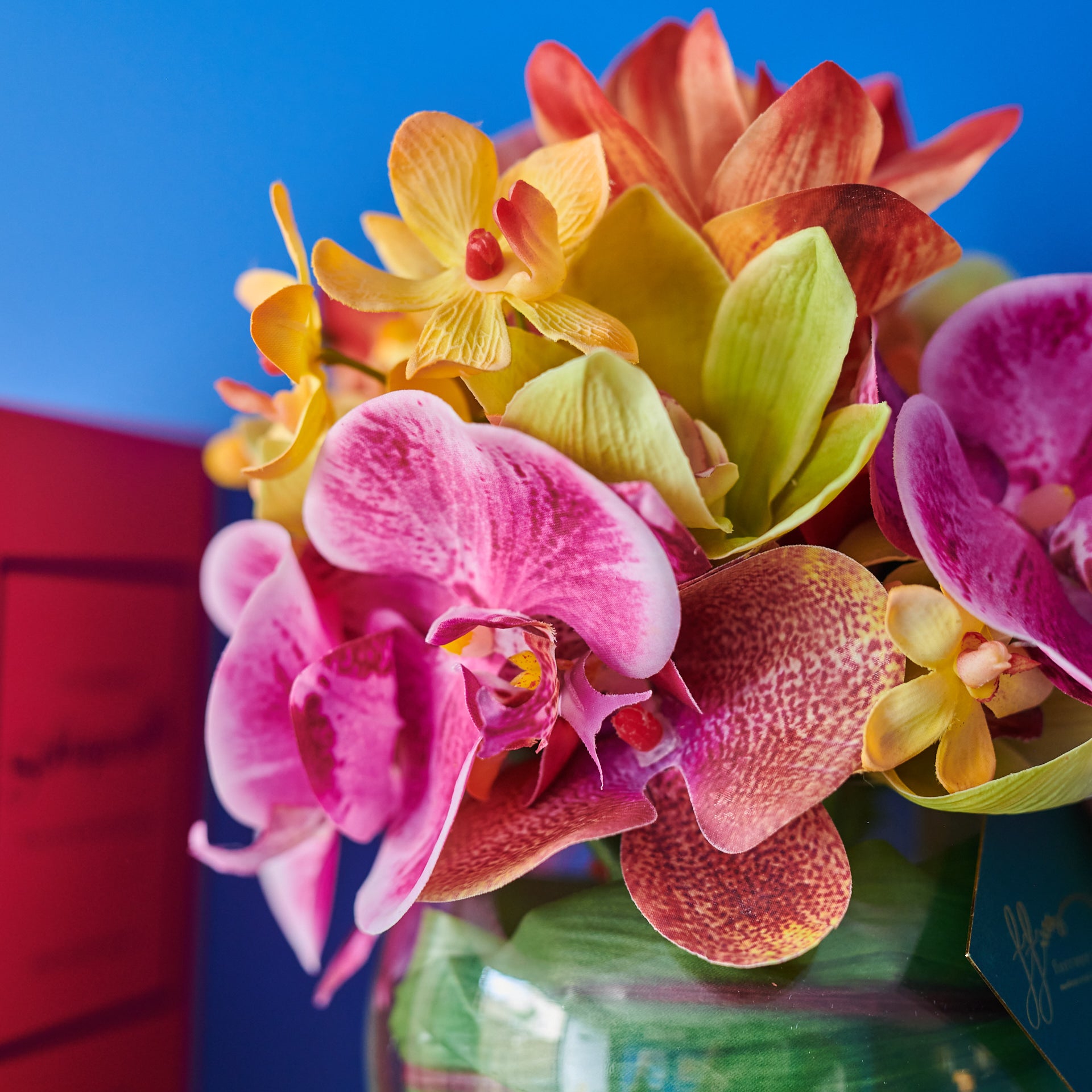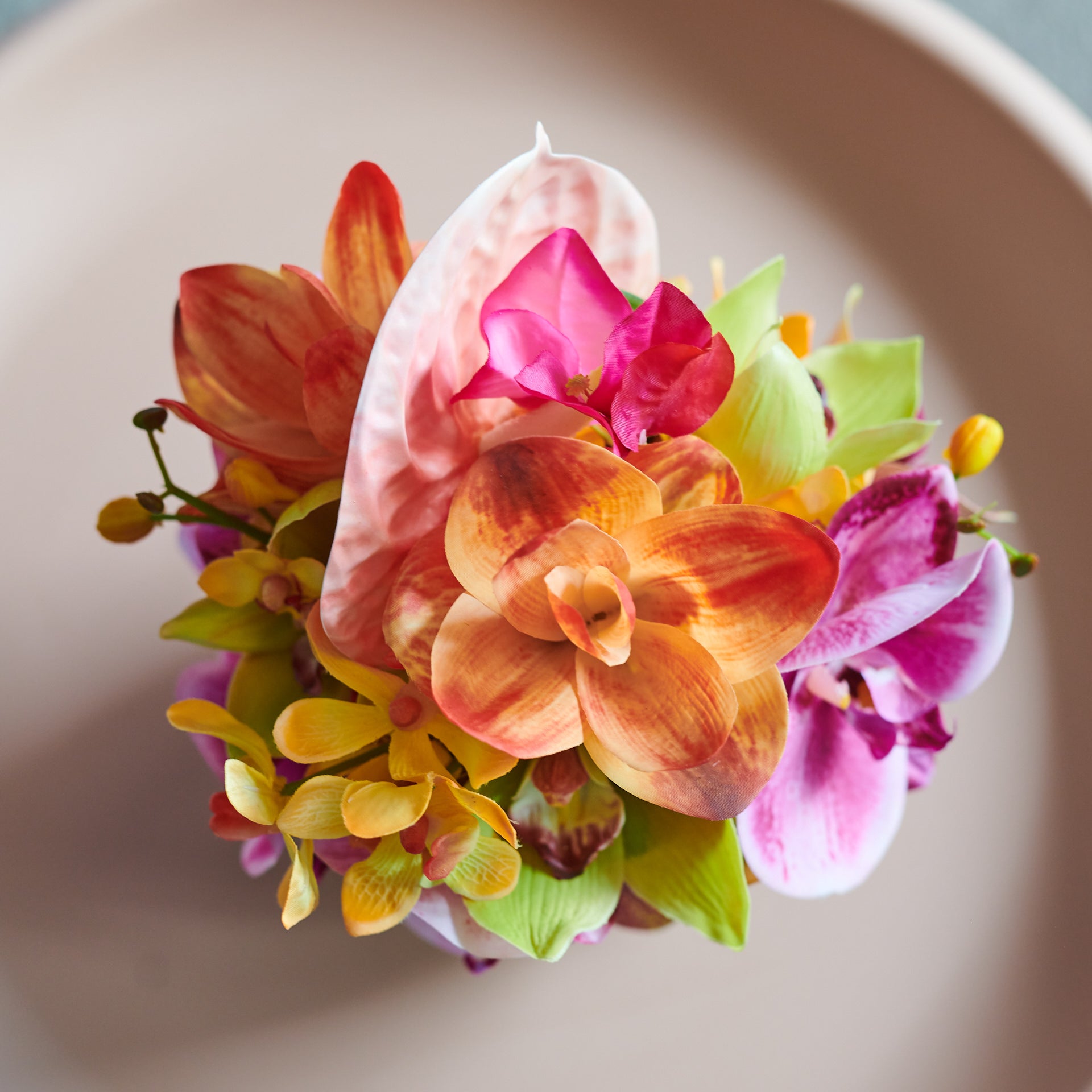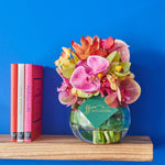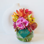 A range of Real Touch Orchids, Ginger Flower and Bougainvillea with Anthurium in Glass Fishbowl Vase with Artificial Water.