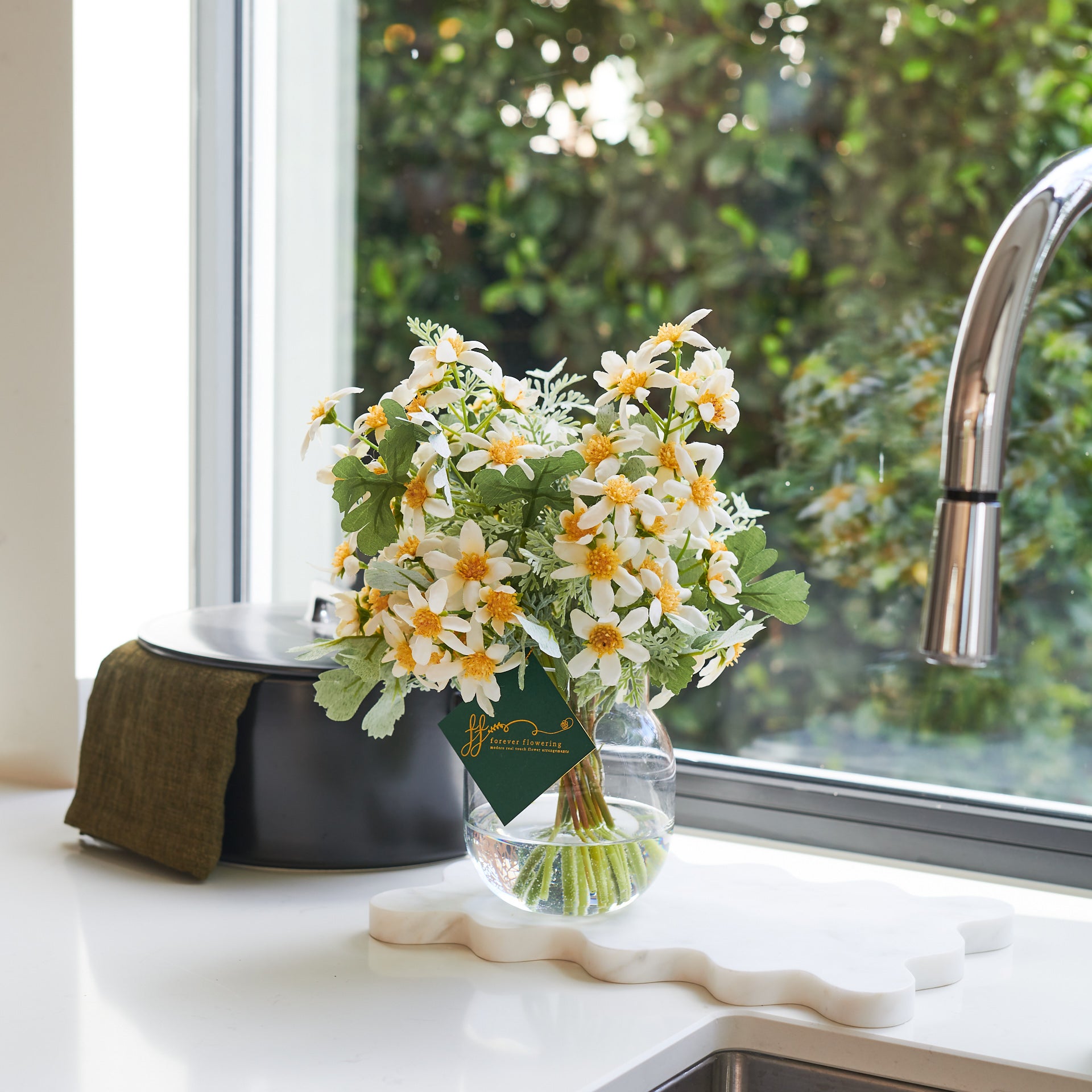 A bouquet of Daisies set in Glass Vase in Artificial Water.