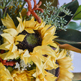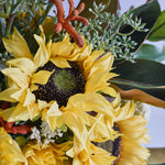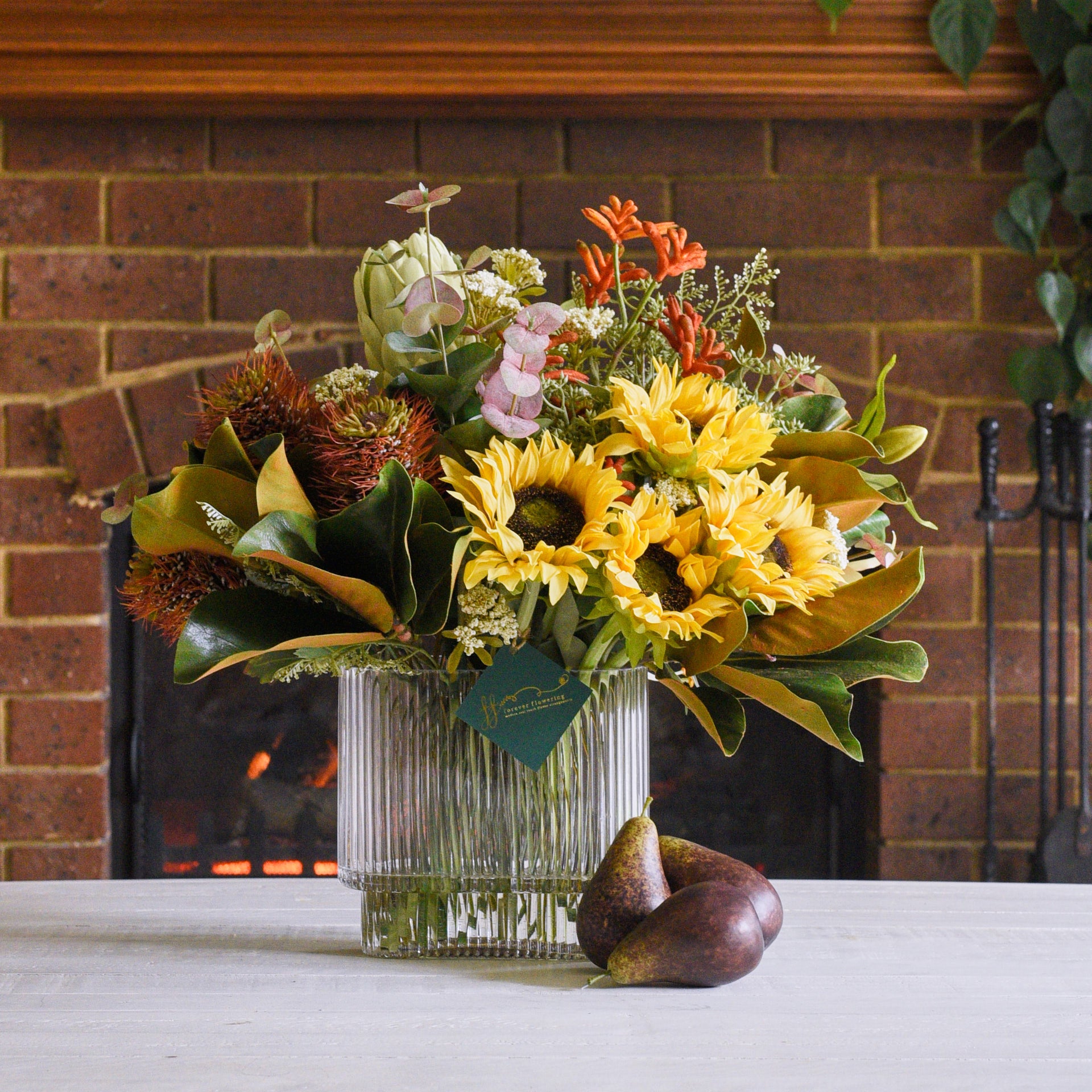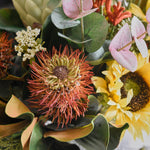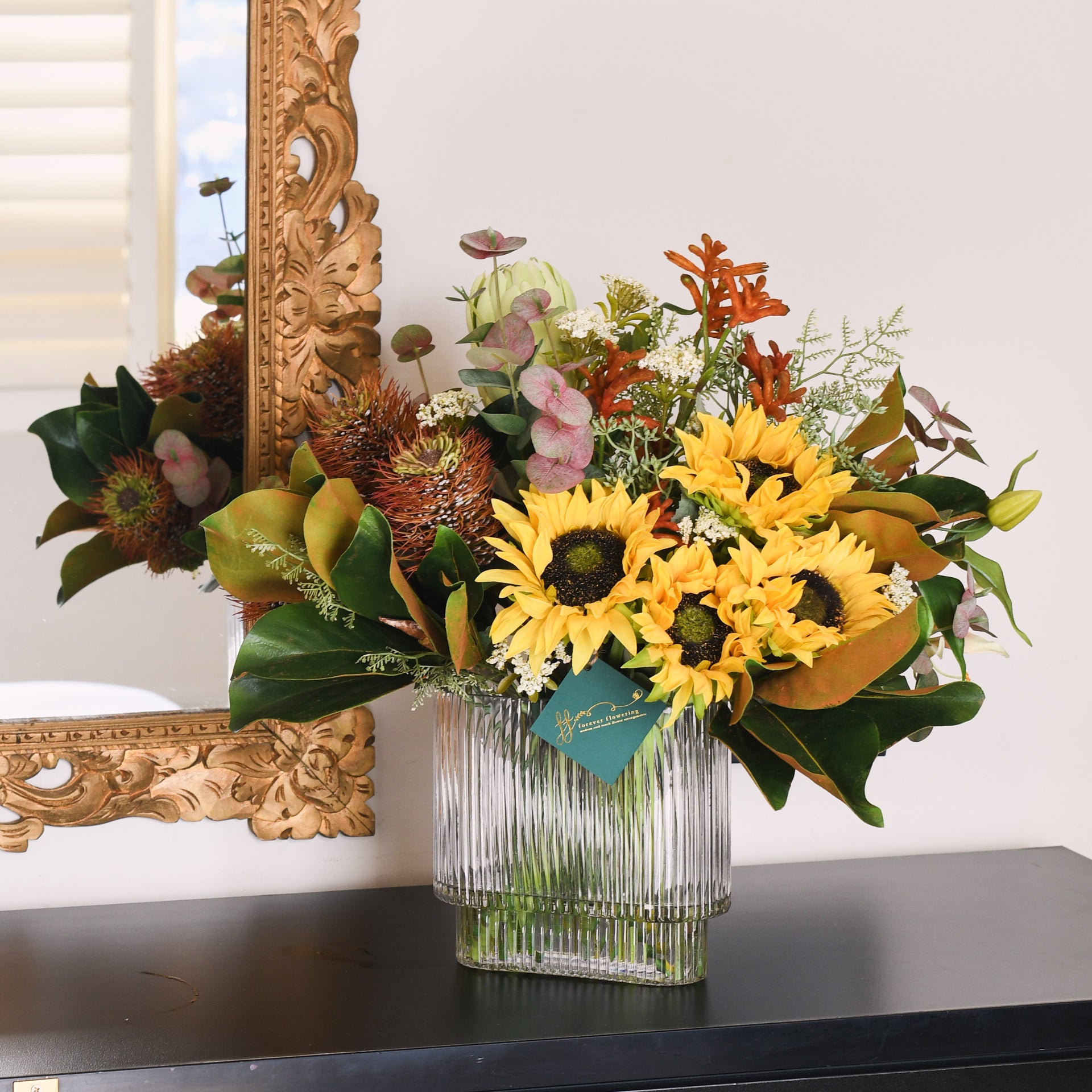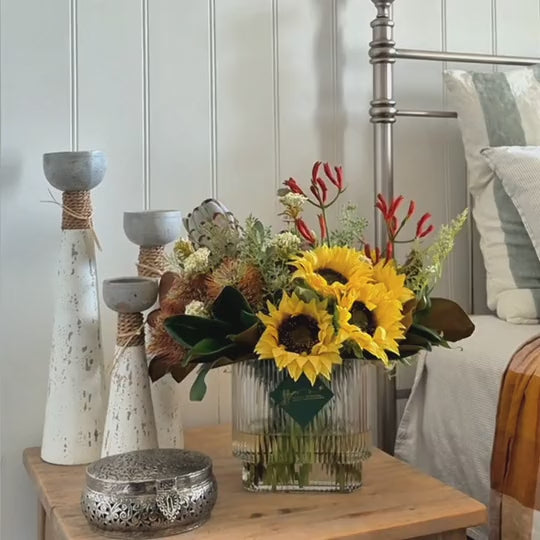 A warm combination of real touch Sunflowers, Hybrid Leucospermum and Protea with Kangaroo Paw, Magnolia leaf, Seed and Queen Annes Lace Bush set in artificial water in a rectangle ribbed glass vase.