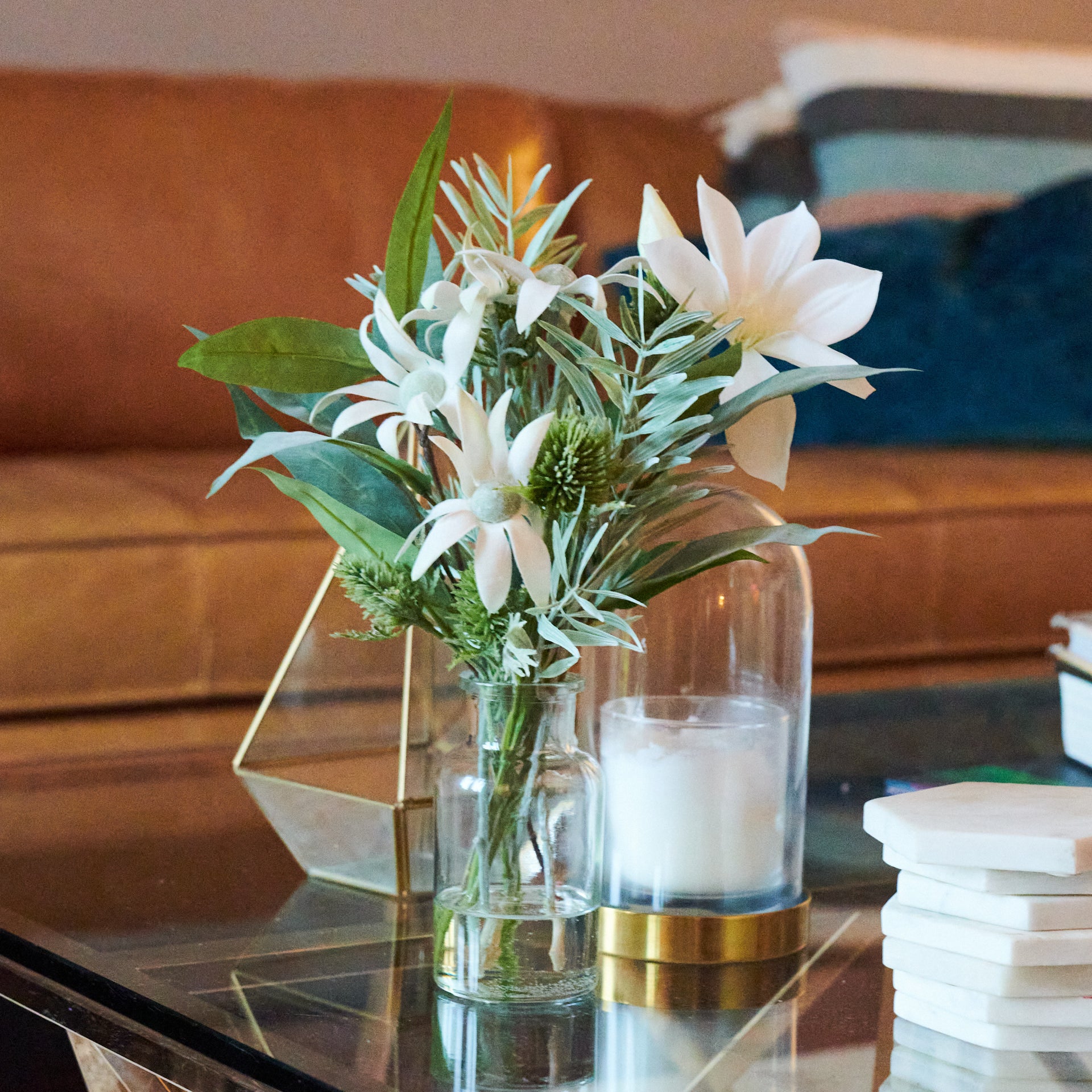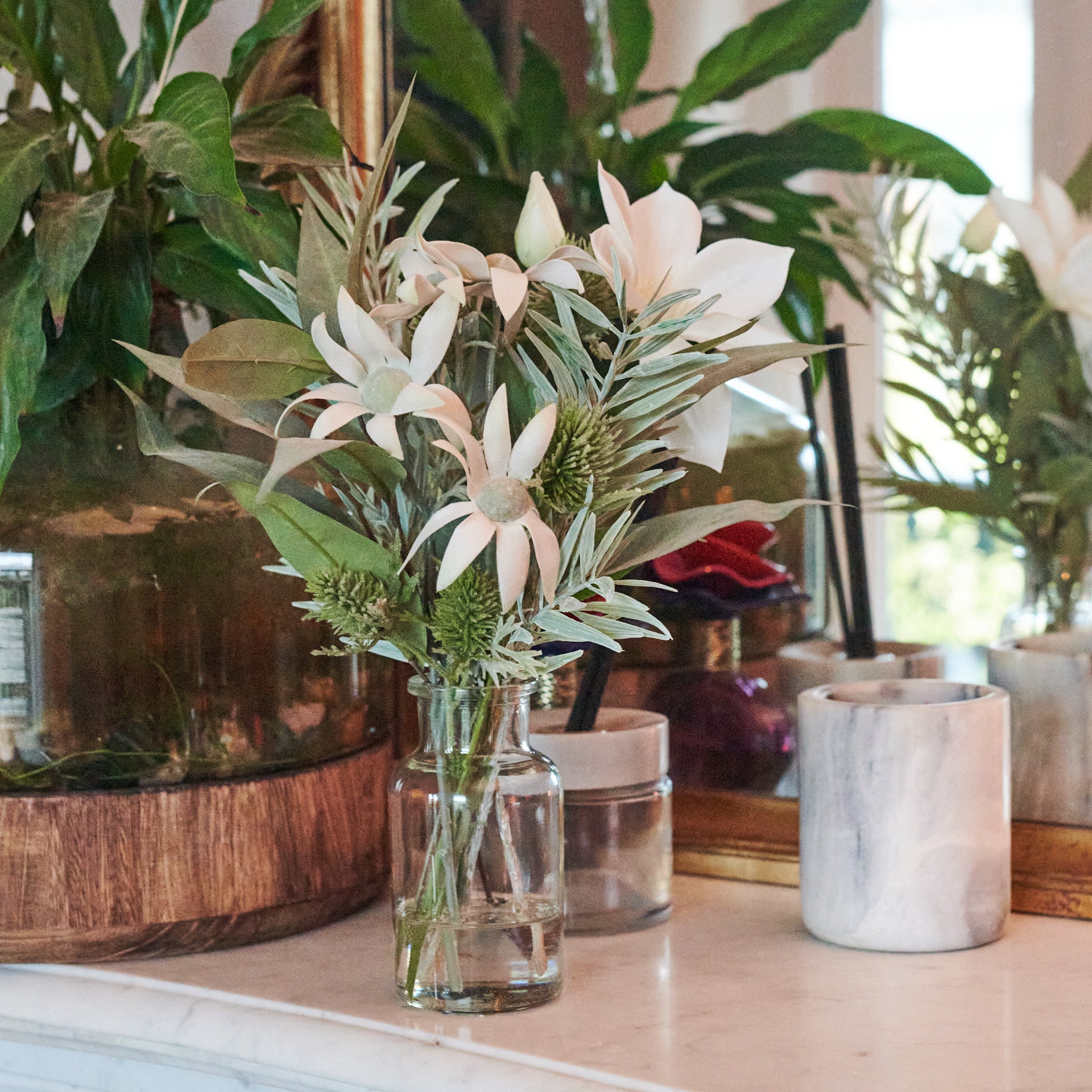 A matchy version of our best selling Wilde arrangement featuring Real Touch Flannel Flower, Thistle and Clematis with Eucalyptus set in Glass Vase in Artificial Water.