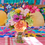 Mischief : A colourful arrangement including Real Touch Clematis, Austin Rose and Snowball with Billy Buttons, Larkspur, Carnation, Enki Leaf and Bougainvillea set in a Glass Vase in Artificial Water