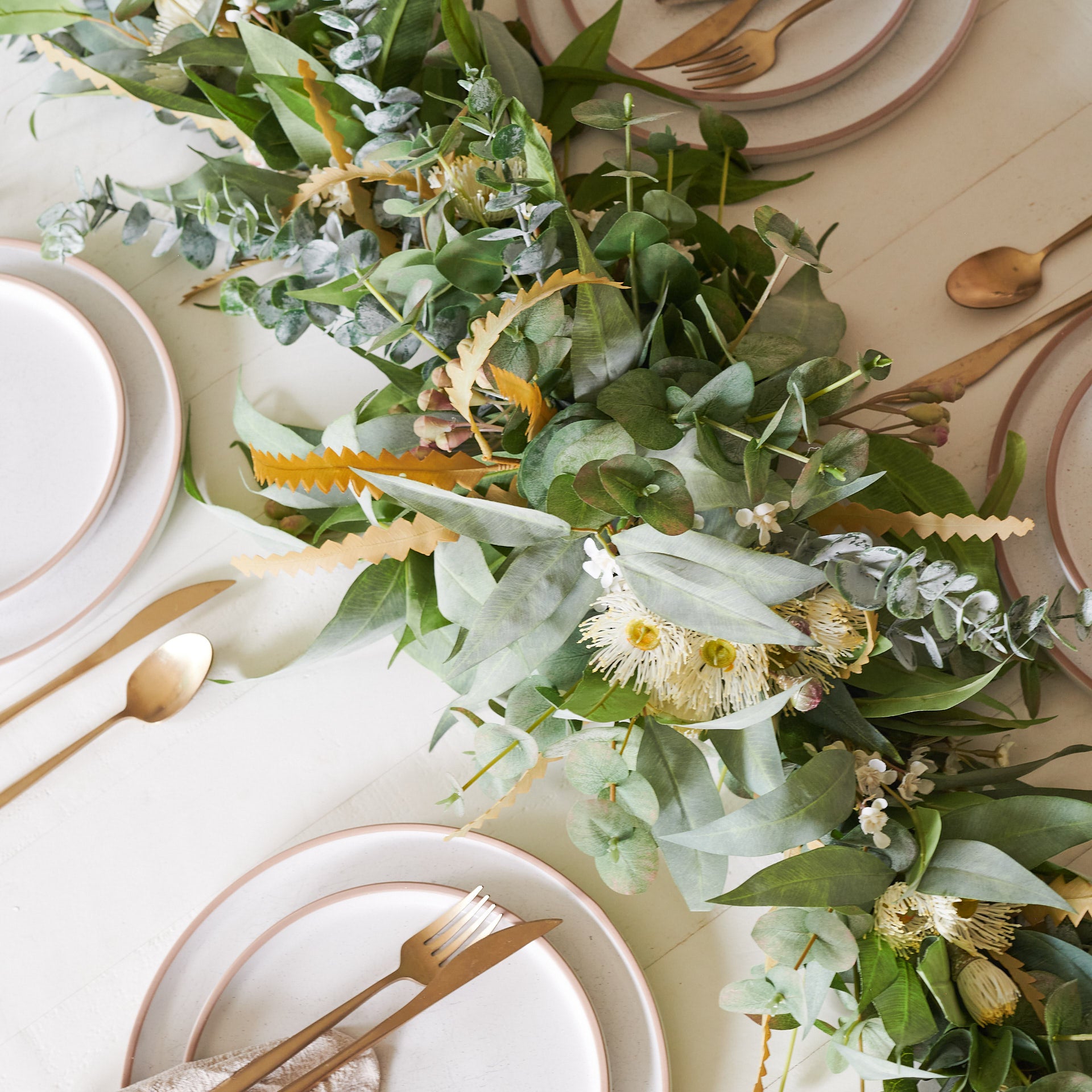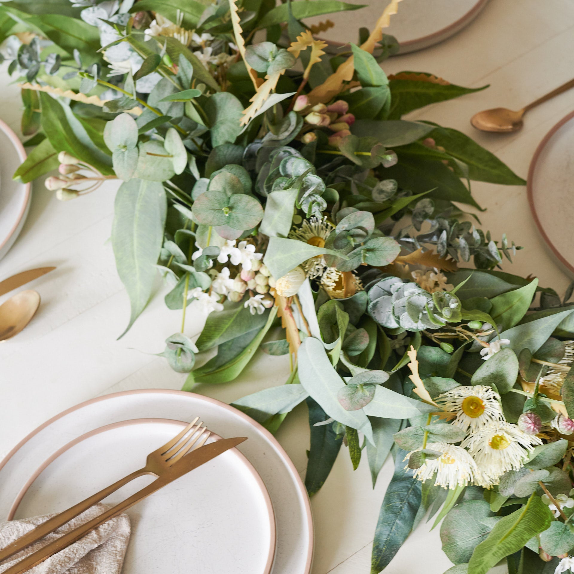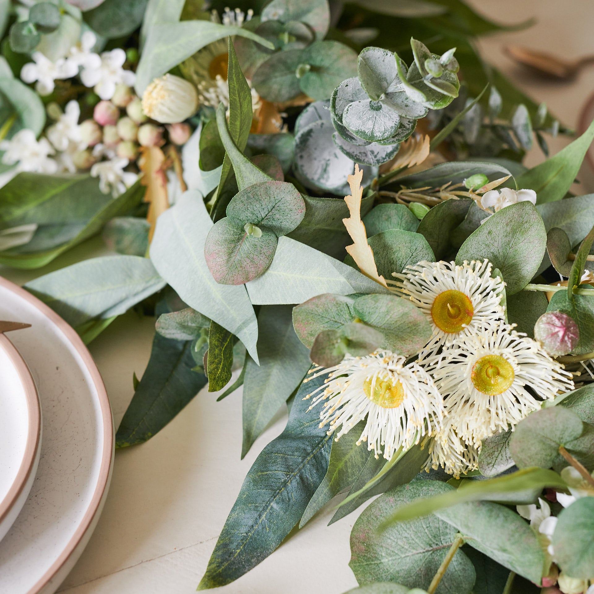 A real touch Australian native garland, perfect for a table and featuring real touch eucalyptus, seed and gum, banksia leaf, blossom, wax flower and spinning gum.