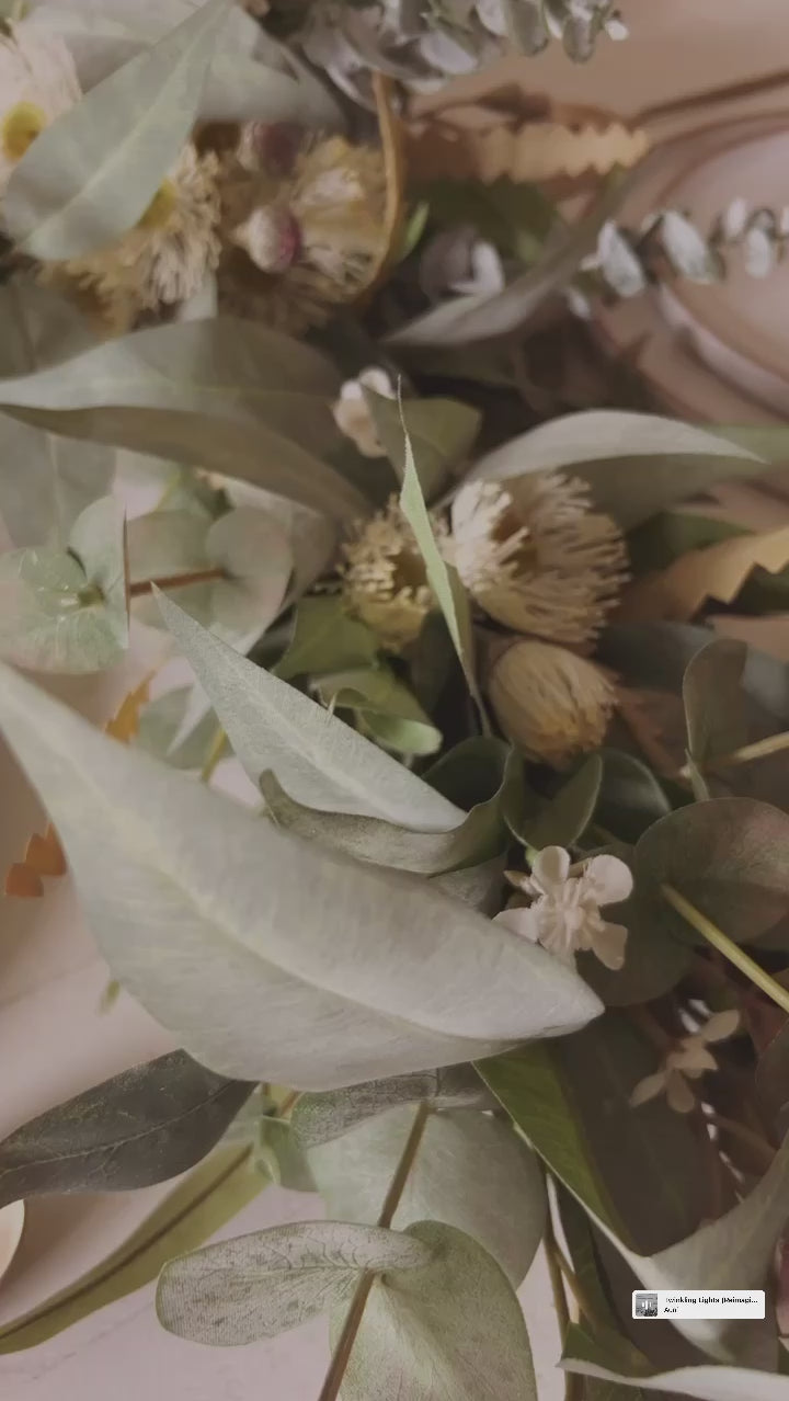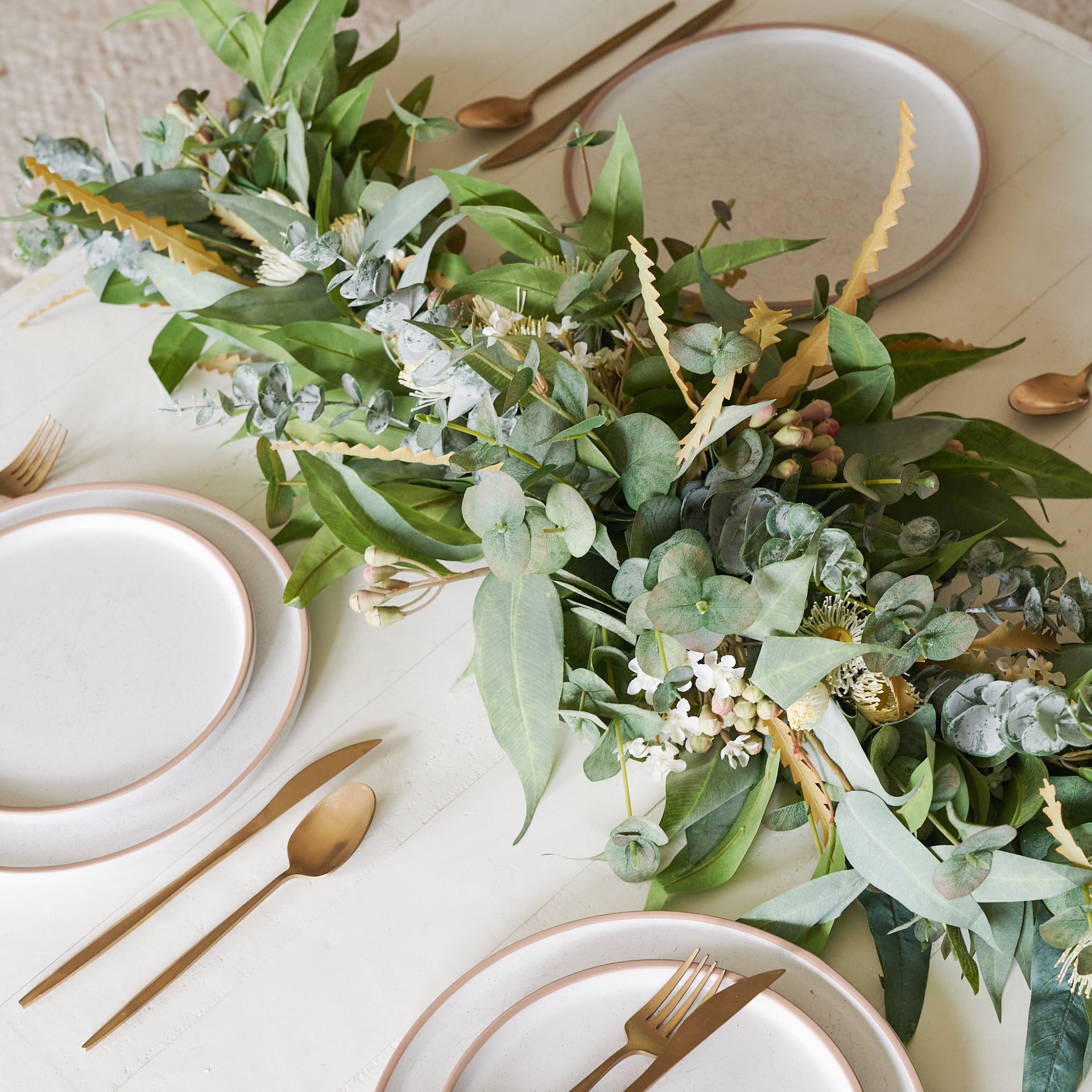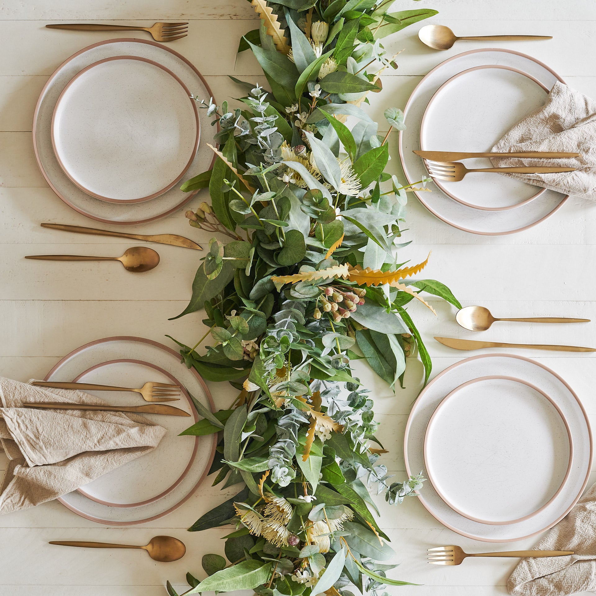 A real touch Australian native garland, perfect for a table and featuring real touch eucalyptus, seed and gum, banksia leaf, blossom, wax flower and spinning gum.