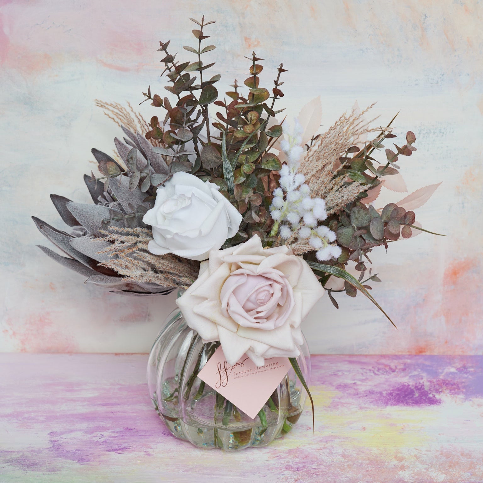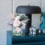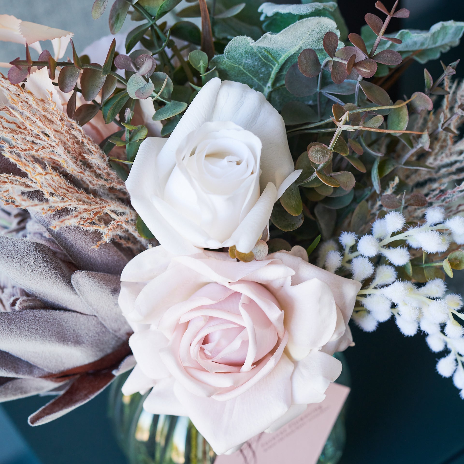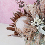 Real Touch Roses, King and Queen Proteas, Berry, Mini Gum Eucalyptus Spray, Reed Grass Spray and Camellia Leaf Spray in Striped Fishbowl Vase and Artificial Water.