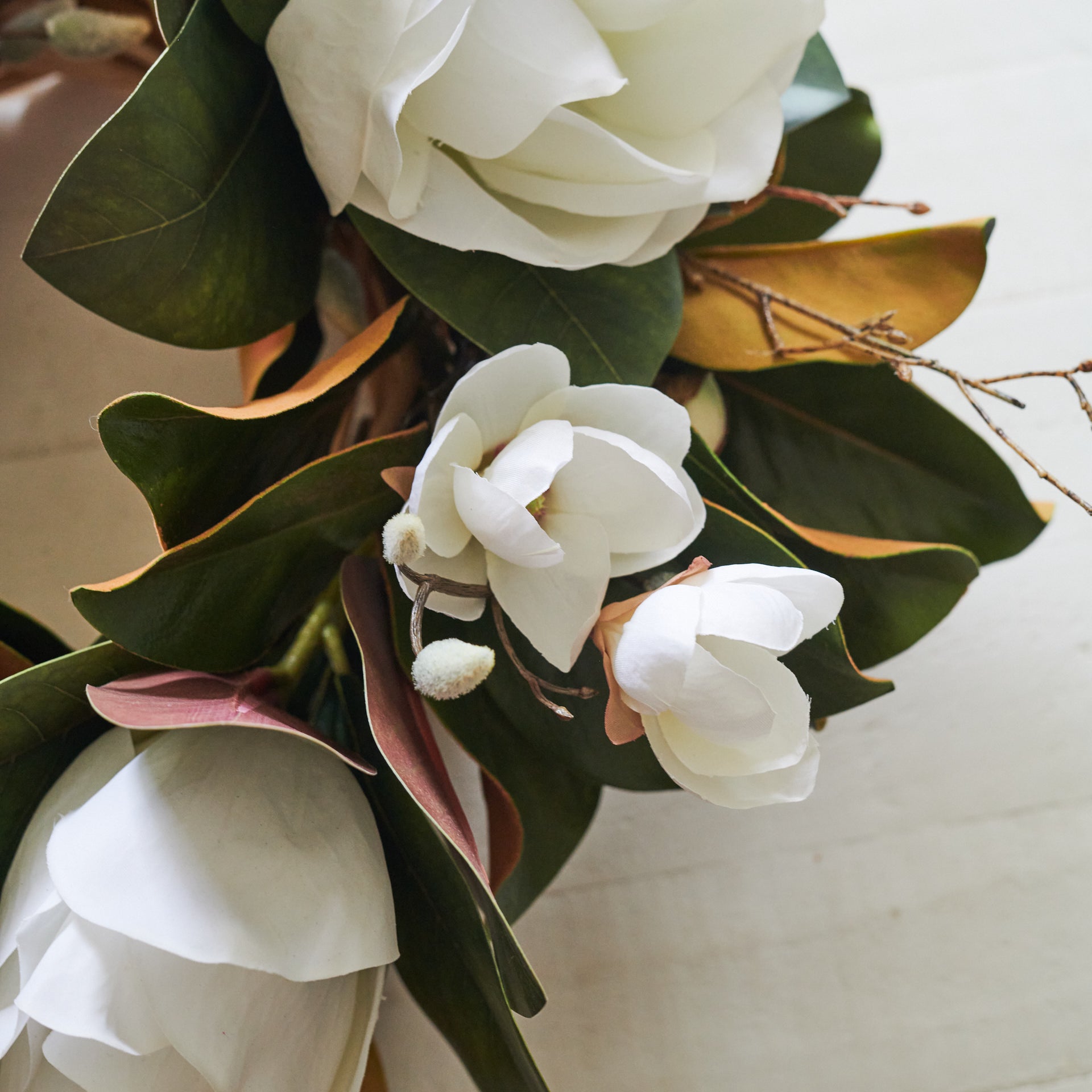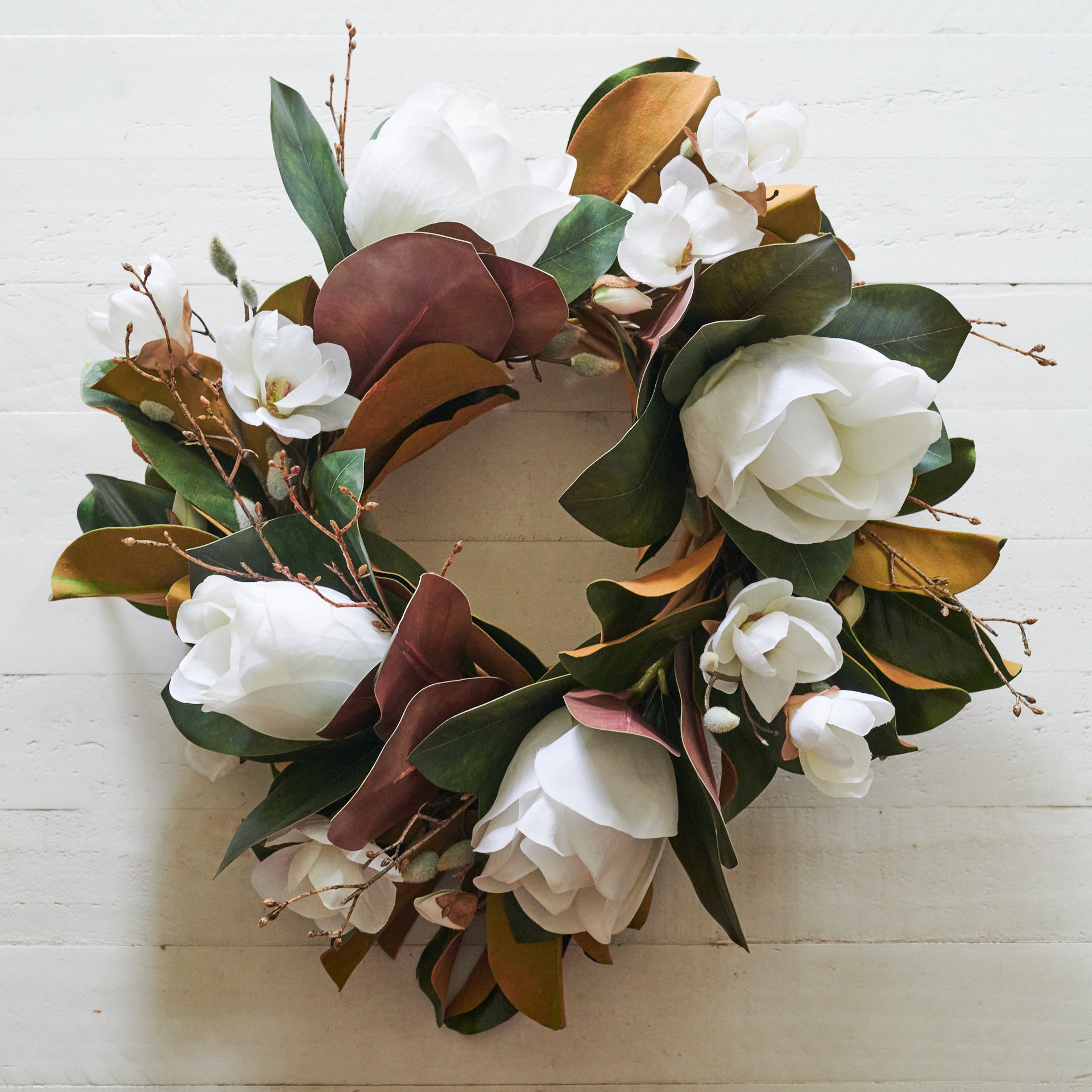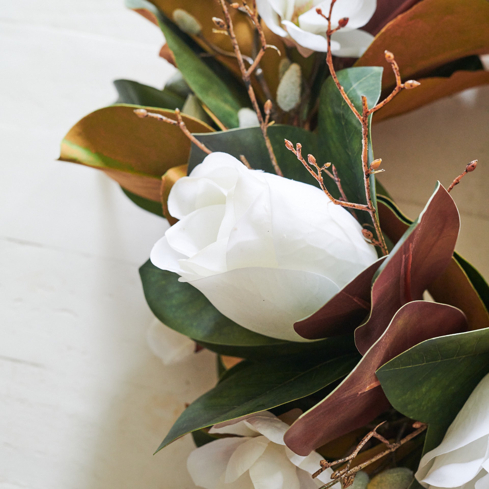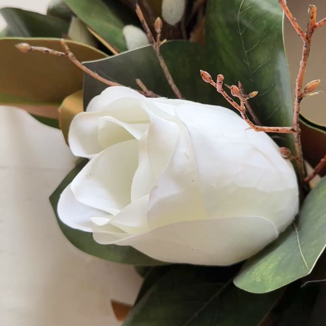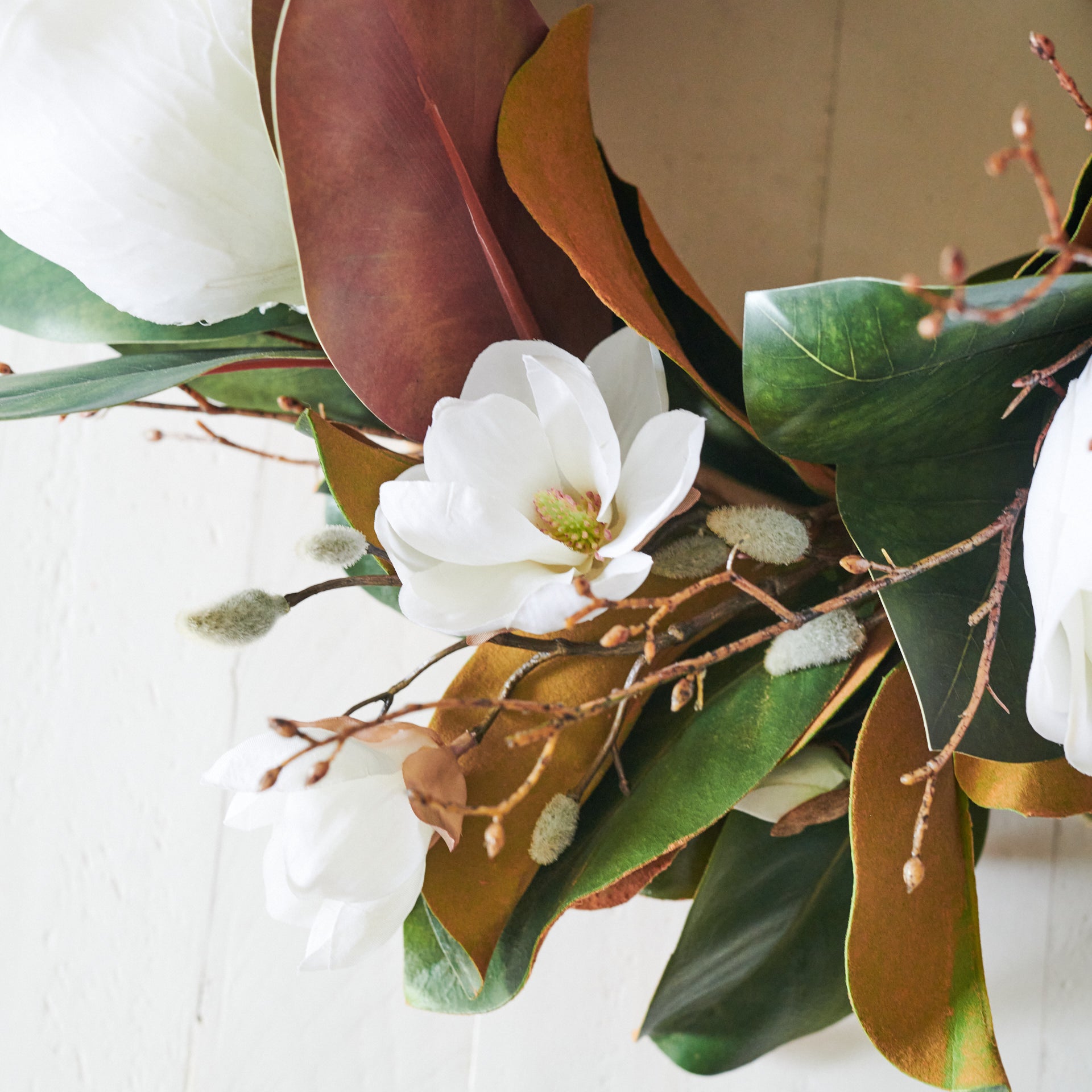 Handmade Wreath featuring real touch magnolias with willow sticks and magnolia foliage.