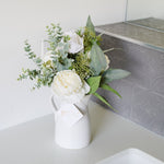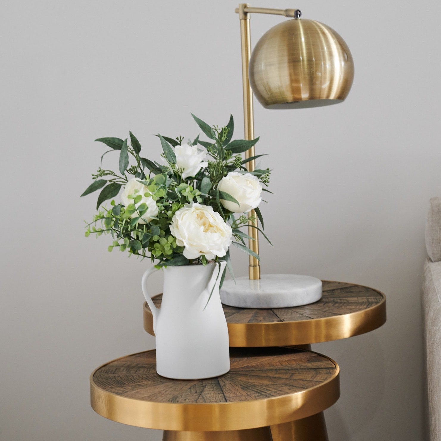 Real Touch Artificial Eucalyptus Seed Leaf, Mini Gum Eucalyptus Seed Leaf, Peonies and Roses in Matt White Ceramic Jug