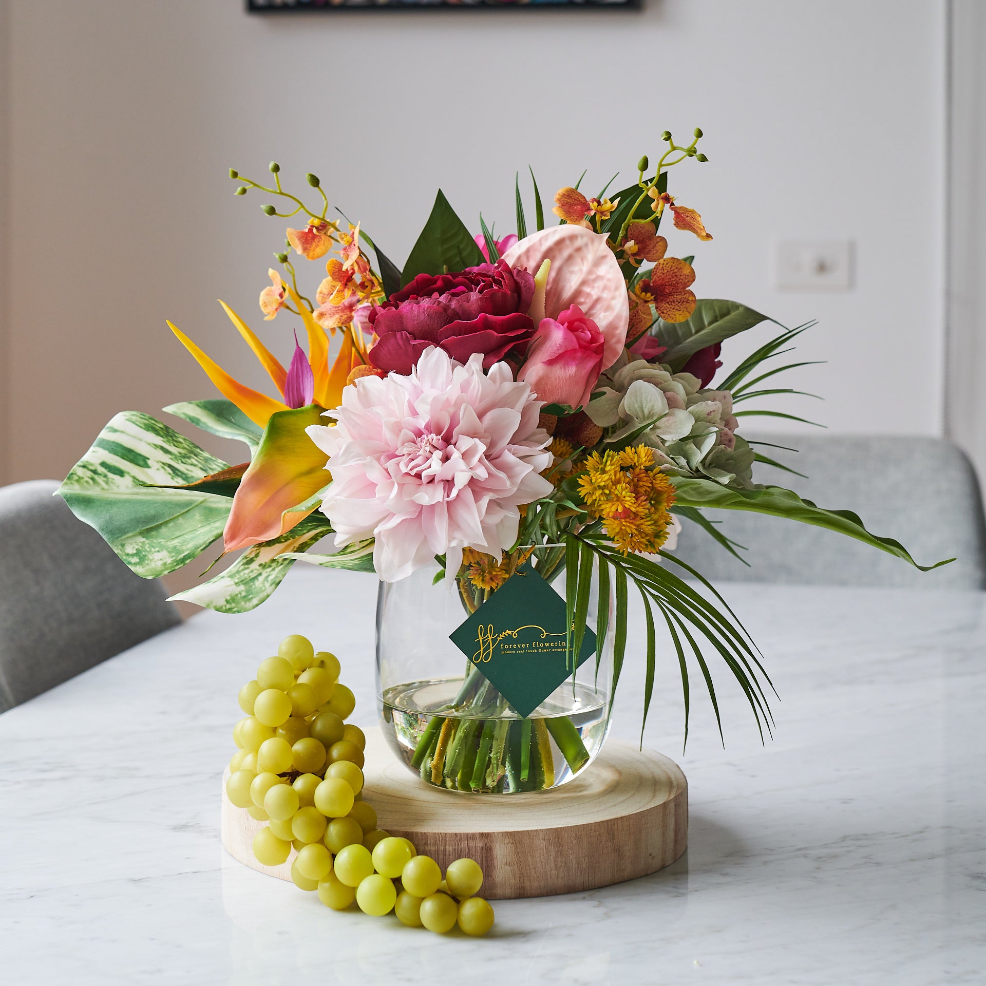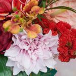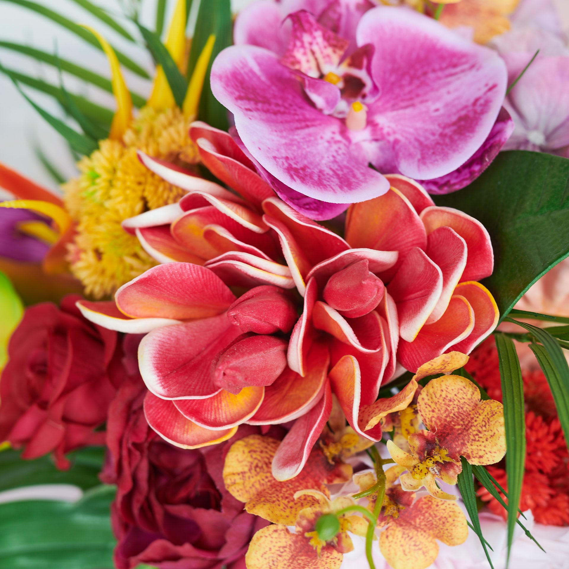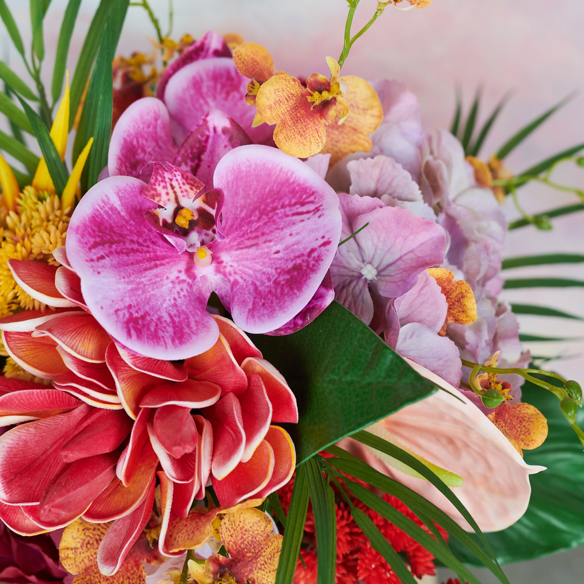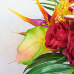 This beautifully colourful arrangement is floral dense and features real touch frangipani, calla lily, monstera and calla leaves, phoenix palm, red sedum, dancing orchids, hydrangea, dahlia's and roses.