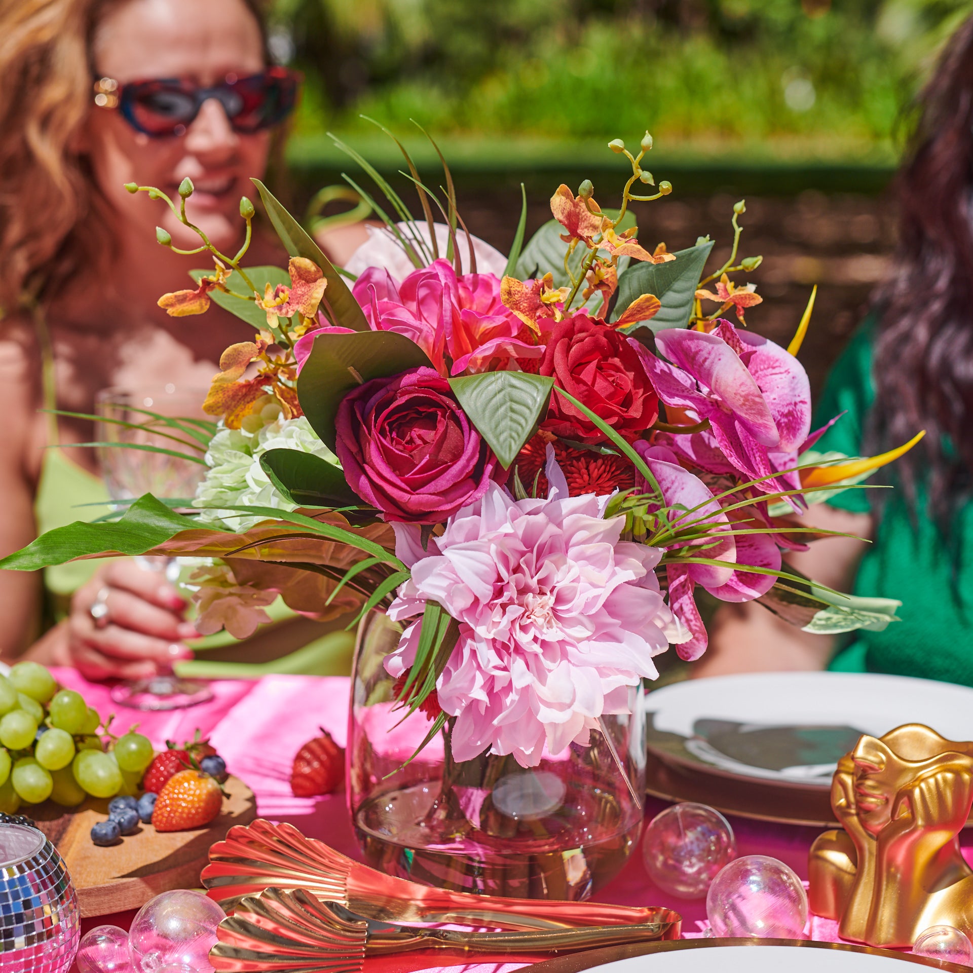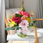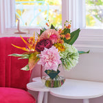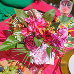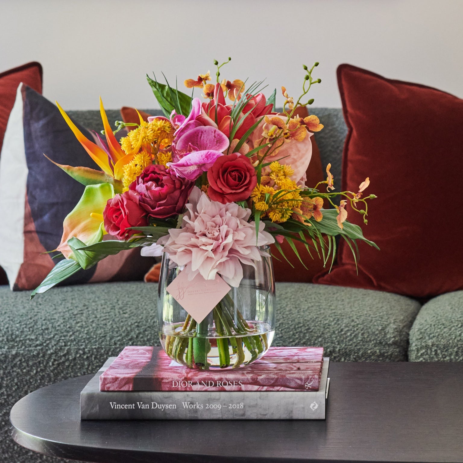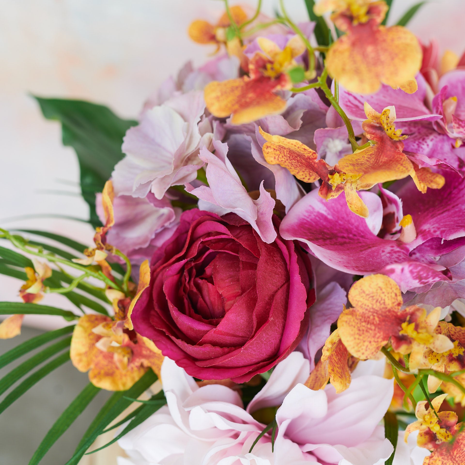 This beautifully colourful arrangement is floral dense and features real touch frangipani, calla lily, monstera and calla leaves, phoenix palm, red sedum, dancing orchids, hydrangea, dahlia's and roses.