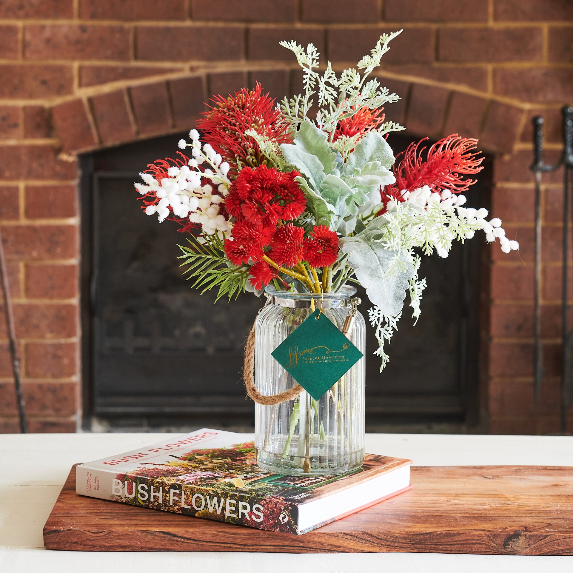 Real Touch Grevillea Spray, Sedum and Dusty Miller with Wattle and Banksia in a Ribbed Glass Vase and artificial water.