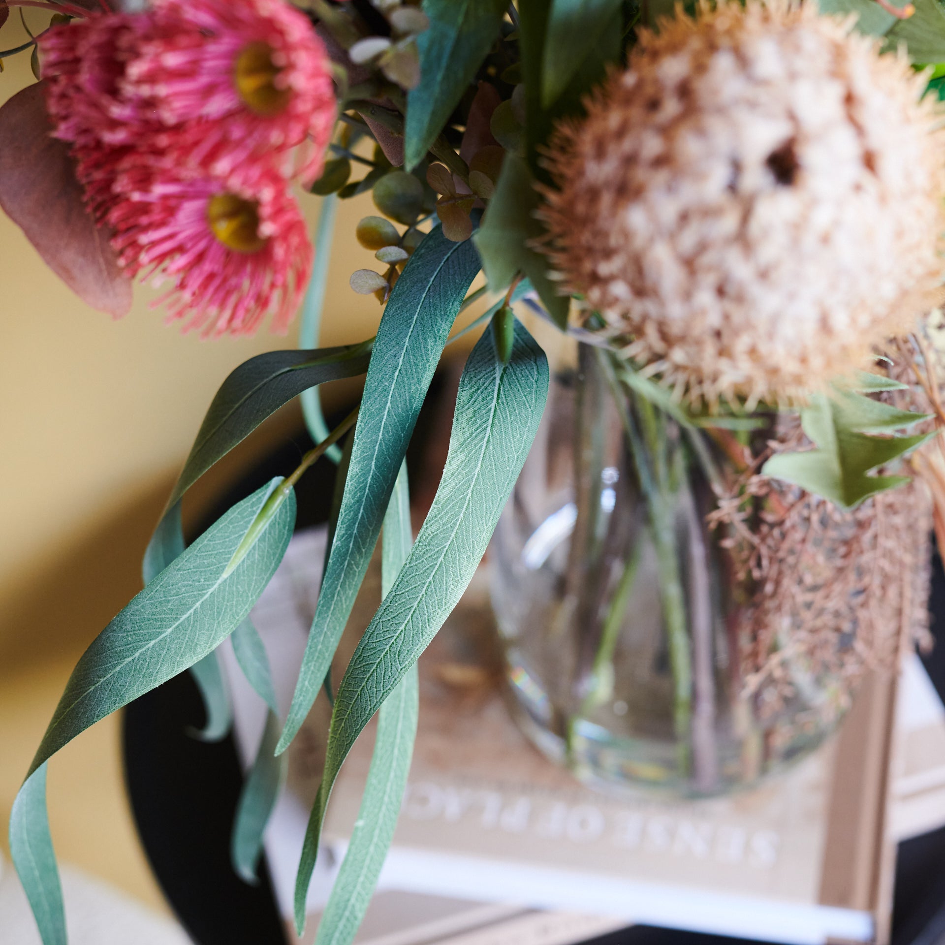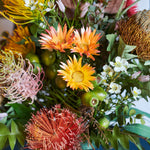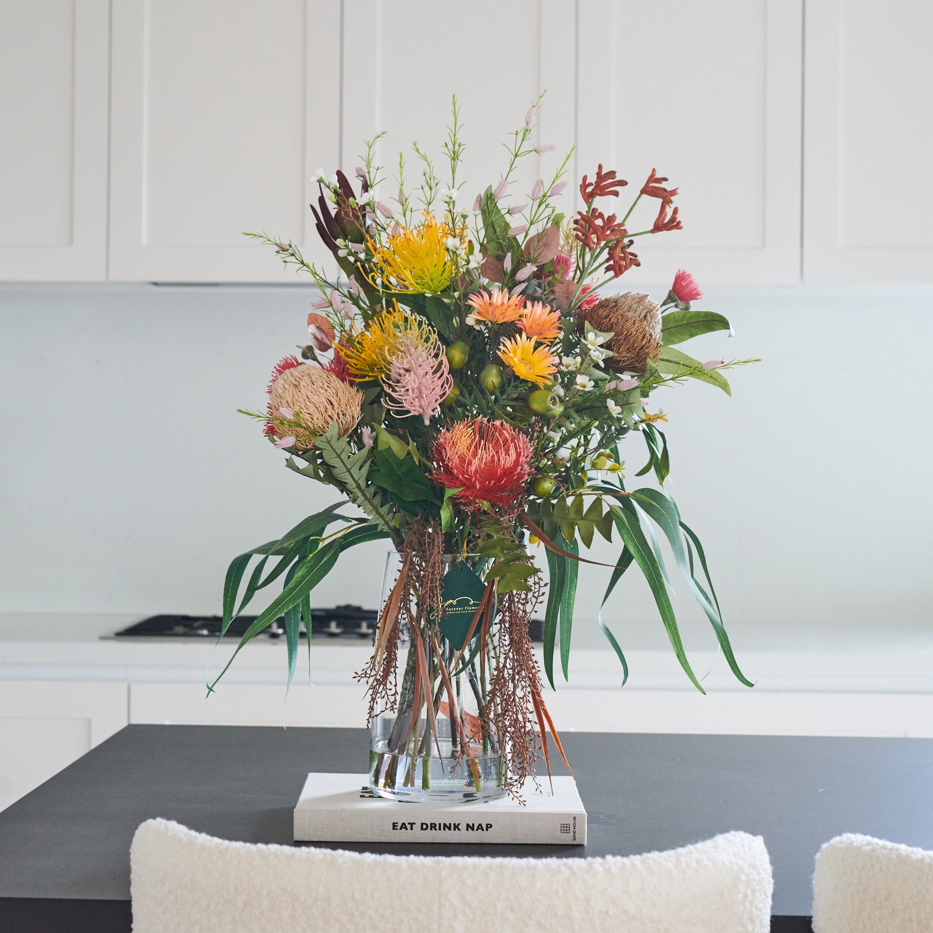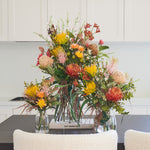 Outback : Australian Native Eucalyptus and Long Leaf, with Banksia's, Grevillea, Kangaroo Paw and Leucadendron, Wax and Kaaps Flowers Set in Glass Vase in Artificial Water.