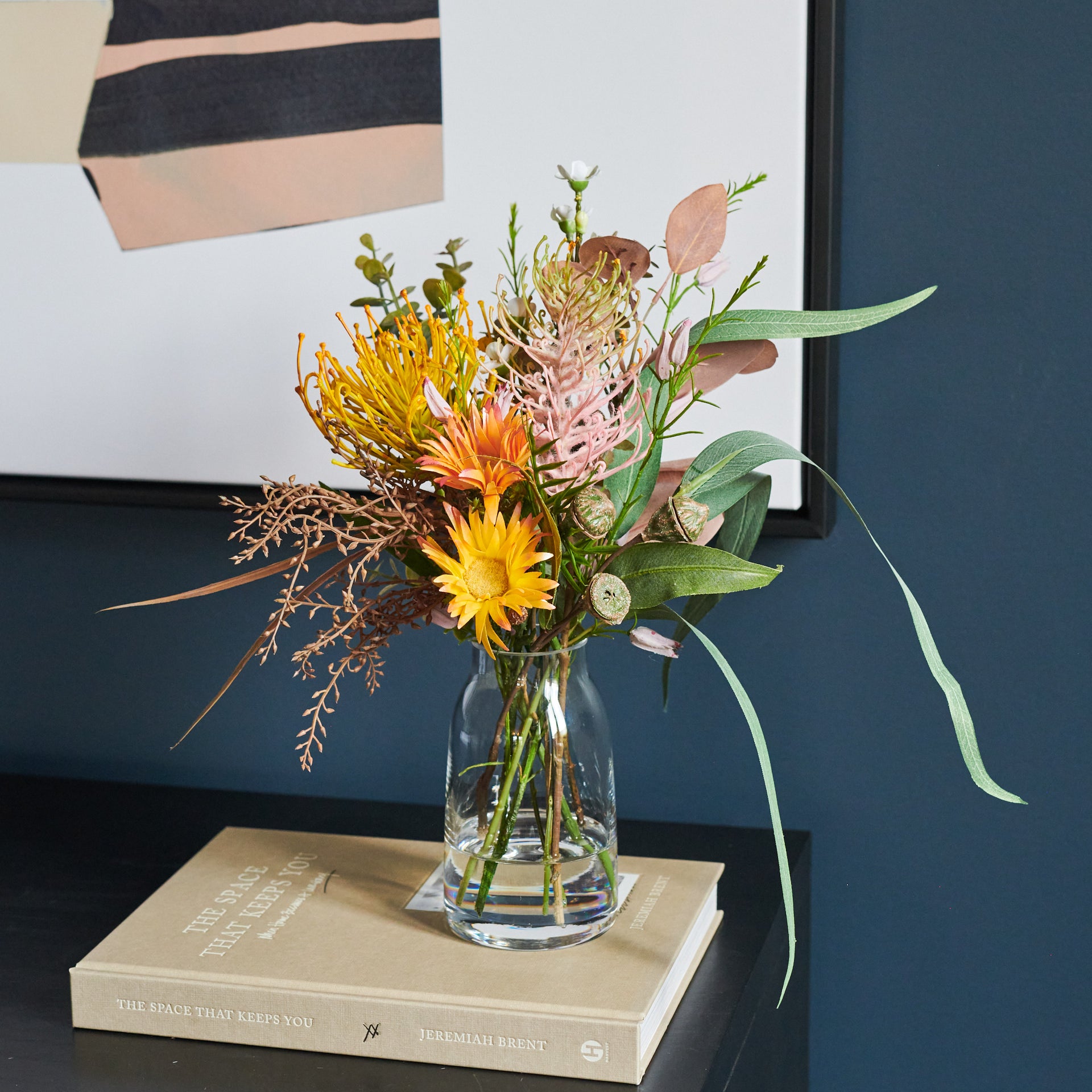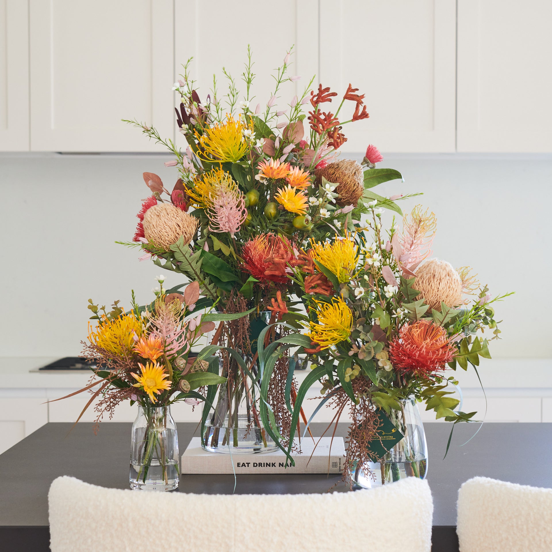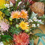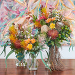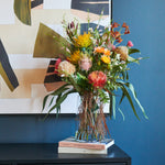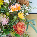 Queensland : A textured bouquet of Australian Natives including Banksia, Grevillea, Kangaroo Paw and Eucalyptus with Wax Flower set in Glass Vase in Artificial Water.