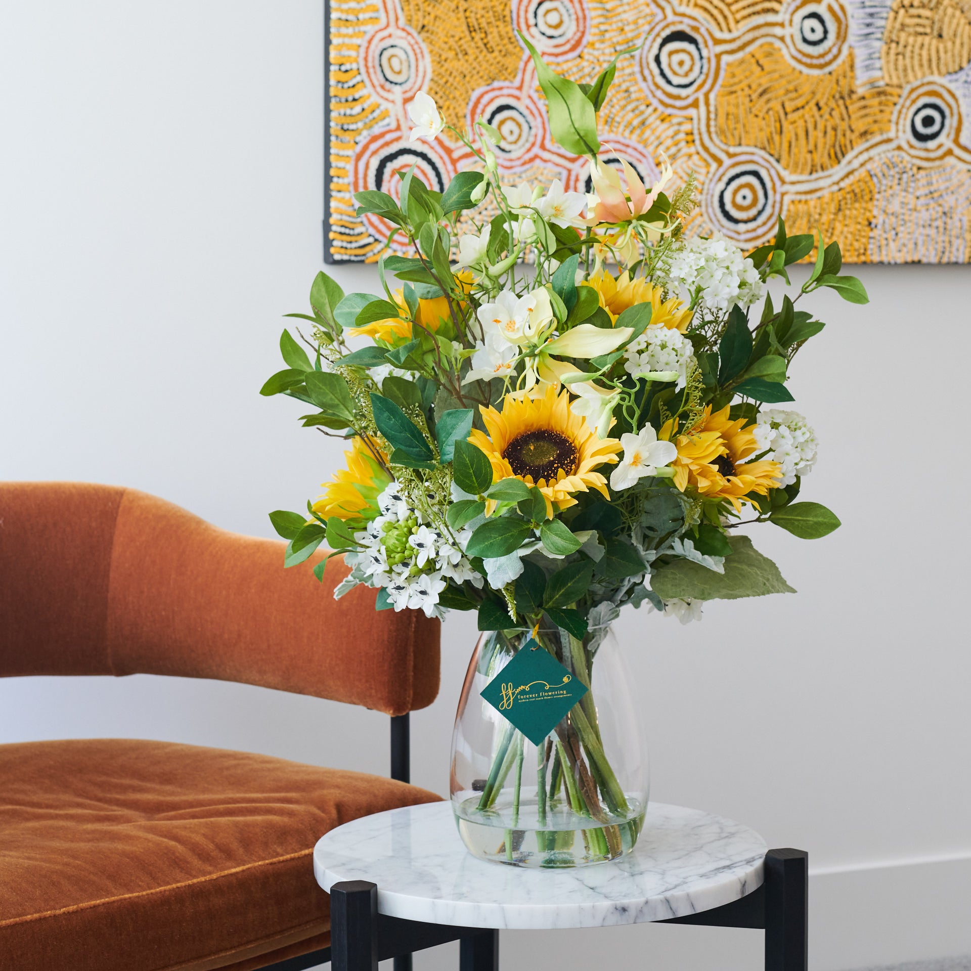 A beautiful bouquet of real touch sunflowers and star flower, grevillea and delphinium, with limonium and dusty miller, set in artificial water in a belly shaped vase.