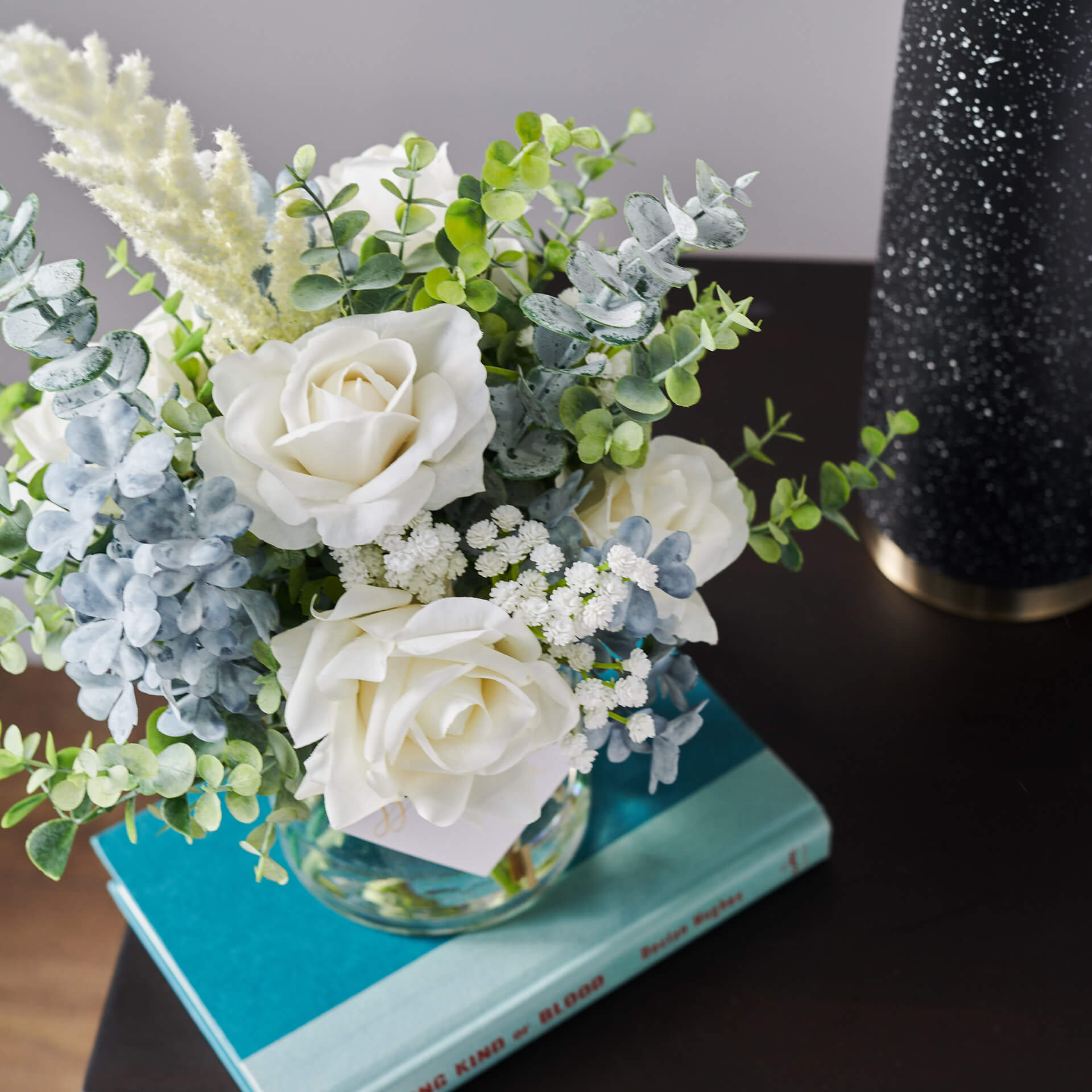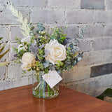 Real Touch Clover Spray, Spinning Gum Leaf, Astilbe, Mini Gum Eucalyptus Spray, Roses, Babys Breath and Dusty Miller in a Cylinder Vase and Artificial Water. This is a 360 degree arrangement.