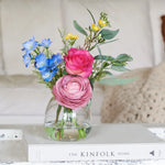 Lucy : Real touch early bloom rose, ranunculus and larkspur with wax flower and seeded eucalyptus set in a glass vase in artificial water.
