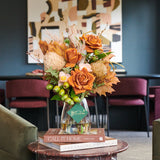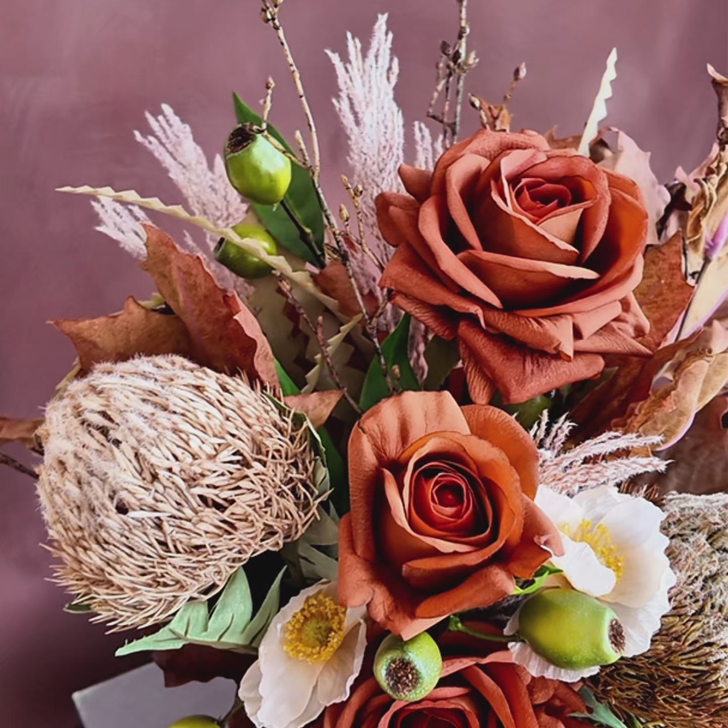 Real Touch Artificial Banksia, Roses and Poppies with Gum Nuts and Maple Autumn leaves. This arrangement is single sided.