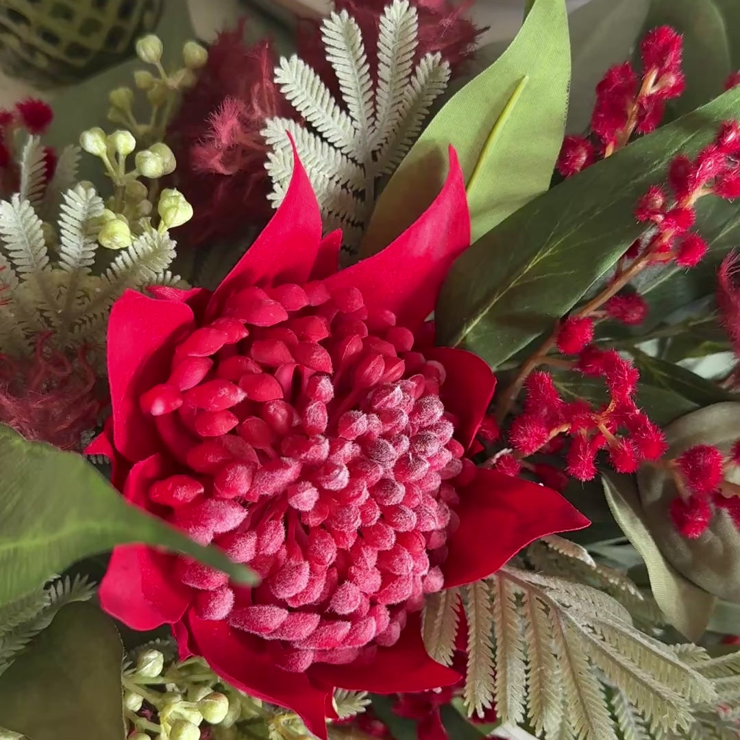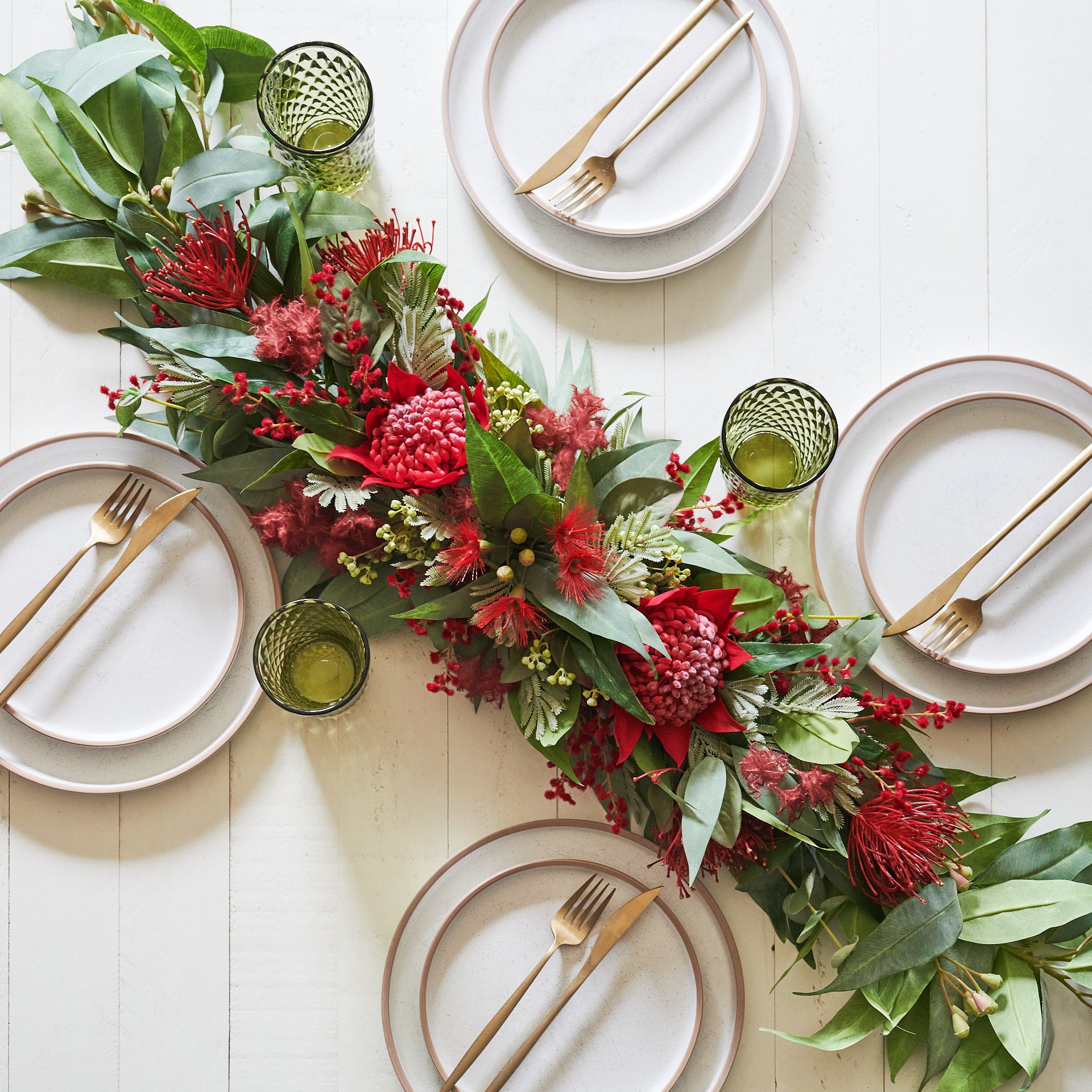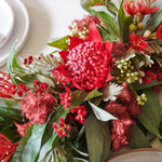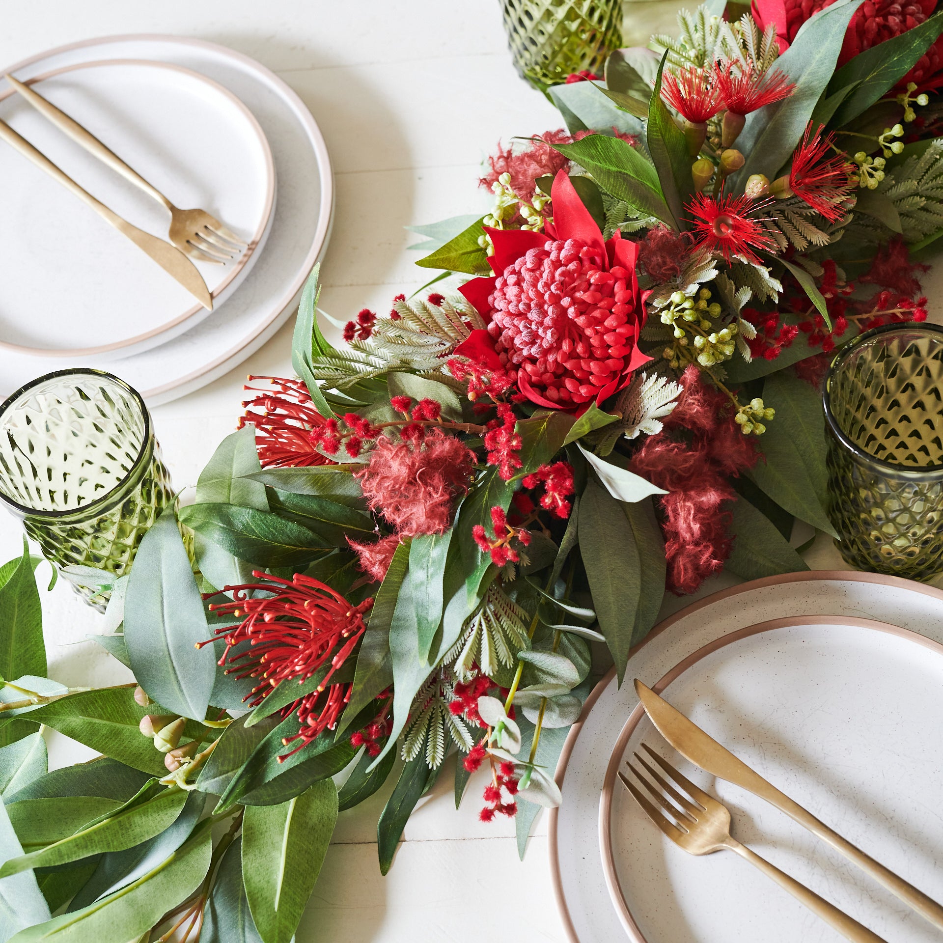 A real touch Australian native garland table runner, perfect for a table and featuring real touch eucalyptus, seeding berry and waratah, blossom, wattle and grevillea.