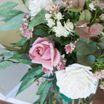Valerie - Real touch eucalyptus, dollar gum and pepper berry with astrantia, ranunculus and roses, set in artificial water in glass vase.