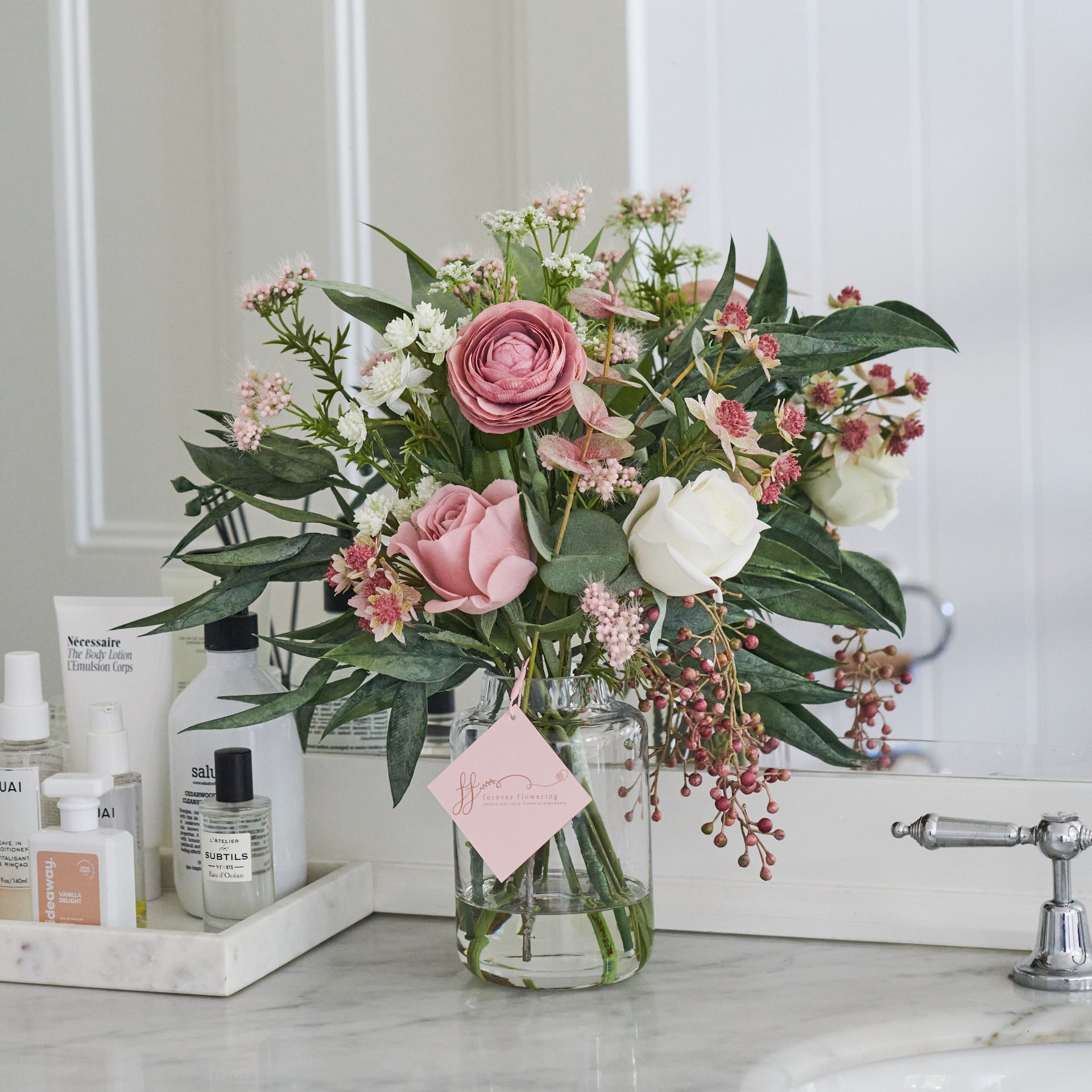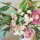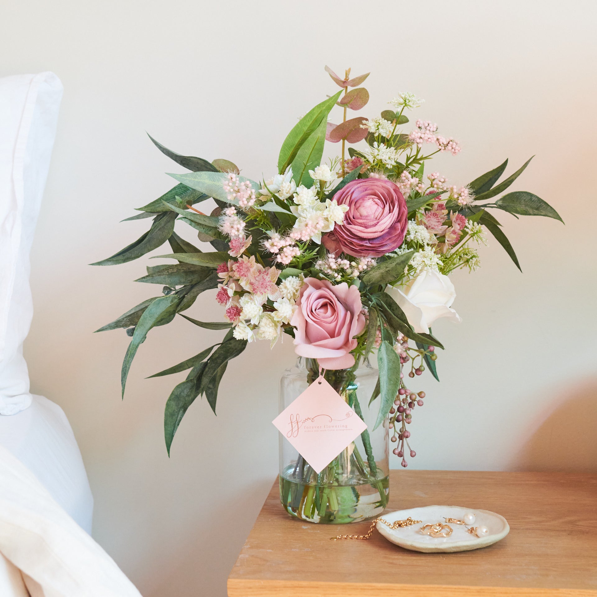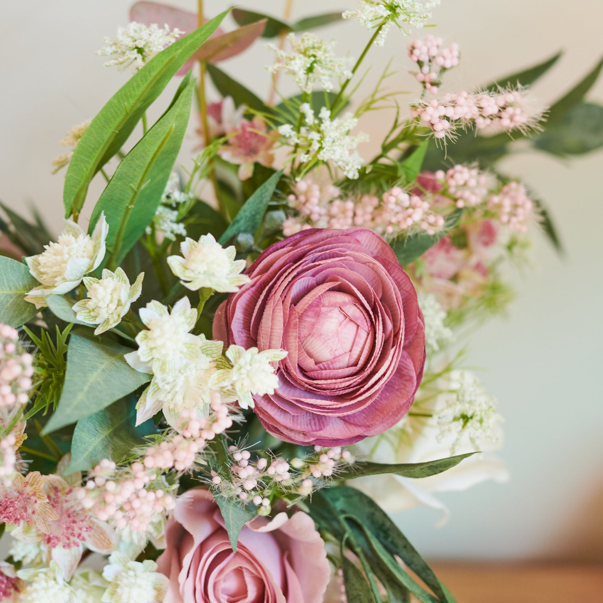 Real touch eucalyptus, dollar gum and pepper berry with astrantia, ranunculus and roses, set in artificial water in glass vase.