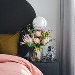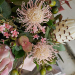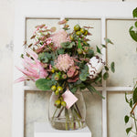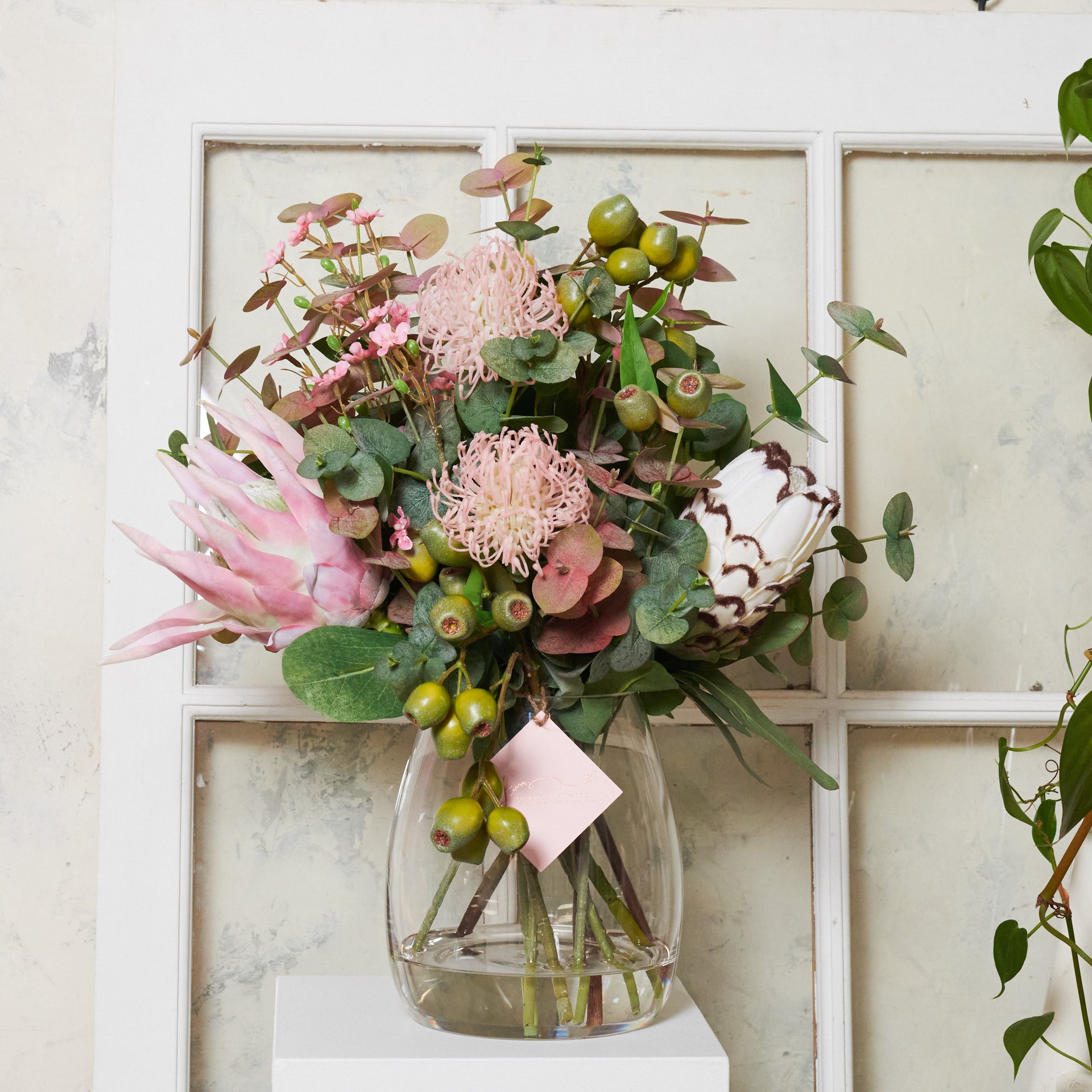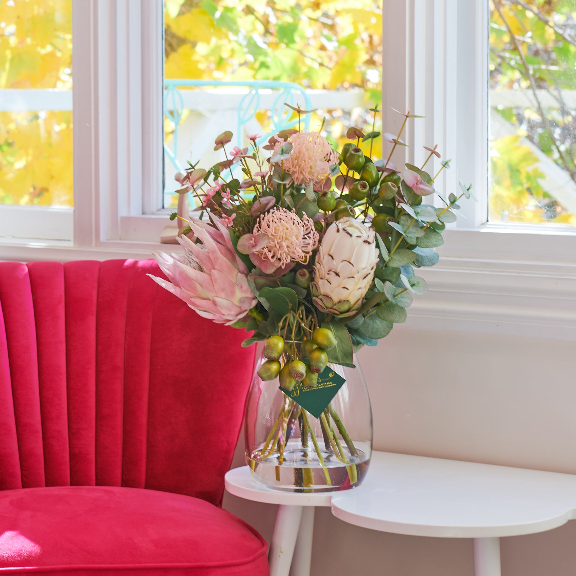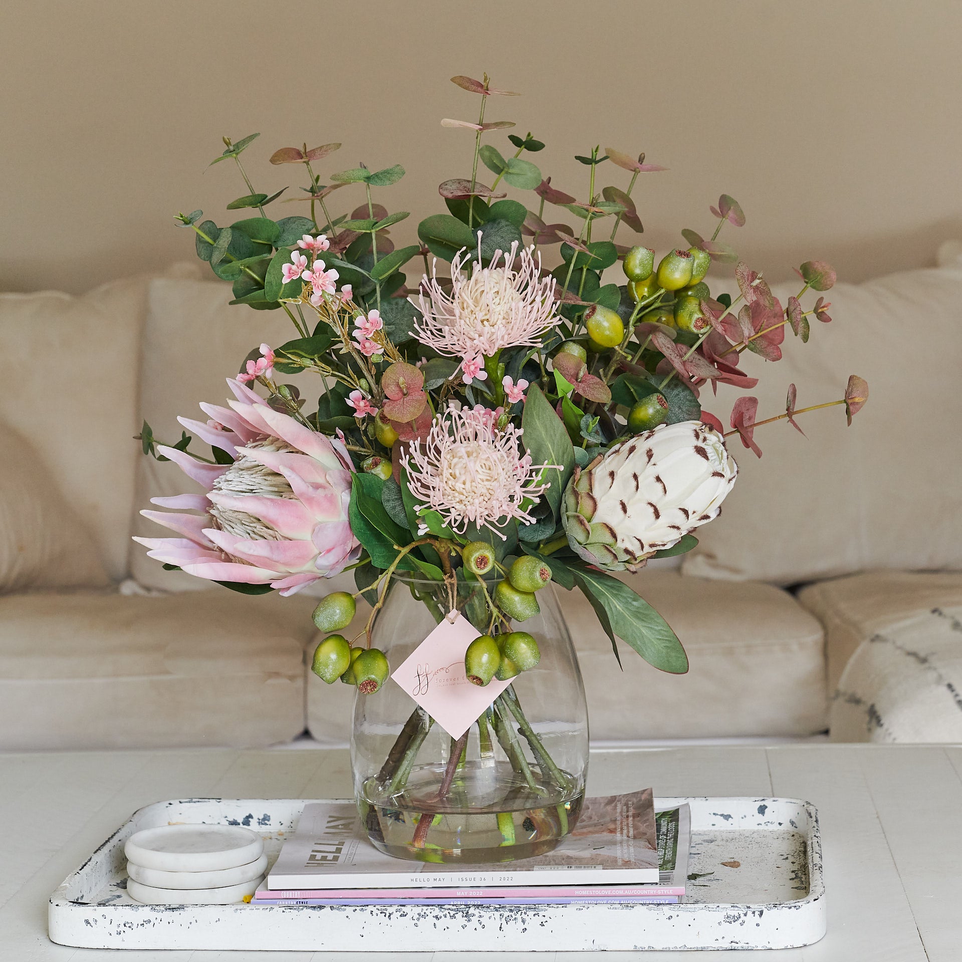 Real Touch Proteas, Gum Nuts, Eucalyptus Leaves, Feather Flower, Leucosperum and Flower spray in belly vase set in artificial water.