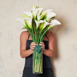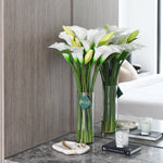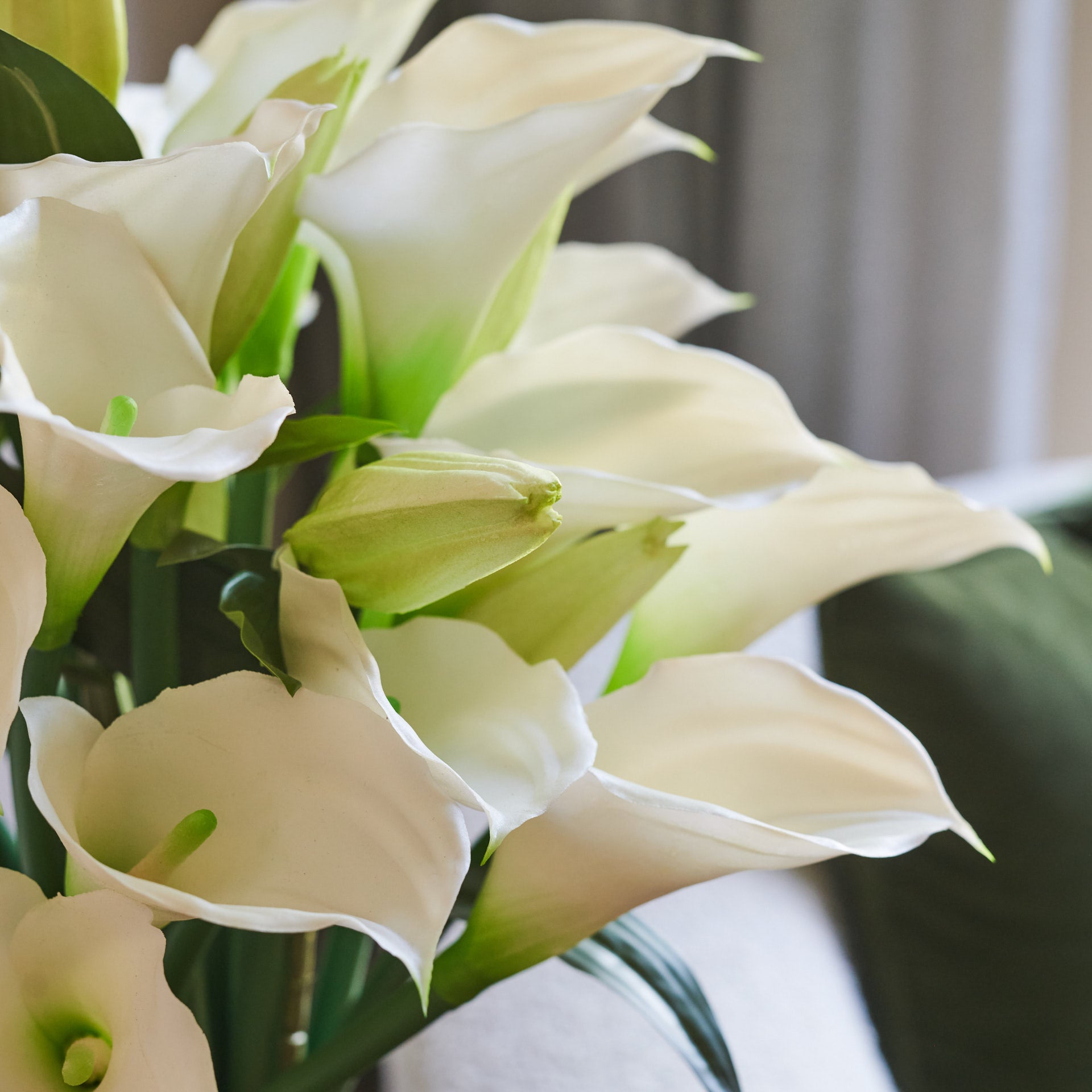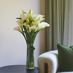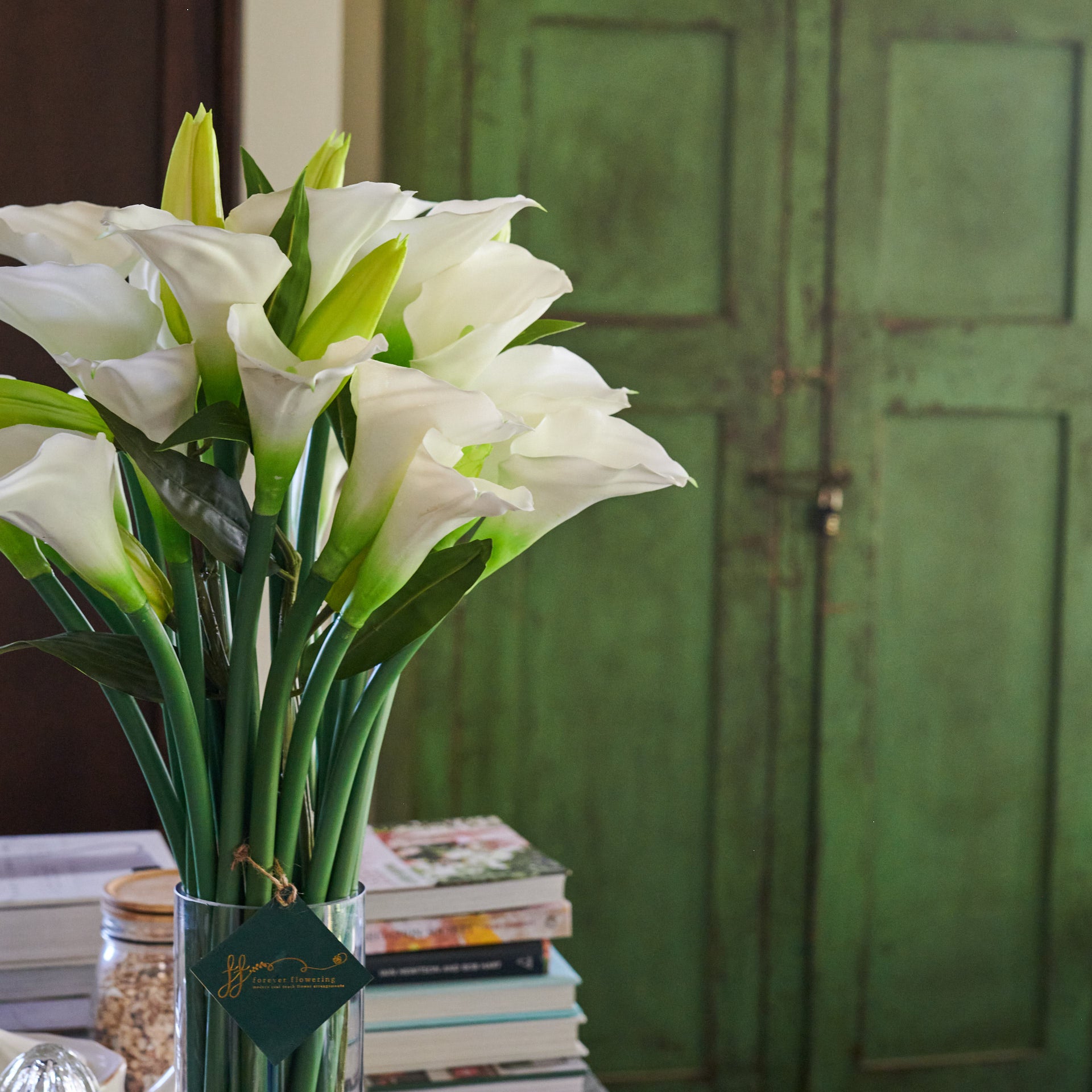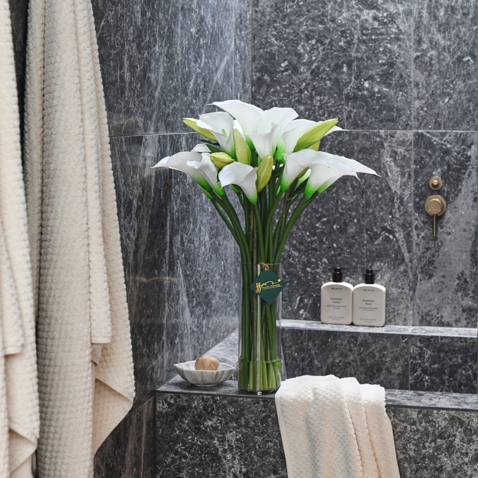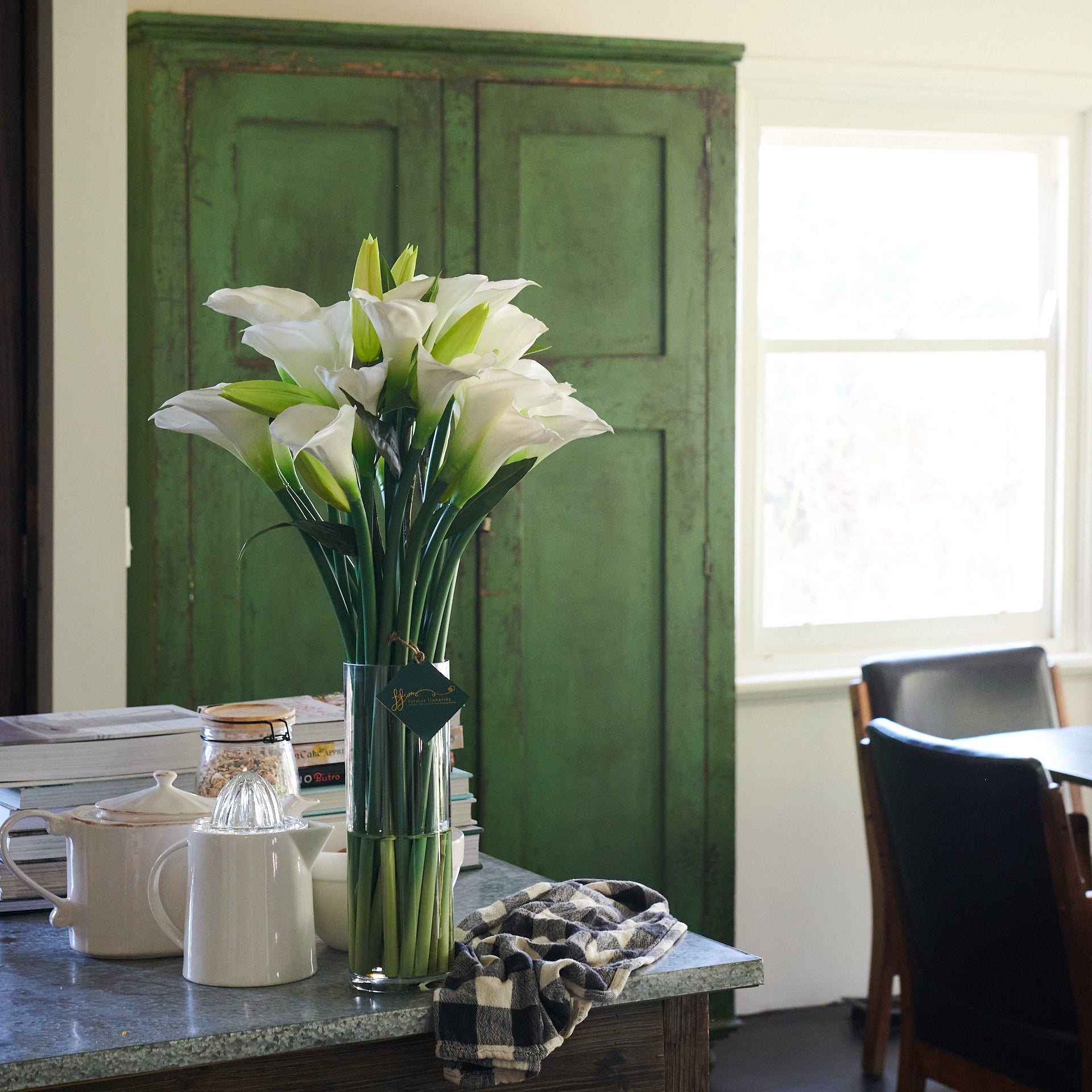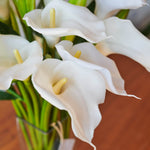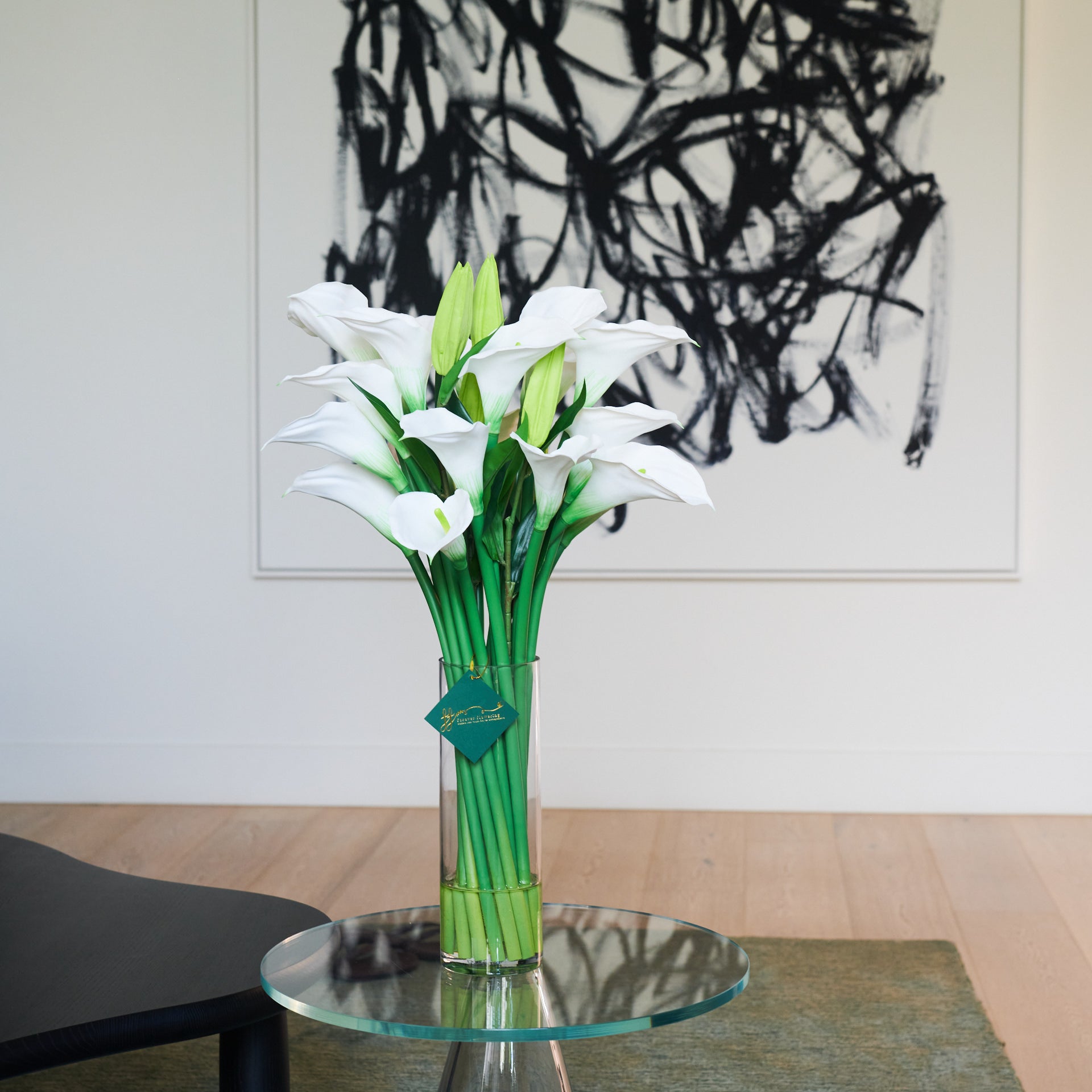Real Touch Calla Lillies mixed with buds in a cylinder vase set permanently in artificial water.