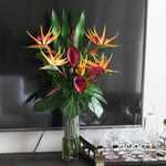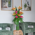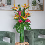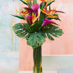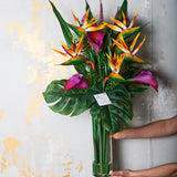 Real Touch Birds of Paradise and Calla Lilies, Fern Maiden Hair, Monstera and Sword Leaves in a cylinder vase permanently set in an artificial water.